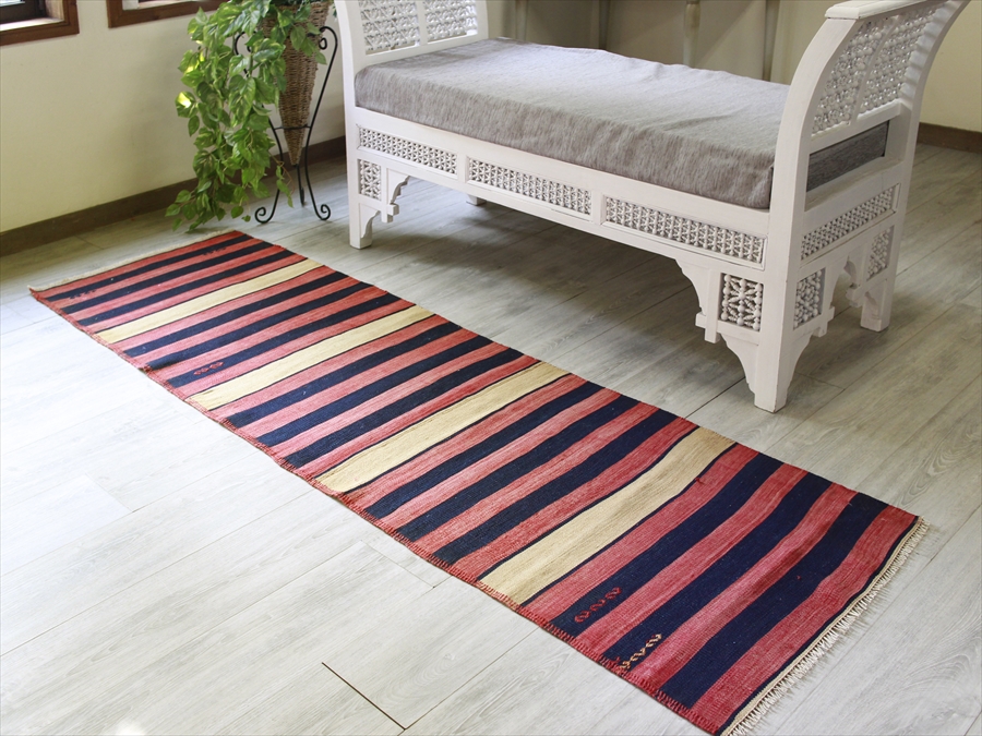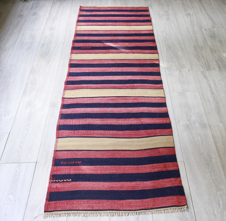 ローズがかった赤、ネイビーとも、日焼けによる色あせで落ち着いた色に変化しています。織り地は目が詰まって、やや厚手。大きさもありずっしりとした重量感のある伝統的な遊牧民のキリムといったイメージです。