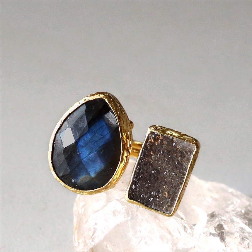 しずく型のスモーキーカラーの石とドゥルージーが二つ並んだリング。ドゥルージーとは、鍾乳洞のように内側が空洞化したものの結晶部分のみを採掘して、切削加工していない石のこと。光に当たるとキラキラと輝く美しい、角砂糖のようなフォルムの淡いグレーのドゥルージーと角度によってグレーや青味がかってみえるラブラドライトのリングです。