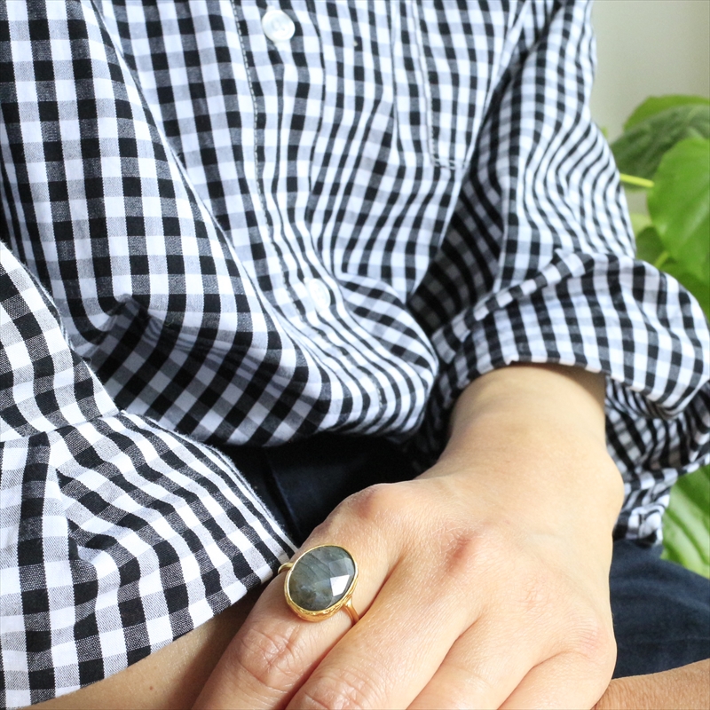 無骨なように見えて、洗練された印象にひとつひとつ手作りされたラブラドライトのオーバルリングです。フラットに近いローズカットが施された石が、大ぶりながらも上品な雰囲気に。華奢なアームとのバランスがよく、手元を美しく見せてくれます。