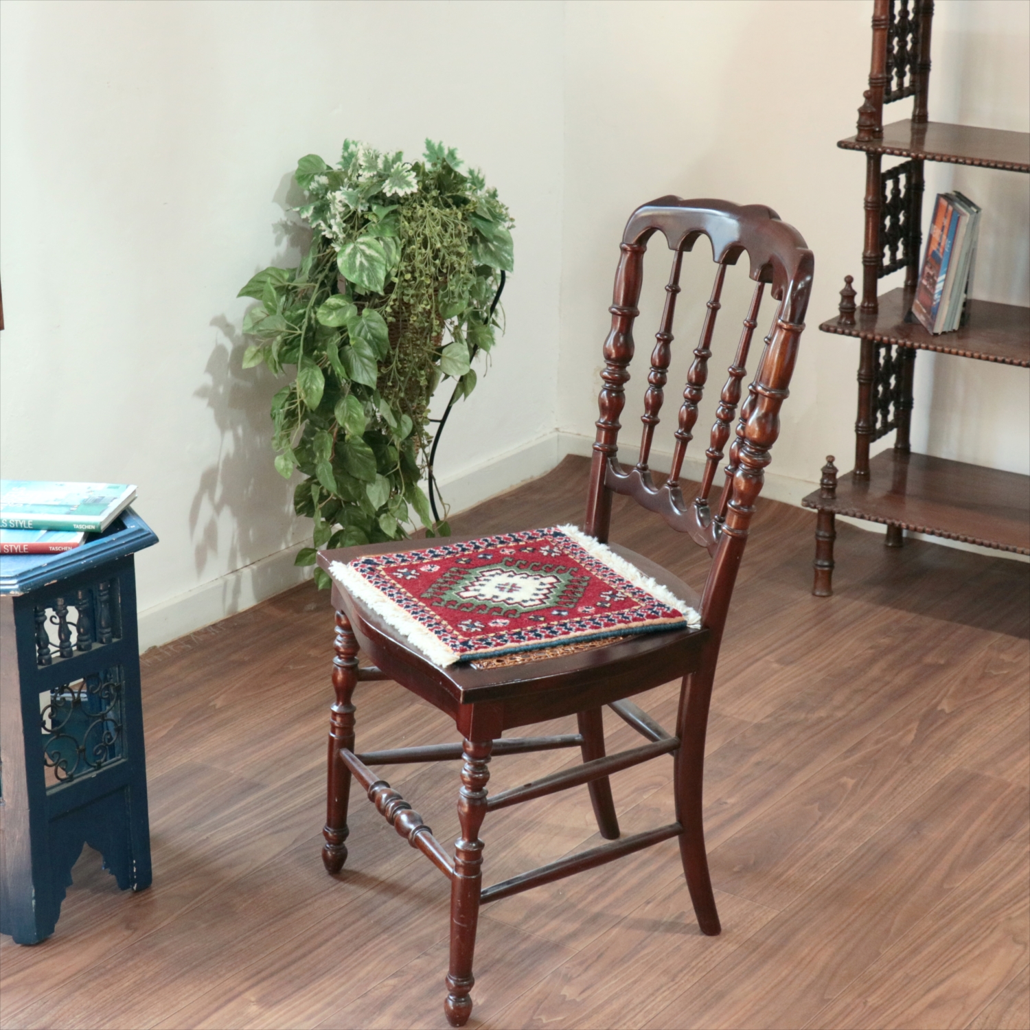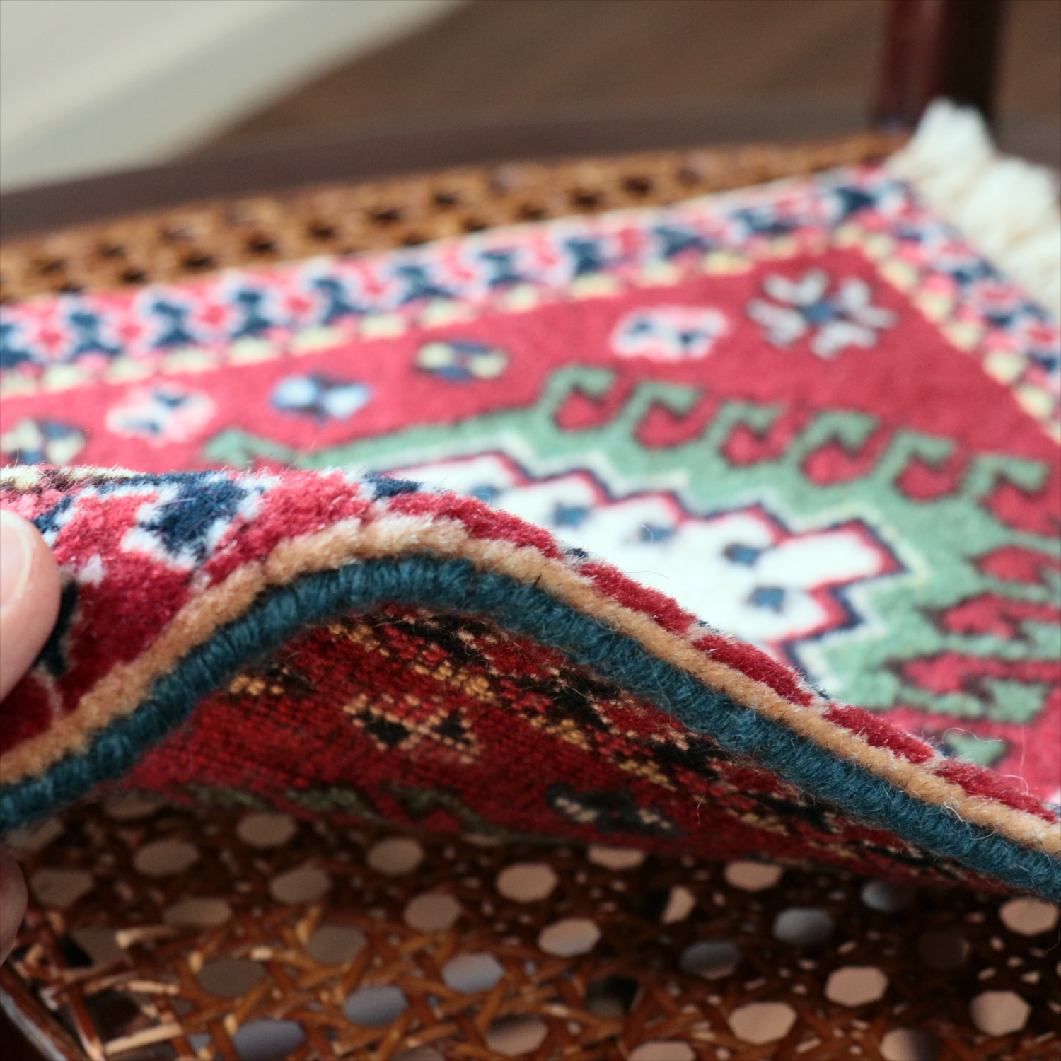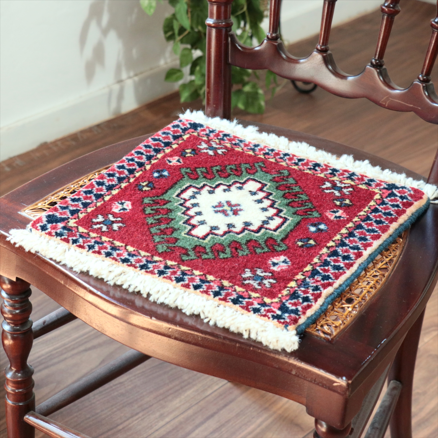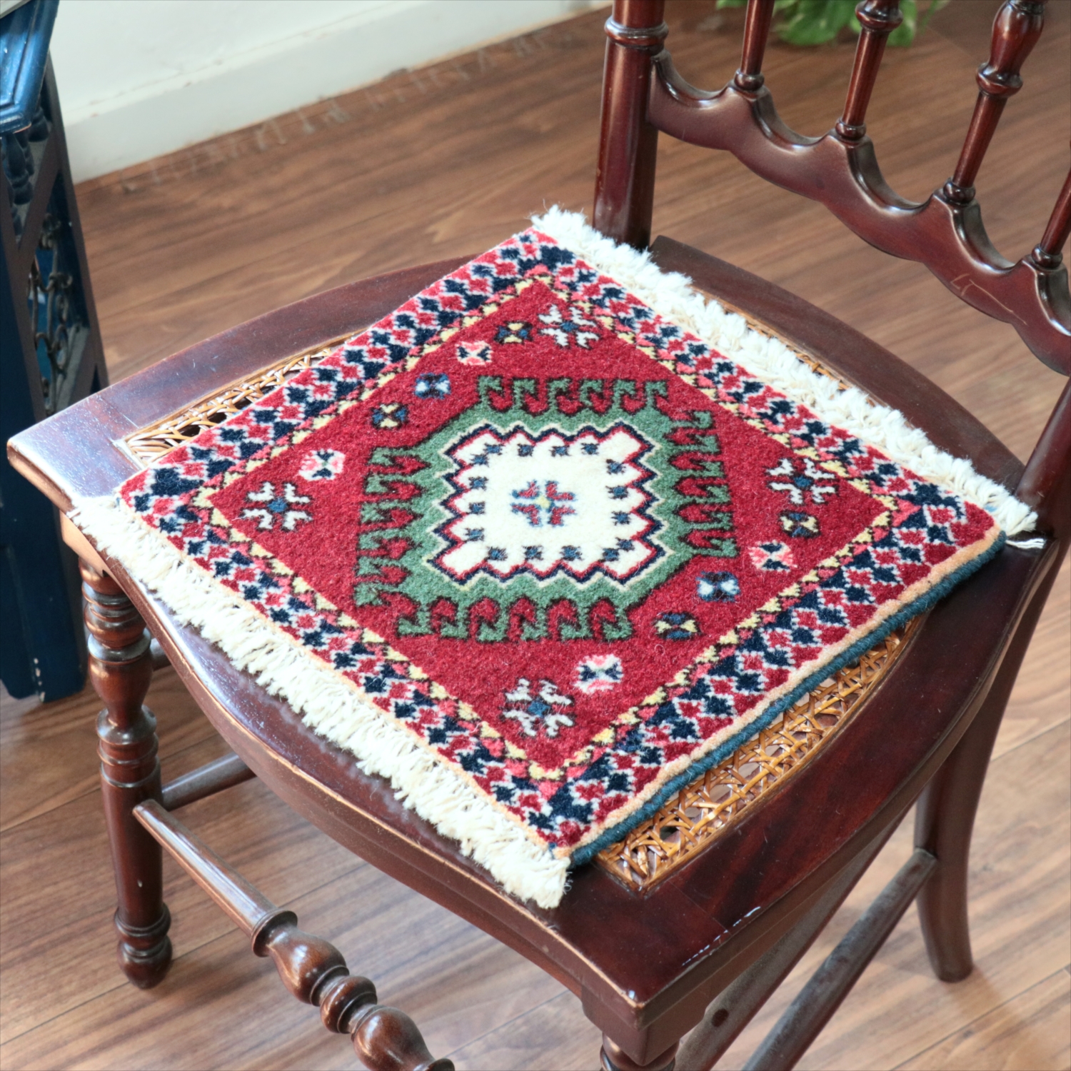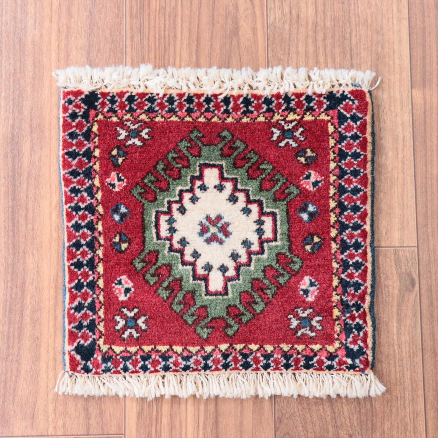 30cm角のミニサイズのラグ。小さいながらも、織りはしっかりしていて本格的です。多少ゆがみが気になりますが、ゆがみも含めて素朴な感じをお楽しみいただければと思います。