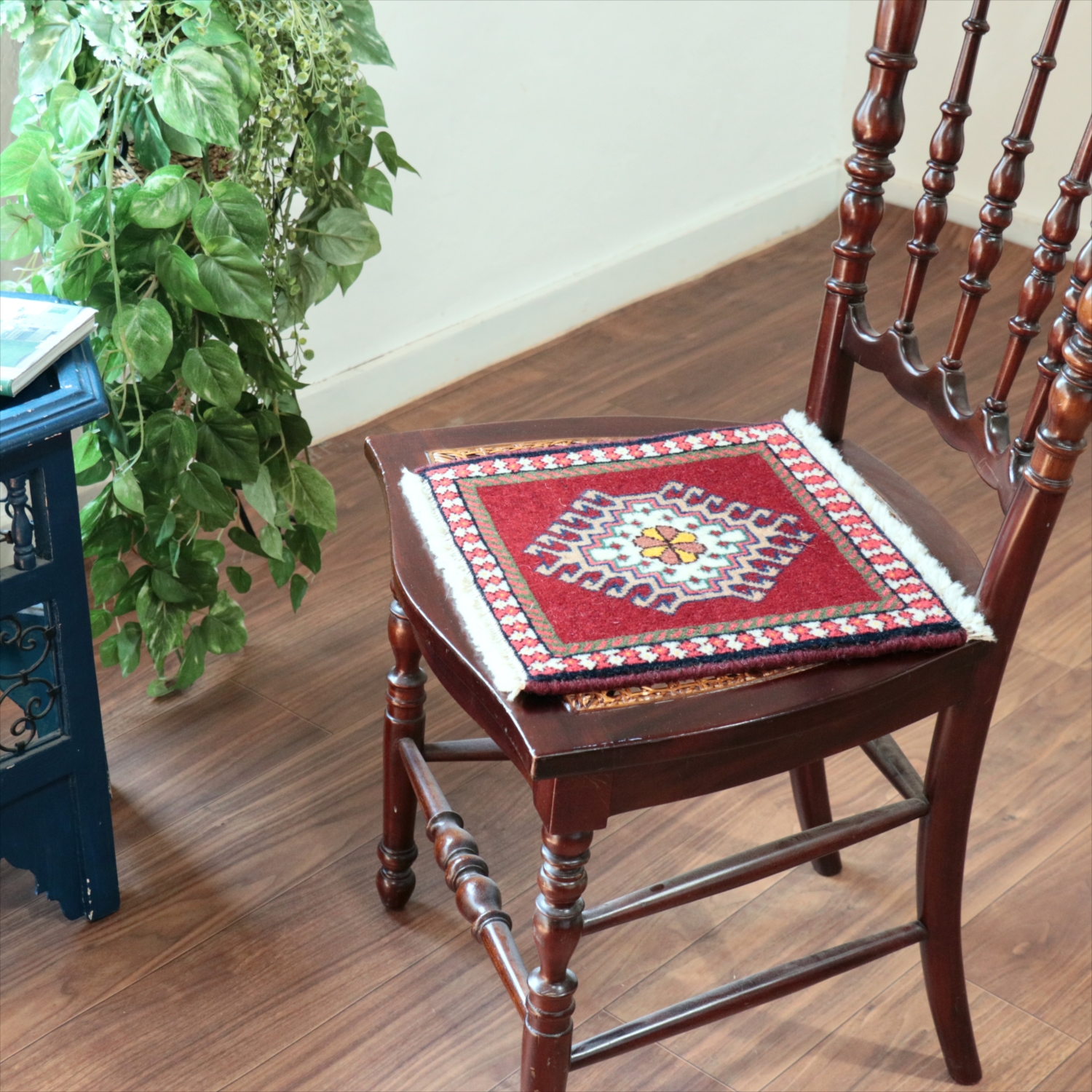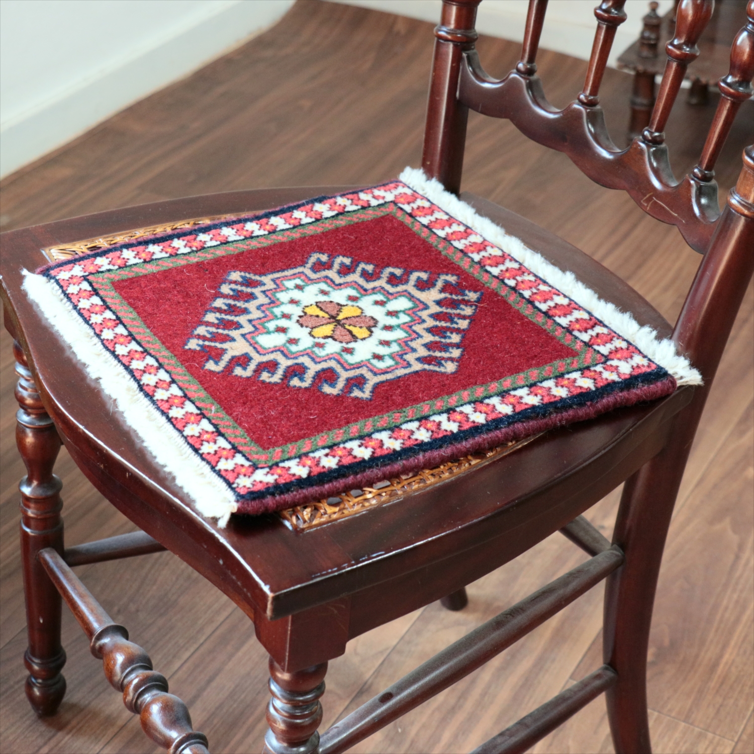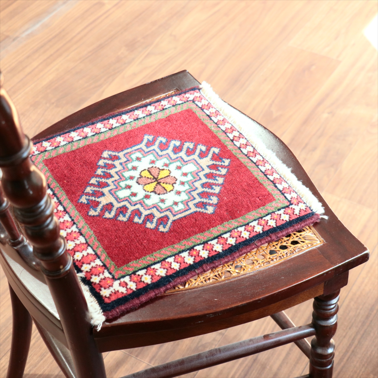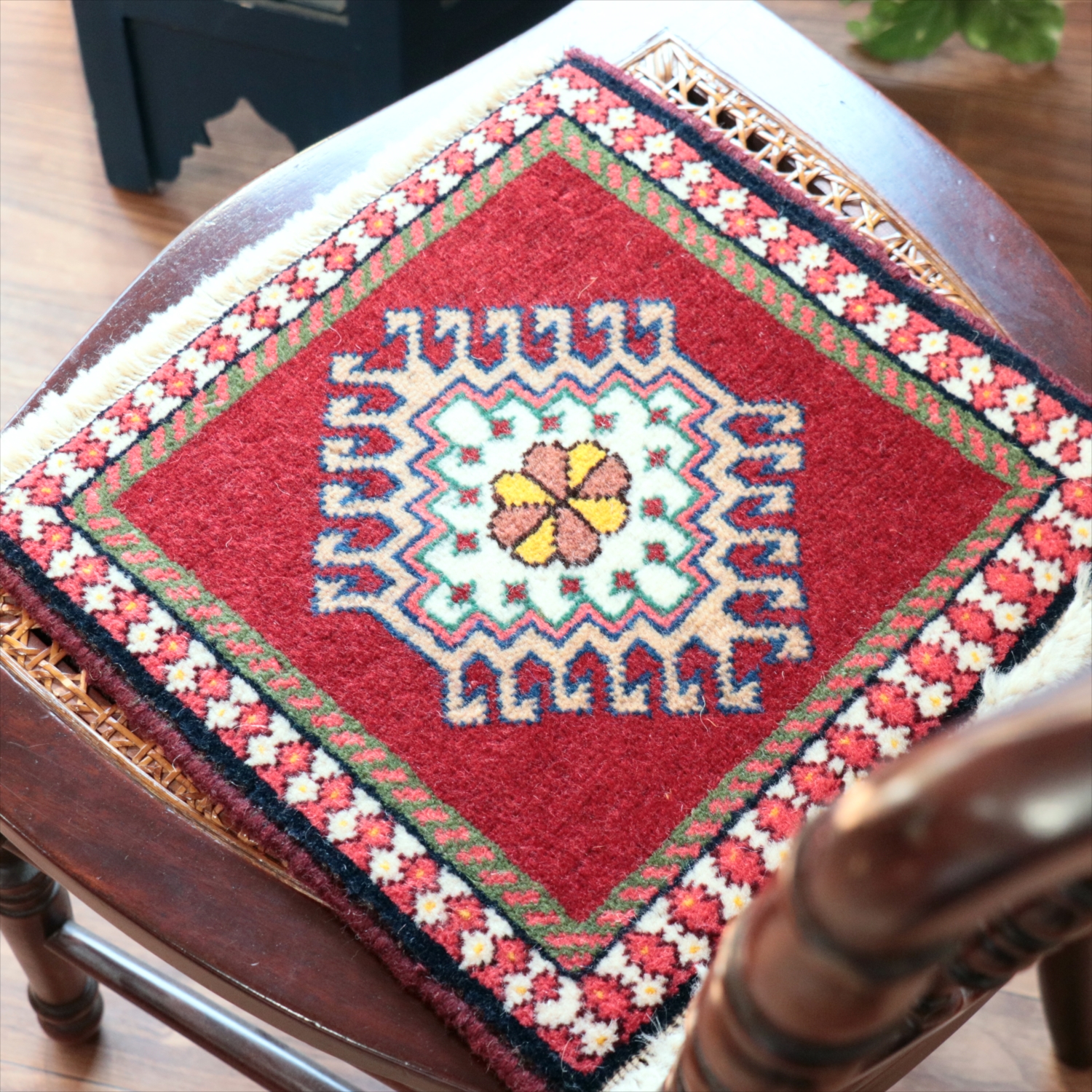 30cm角のミニサイズのラグ。小さいながらも、織りはしっかりしていて本格的です。多少ゆがみが気になりますが、ゆがみも含めて素朴な感じをお楽しみいただければと思います。