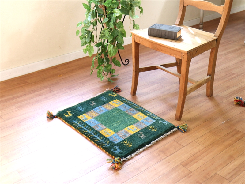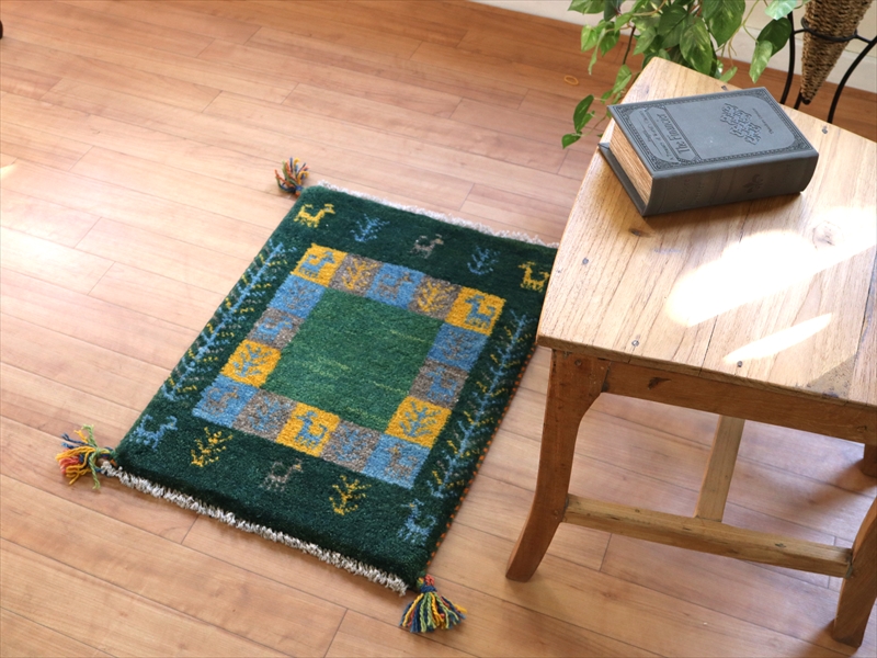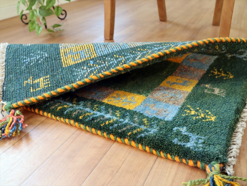 ギャッベ イラン産 手織り 58x43cm ふかふか グリーン