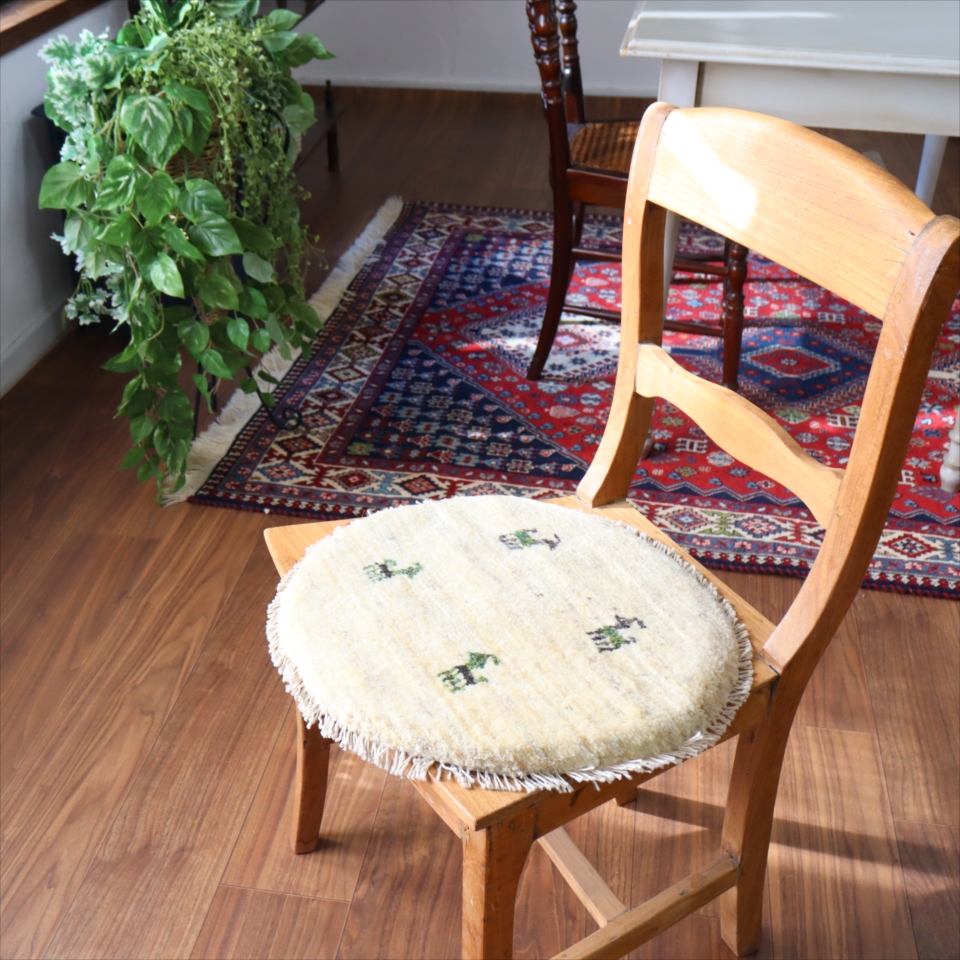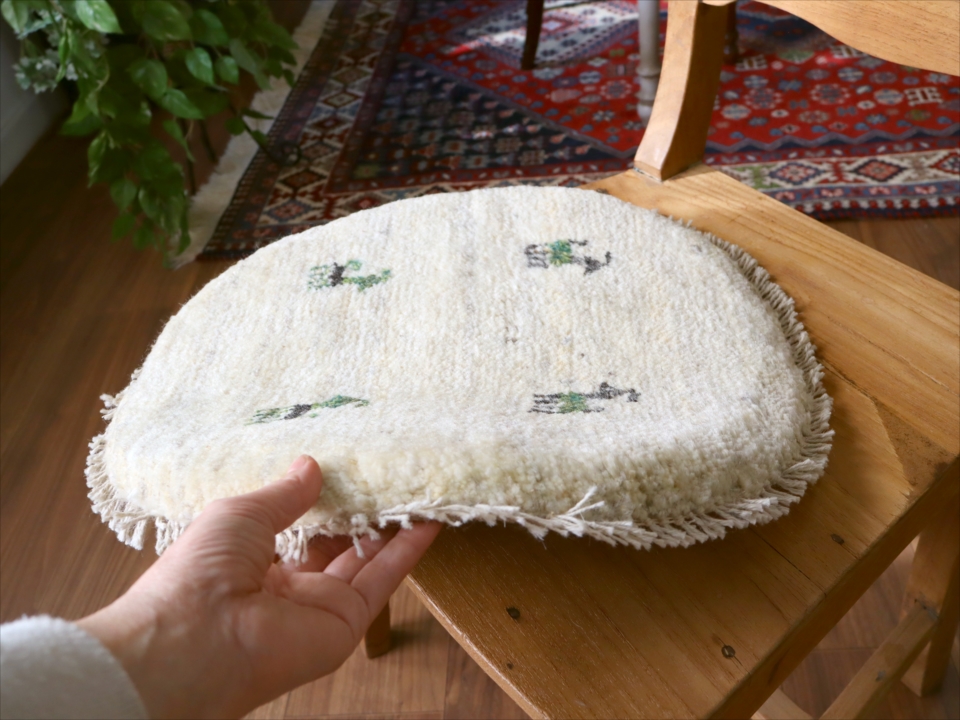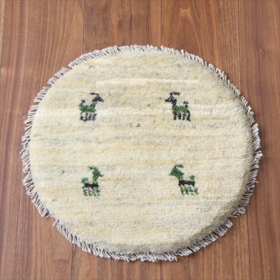 天然の羊毛の色をそのままいかしたアイボリーに、動物(ヤギ)のモチーフを織り込んだギャッベ。自然な色の濃淡が出ていて、一枚一枚に個性があります。