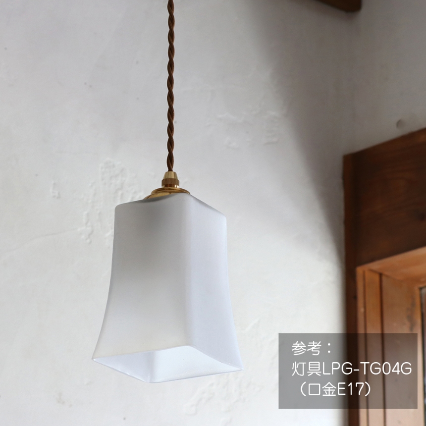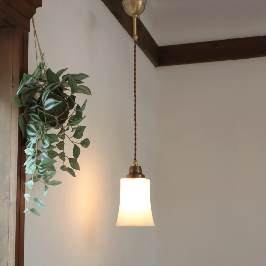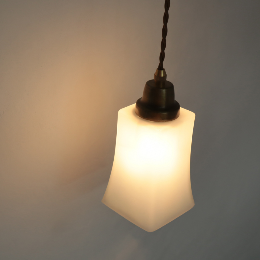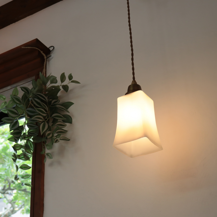 シンプルな四角いガラスシェード。半透明のフロストガラスで、やわらかな光が広がります。レトロな雰囲気です。
