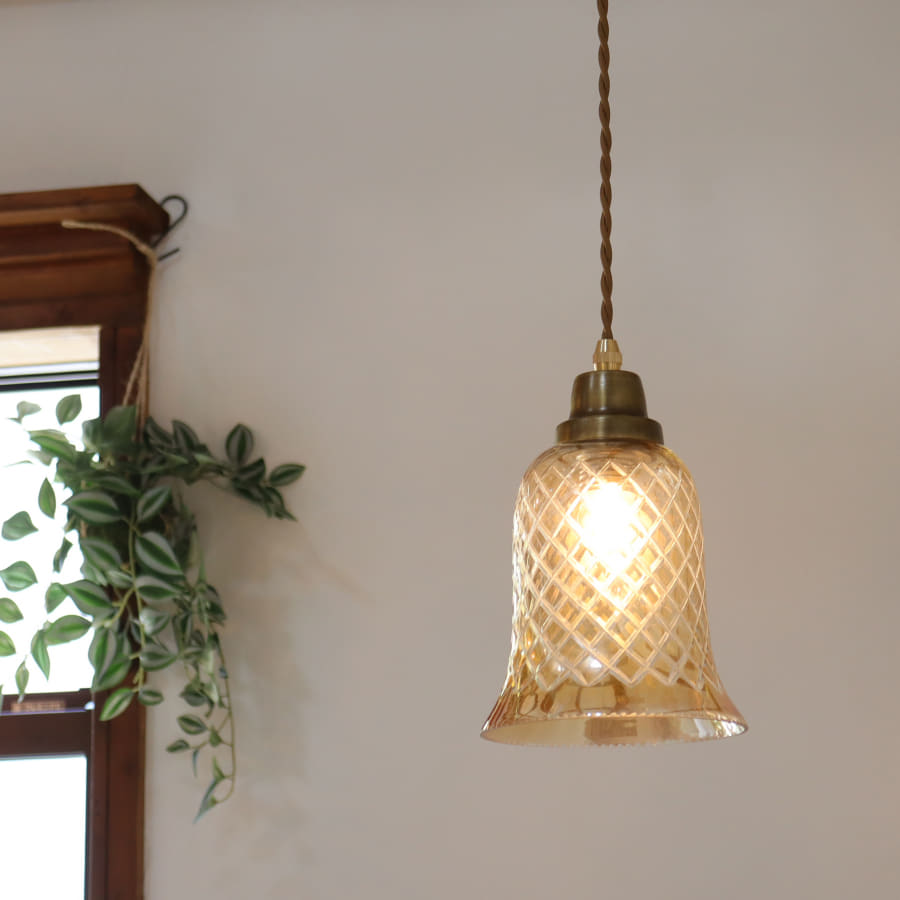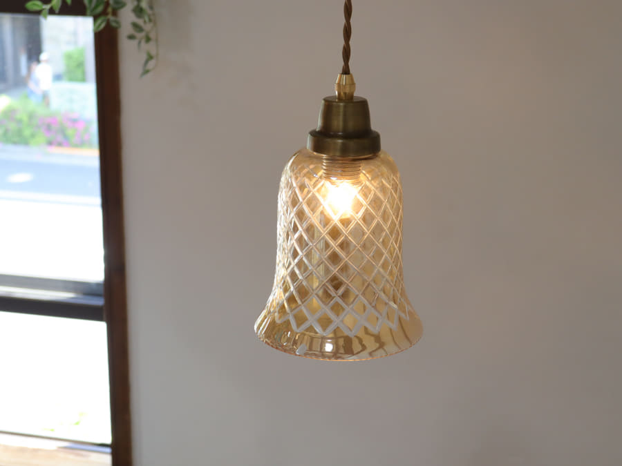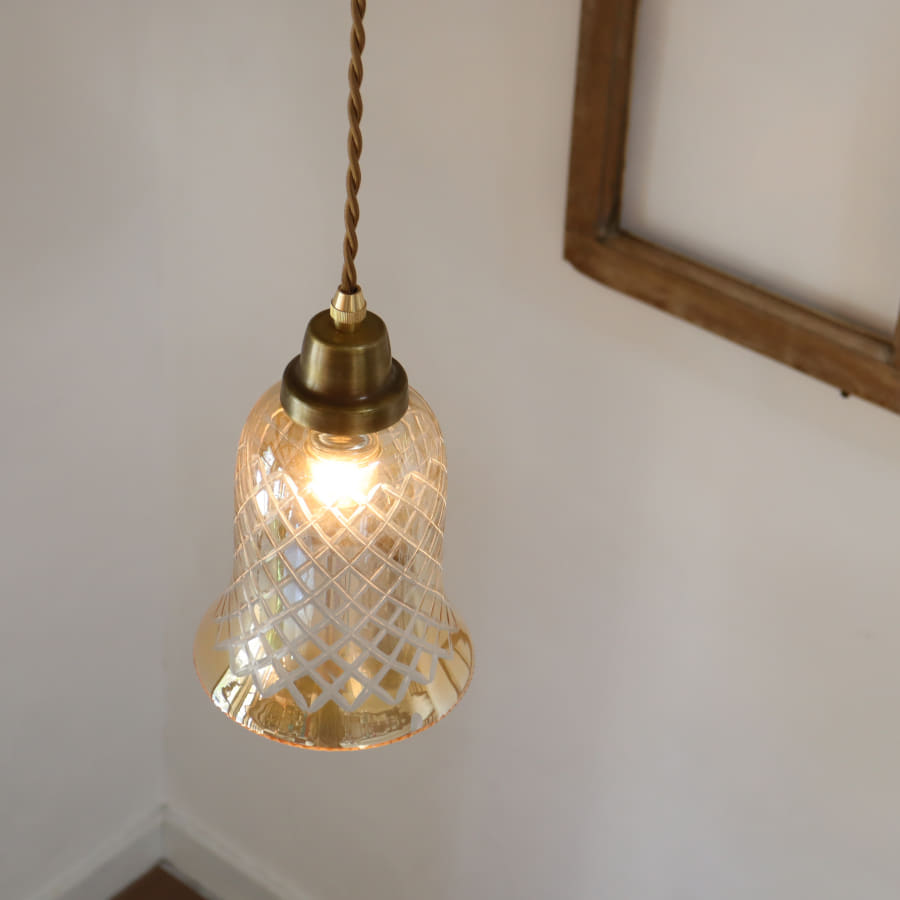 ぽってりとした厚みのあるガラスに、ハンドメイドで格子状の切子文様が彫り込まれています。レトロであたたかみのある雰囲気のガラスシェードです。