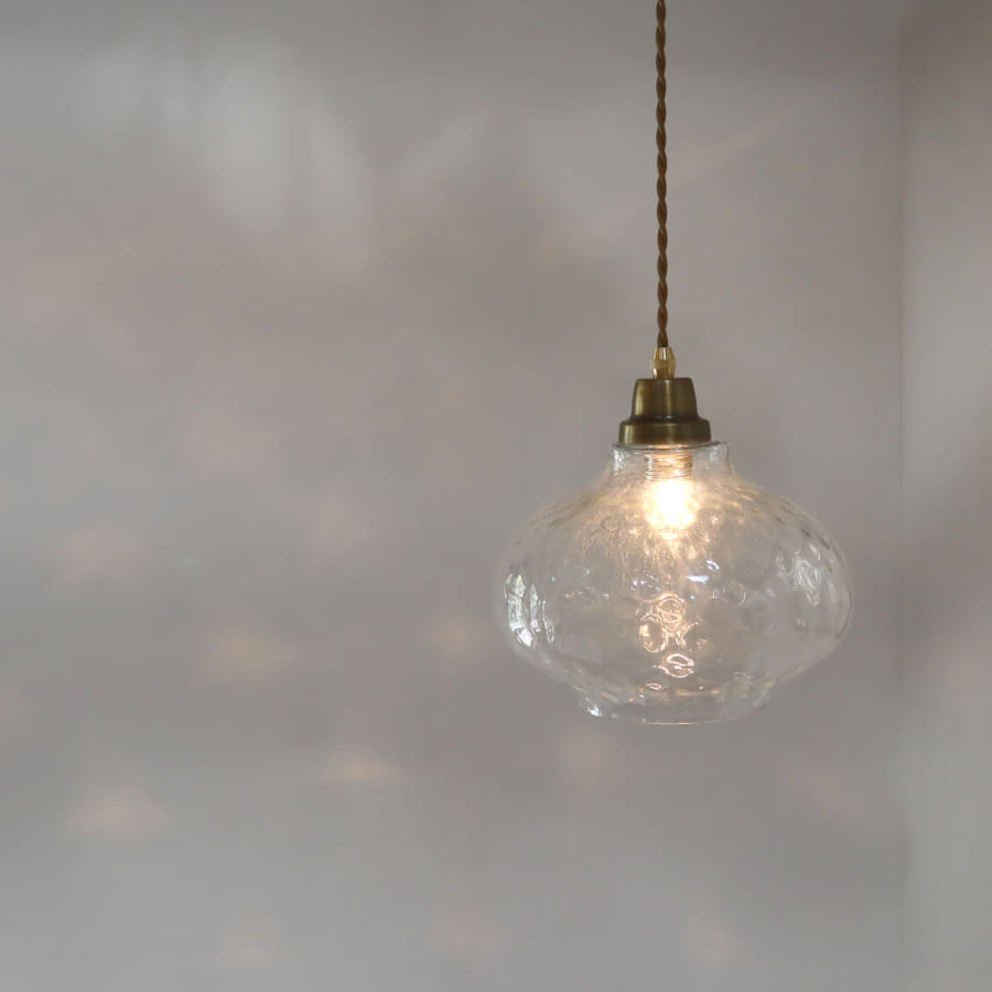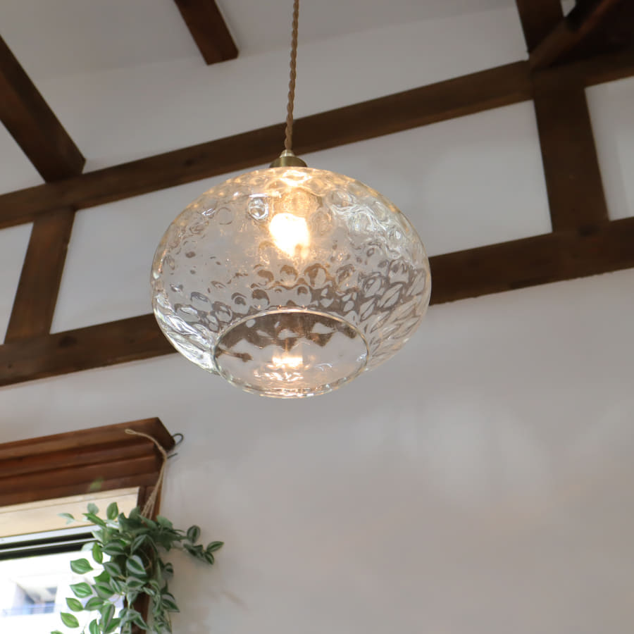 直径23cmのクルミの形をしたガラスランプシェードです。ポツポツとしたくぼみのある表面で、ゆらぎのある美しい光を放ちます。