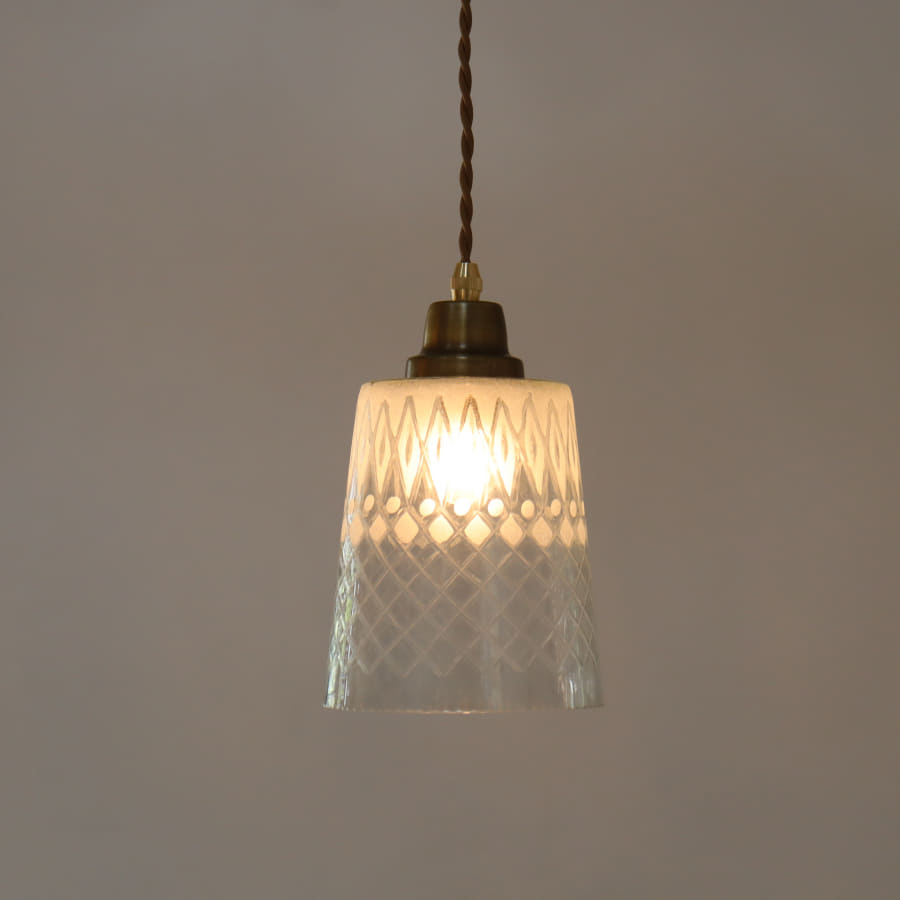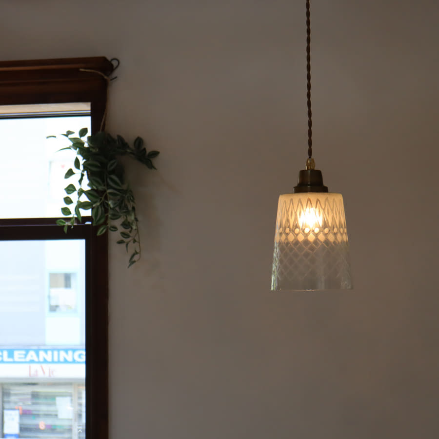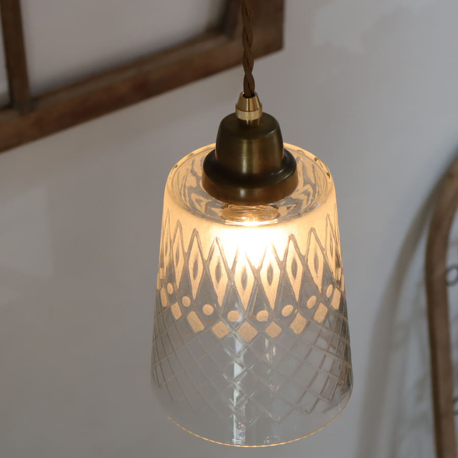 直線的なゴブレット形のシェードに、サンドブラストとカットガラスで幾何学模様がデザインされています。大正レトロなイメージもあり、和風空間のほか、カフェ風インテリアにも合わせやすいランプです。