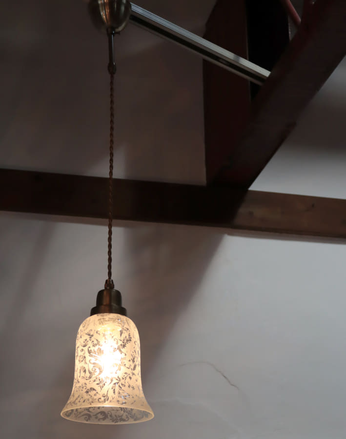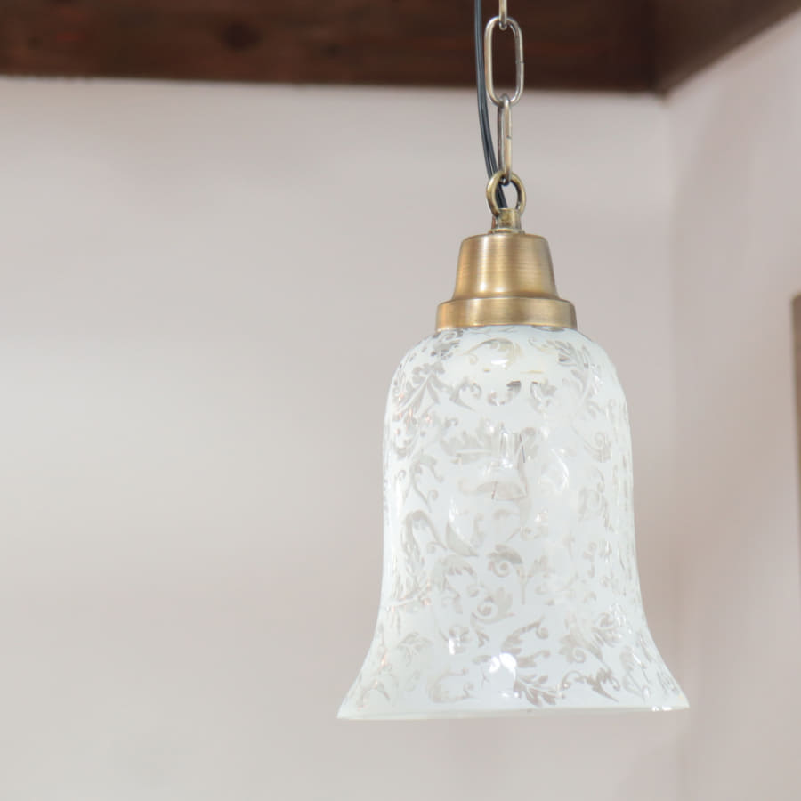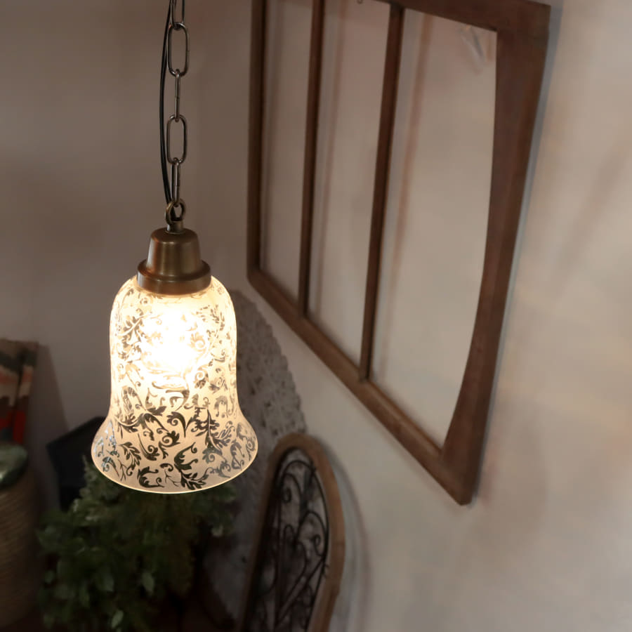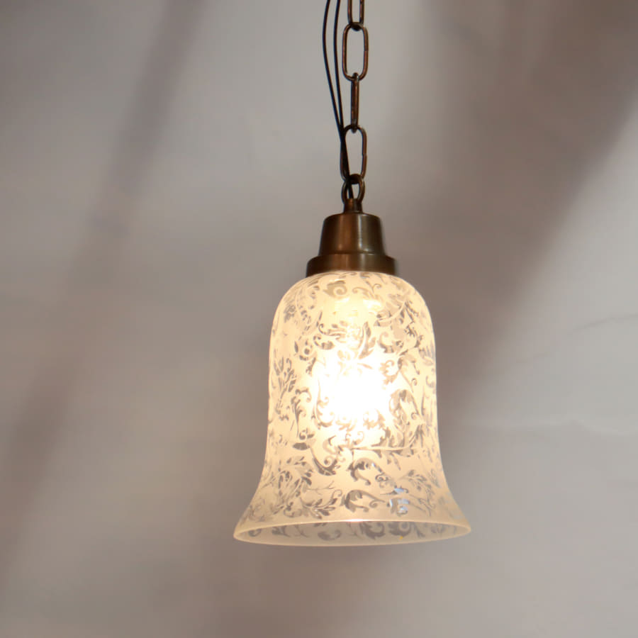 クラシカルなベル形のガラスに、サンドブラストで浮かび上がらせたアラベスク模様が施された華やかなデザイン。19世紀まで、キャンドルで灯りをとっていた時代からの伝統的なスタイルです。