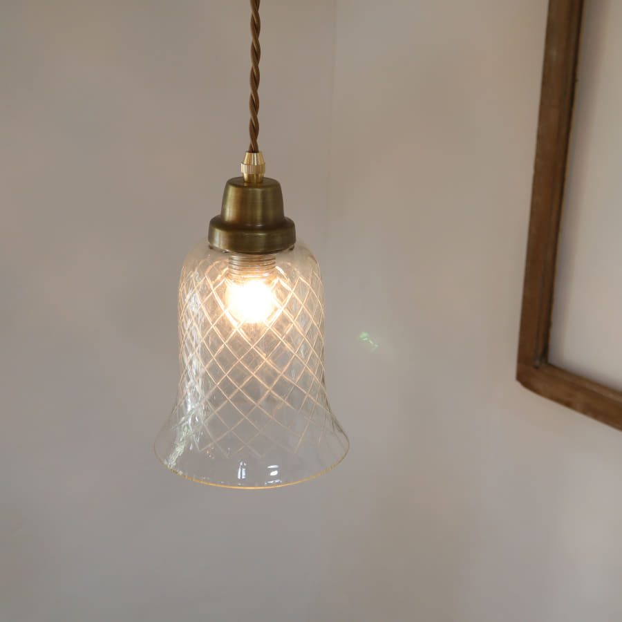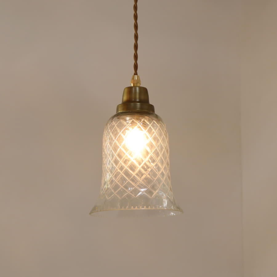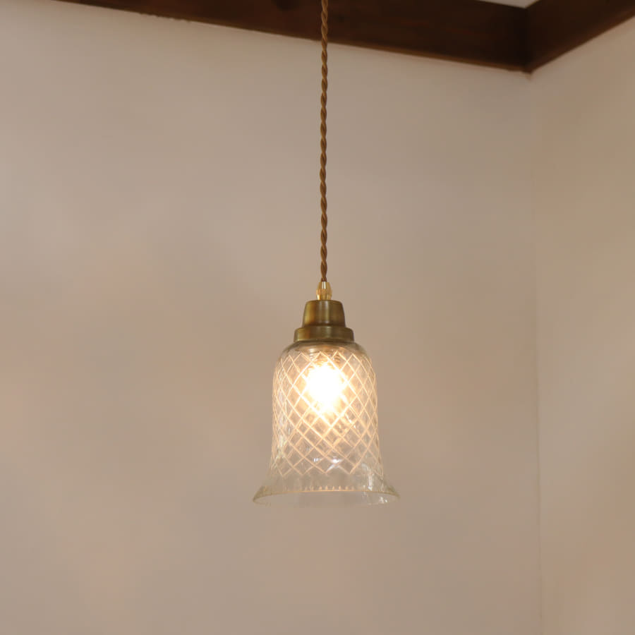 ぽってりとした厚みのあるガラスに、ハンドメイドで格子状の切子文様が彫り込まれています。レトロであたたかみのある雰囲気のガラスシェードです。