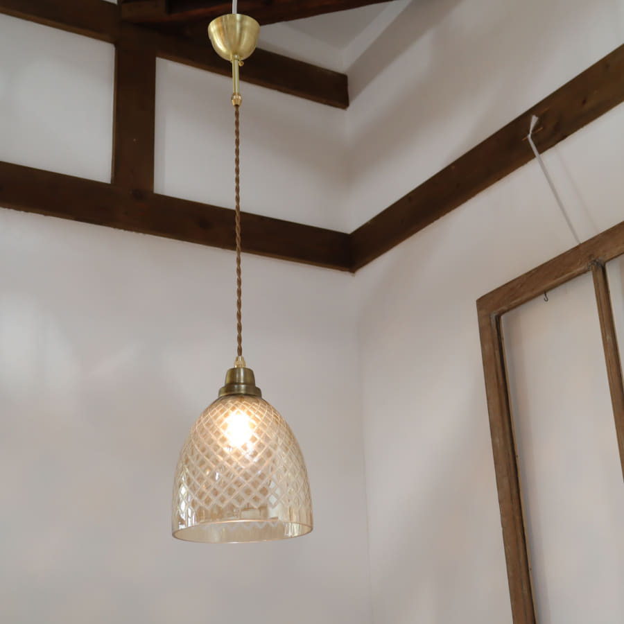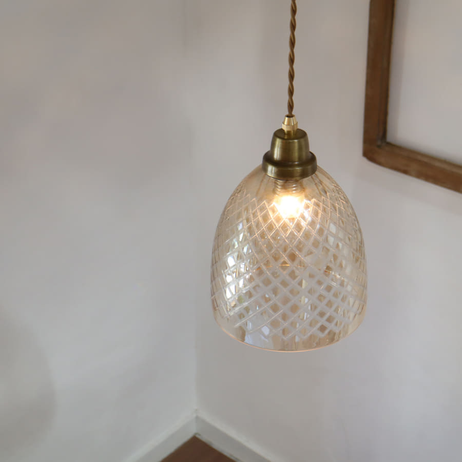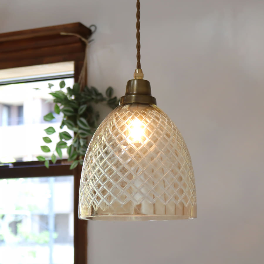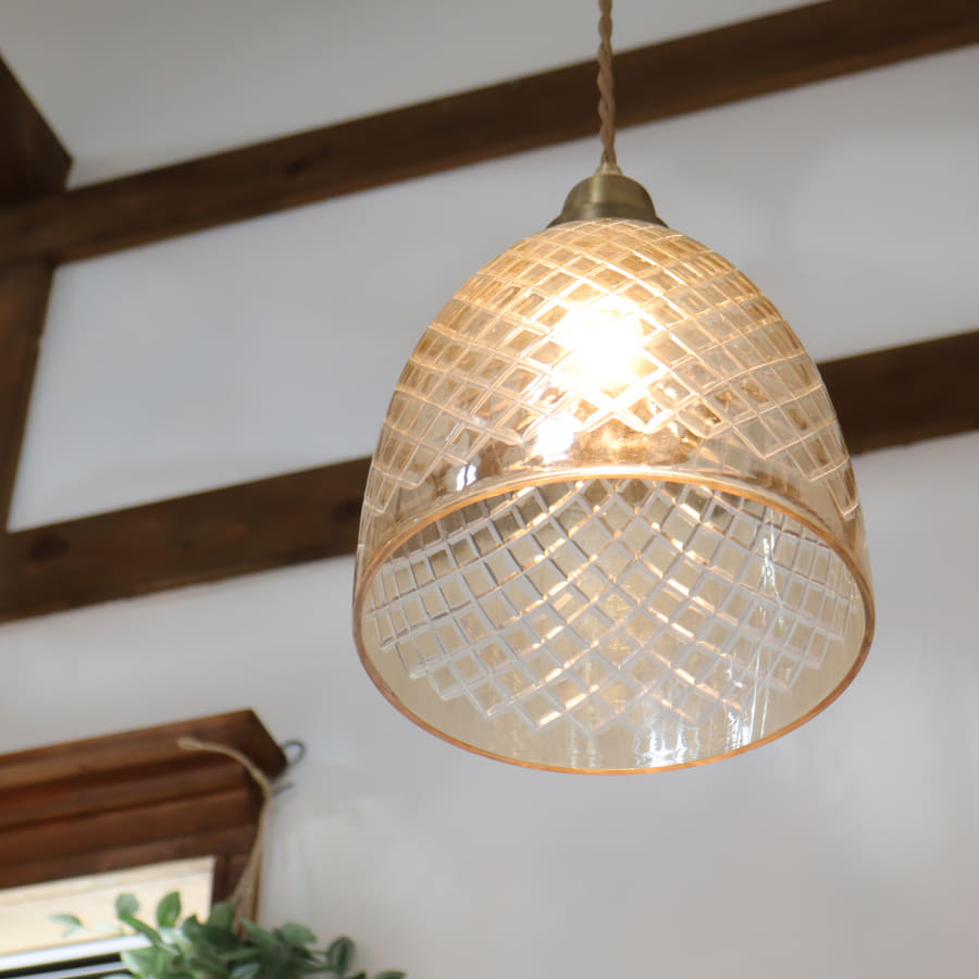 ぽってりとした厚みのあるガラスに、ハンドメイドで格子状の切子文様が彫り込まれています。直径18cmの釣り鐘型で、存在感のある大きさです。壁や天井に、光が映し出され美しい空間が演出できます。また、ヴィンテージ調のエジソン電球などをあわせてアレンジすると、レトロな雰囲気が楽しめます。