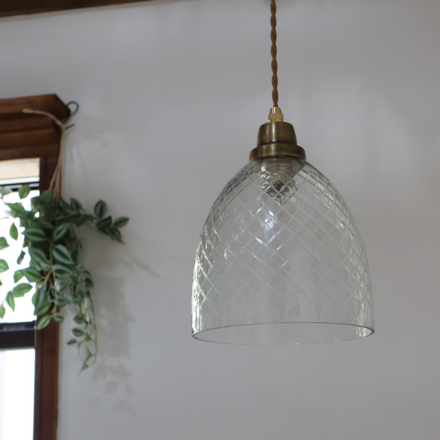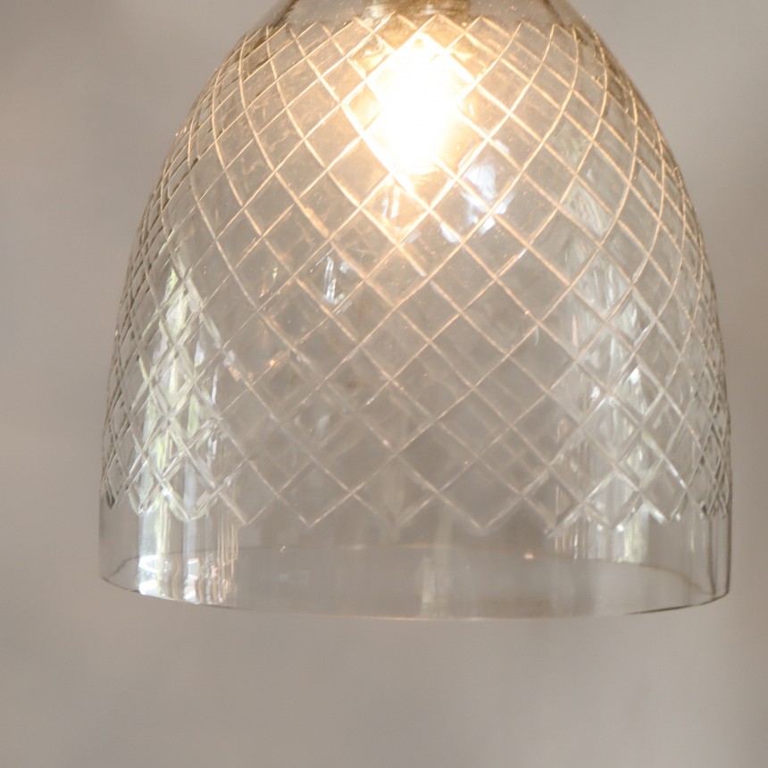 ぽってりとした厚みのあるガラスに、ハンドメイドで格子状の切子文様が彫り込まれています。直径18cmの釣り鐘型で、存在感のある大きさです。壁や天井に、光が映し出され美しい空間が演出できます。また、ヴィンテージ調のエジソン電球などをあわせてアレンジすると、レトロな雰囲気が楽しめます。