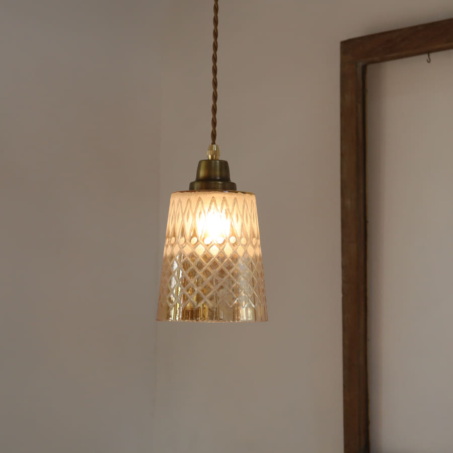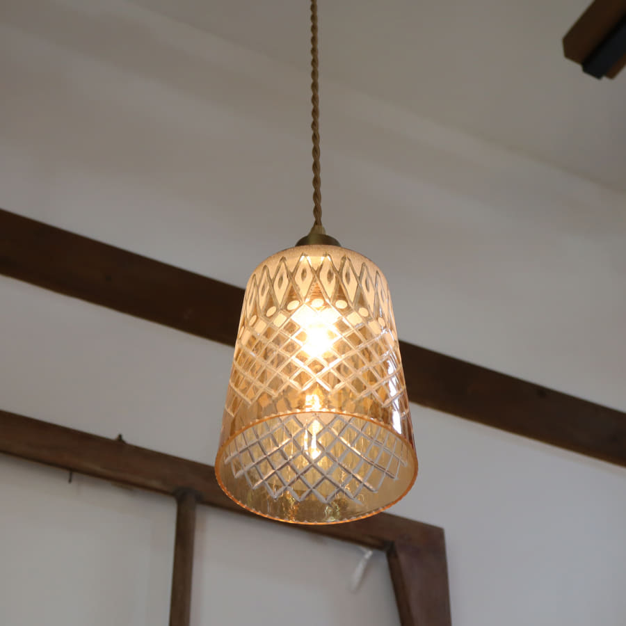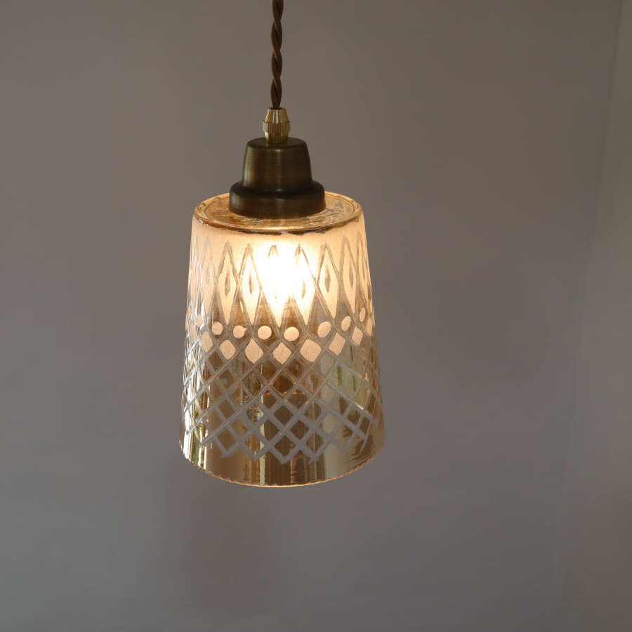 直線的なゴブレット形のシェードに、サンドブラストとカットガラスで幾何学模様がデザインされています。大正レトロなイメージもあり、和風空間のほか、カフェ風インテリアにも合わせやすいランプです。