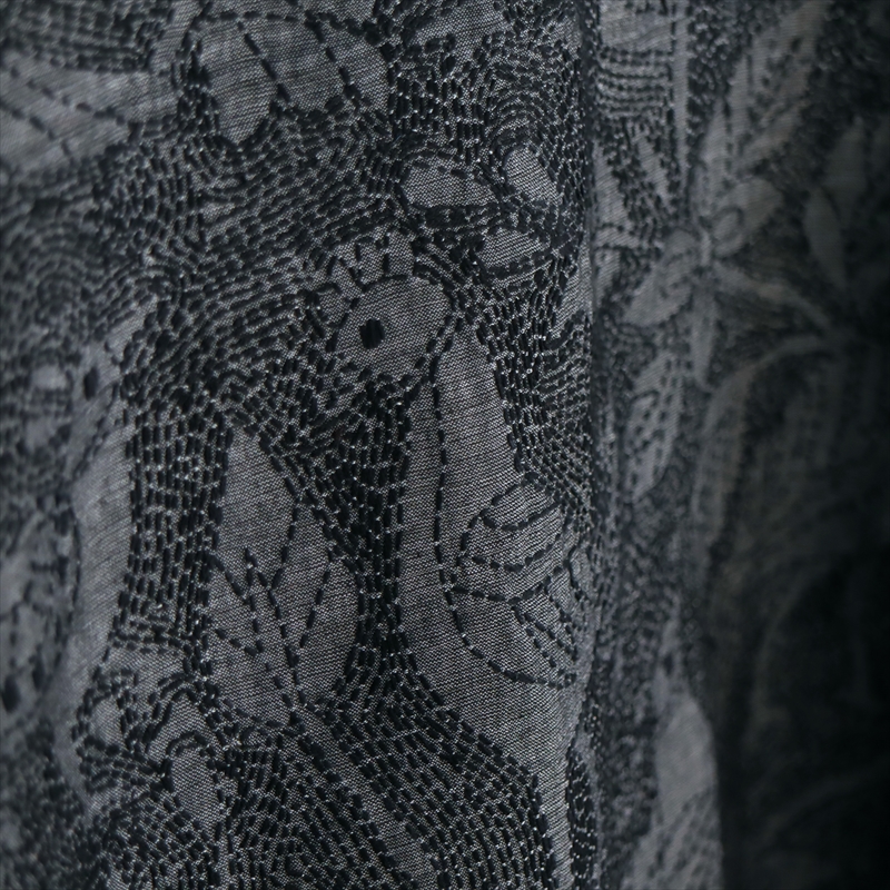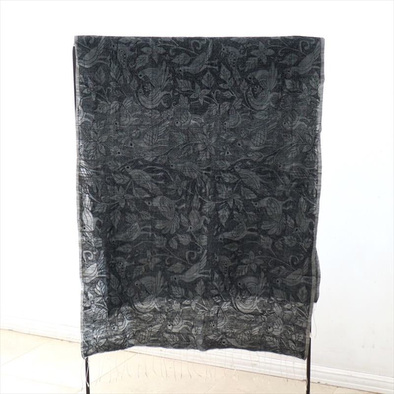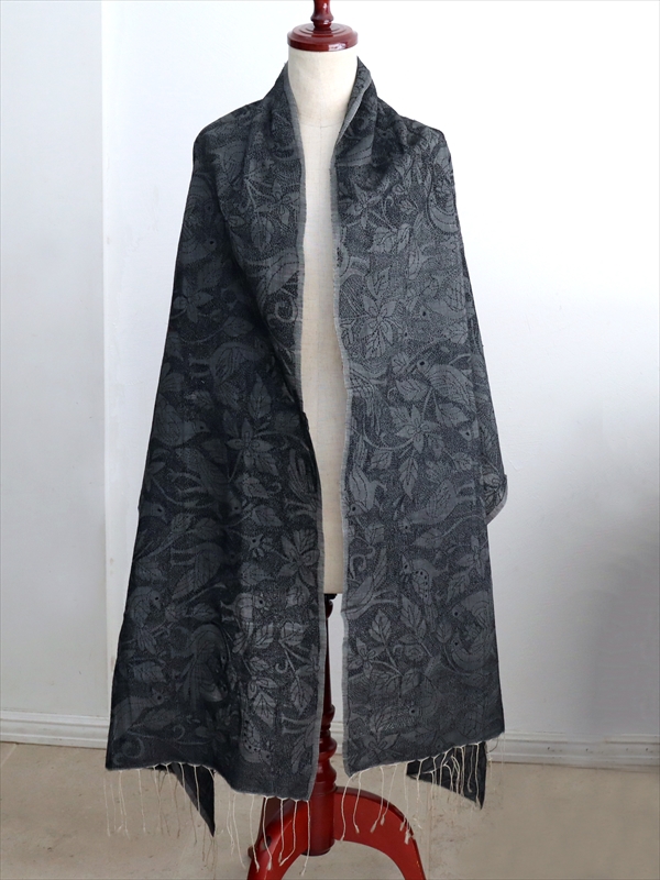 光沢のあるダークグレーのシルク地の全面が、細かな刺繍で埋めつくされています。デザインは数種類の鳥が描かれた楽園がテーマ。モチーフ部分がベース生地のままで、モチーフの隙間を埋めているのがすべて刺繍になっていて、とても凝ったデザインです。