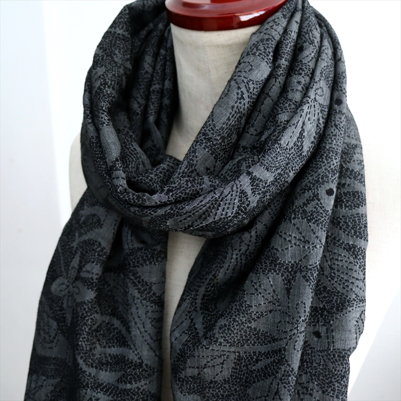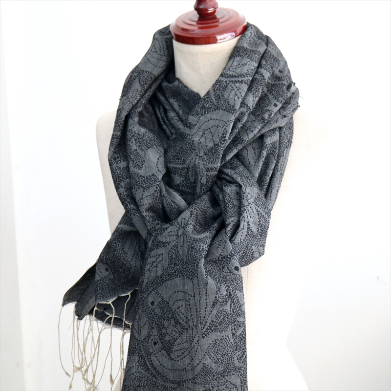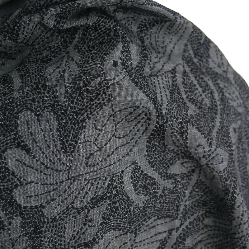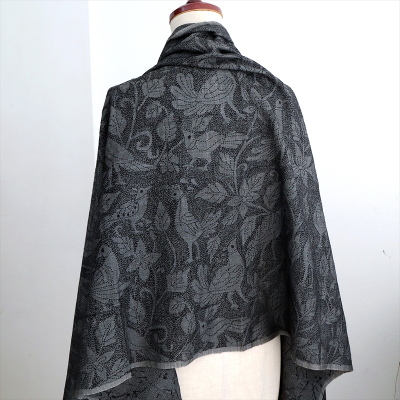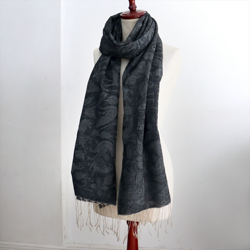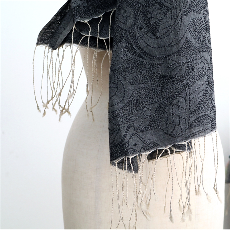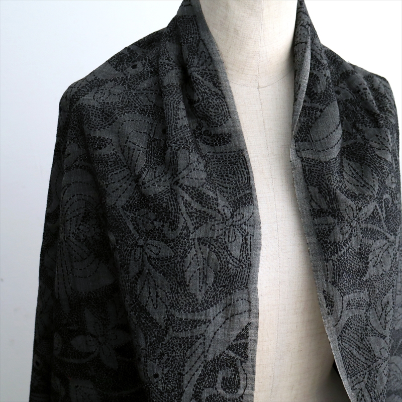 手刺繍の一点ものです。細かく見るとモチーフの並びが均一でないところなどあることをご了承ください。開いて全体をみたときに、一部色が薄くグレーになっていて、この部分20cmほどは刺繍の密度が低いため明るく見えています。