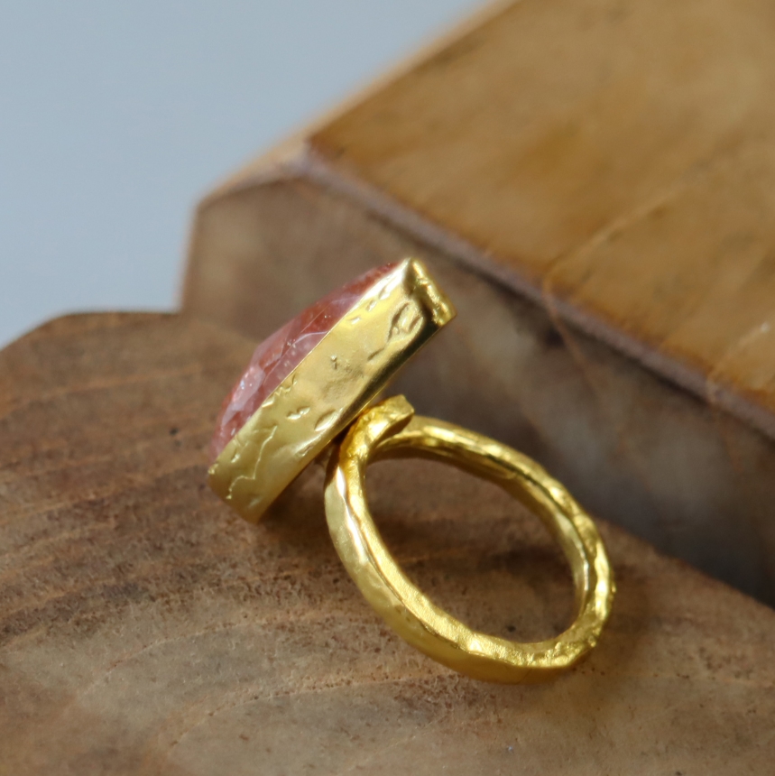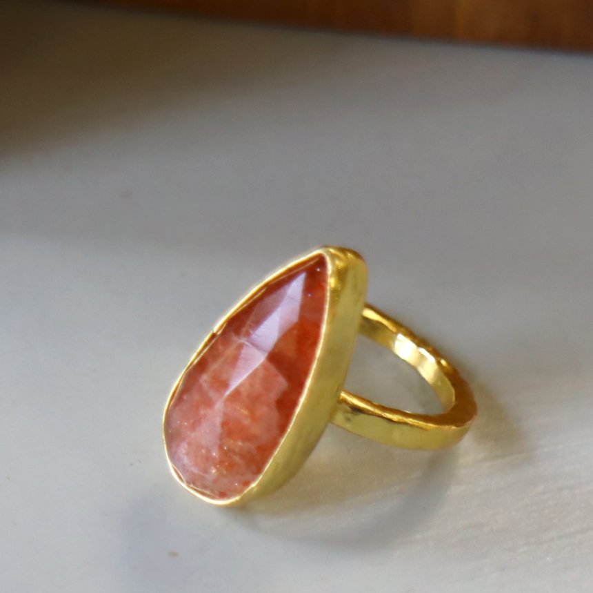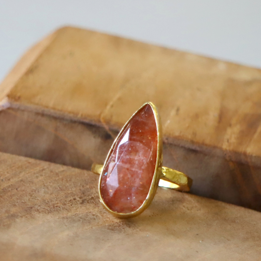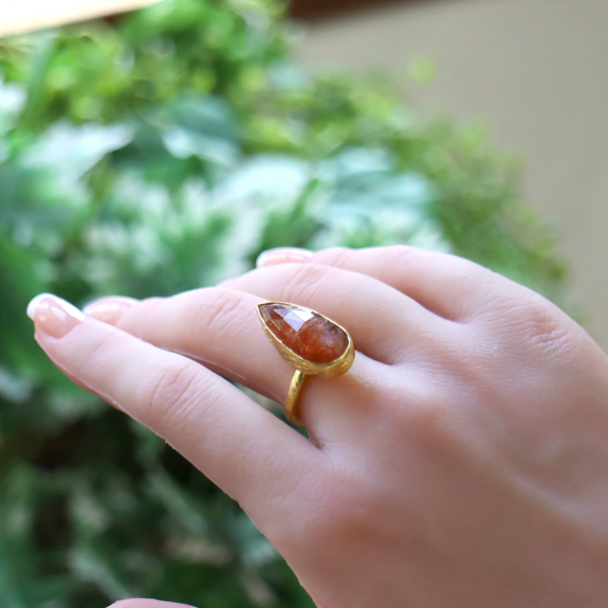 太陽の石、といわれるように、輝く太陽のような赤褐色の色が美しいサンストーンのリングです。石の中に散りばめられたインクルージョン(内包物)が、光を反射し角度によってキラキラと輝きます。
