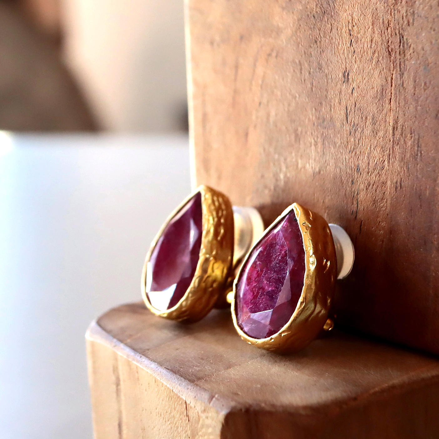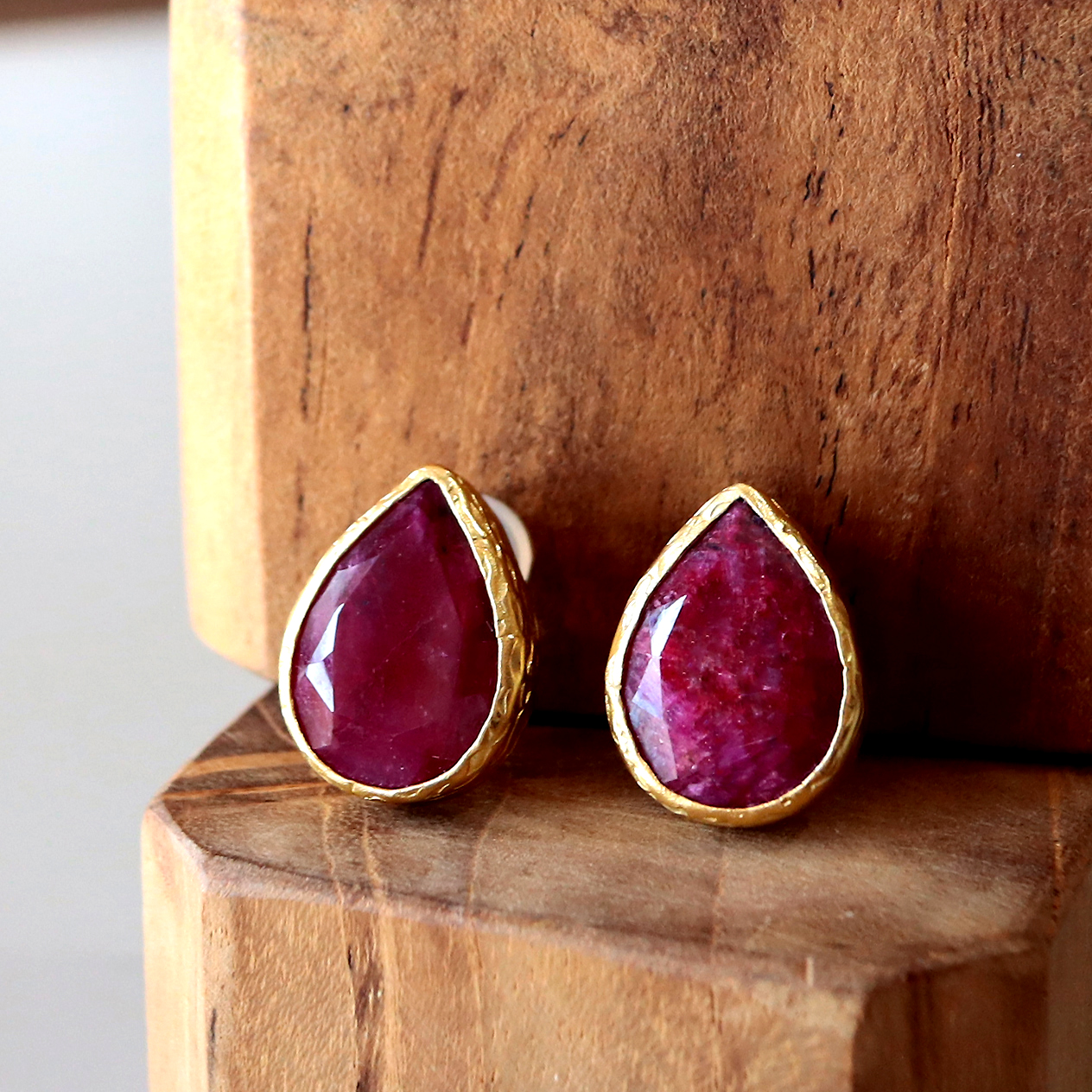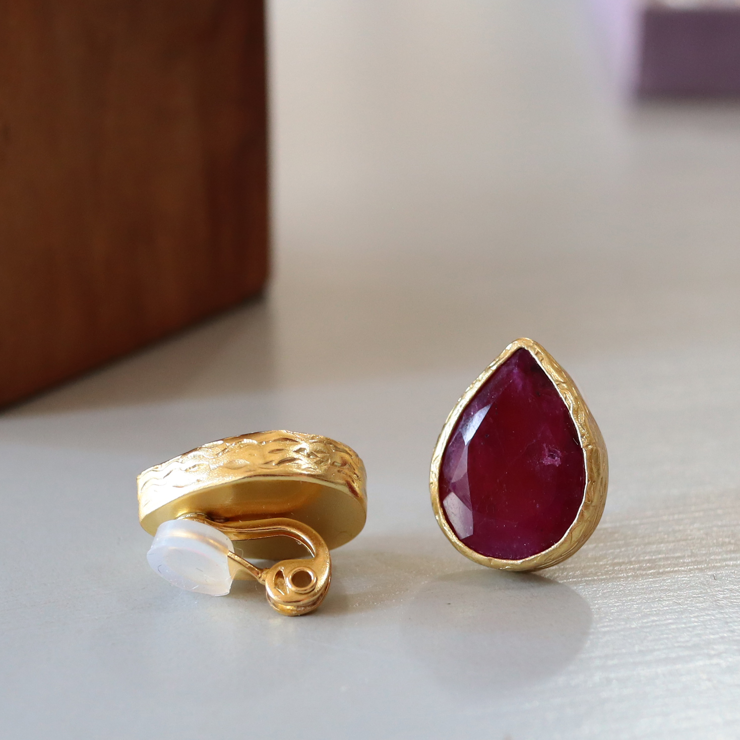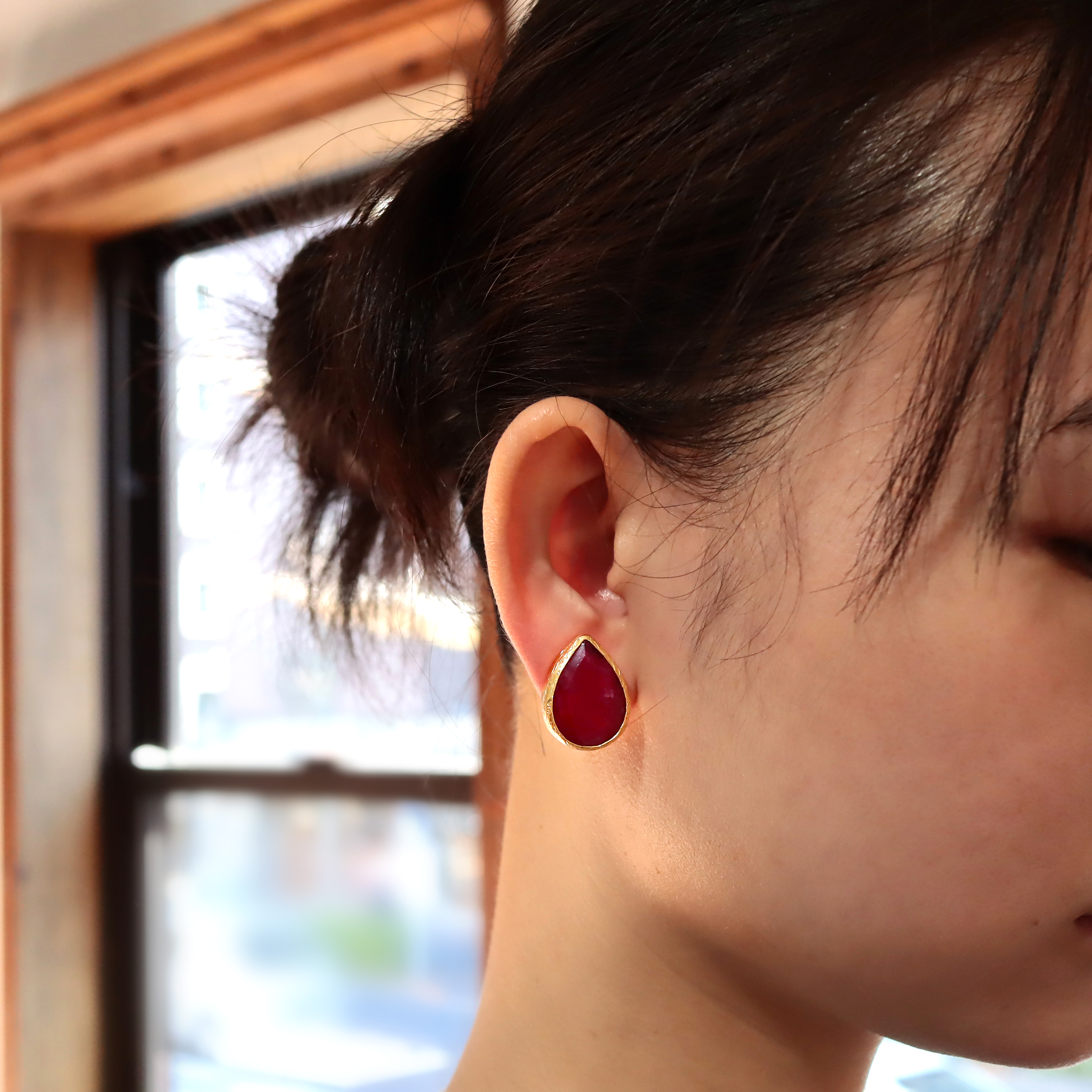 深みあるレッドカラーが華やかな、大きなドロップ型のイヤリング。※厚み5ミリ耳たぶに挟むタイプですが、シリコンカバーがついているので、やさしい着け心地です。