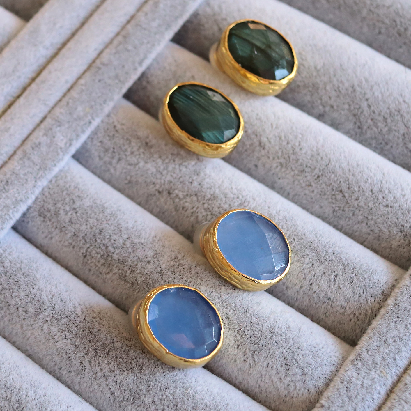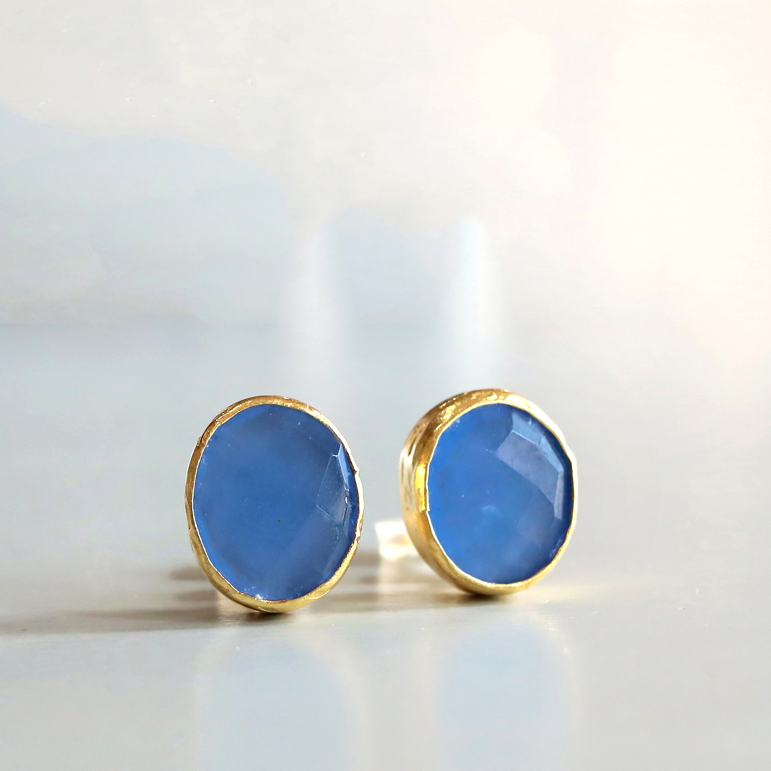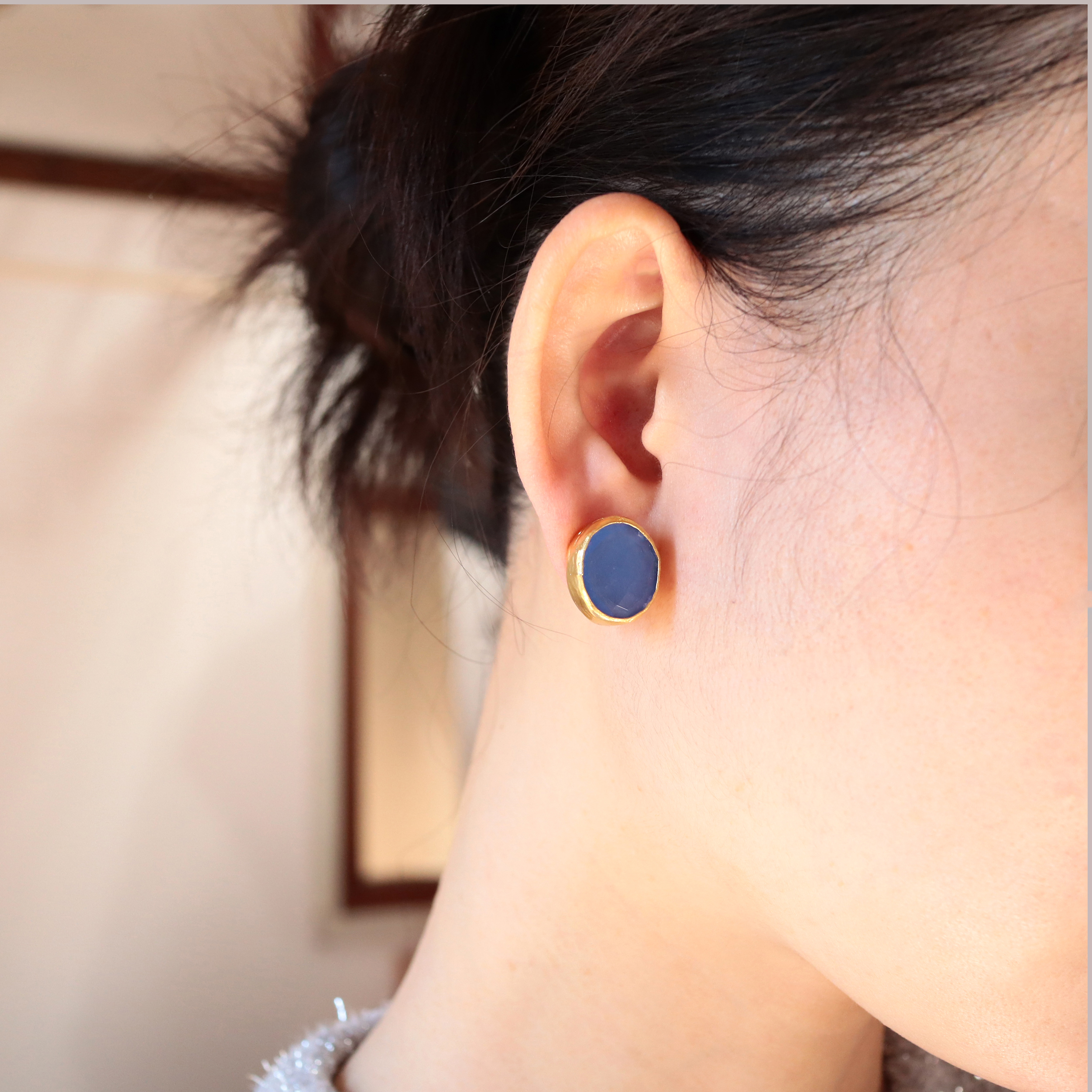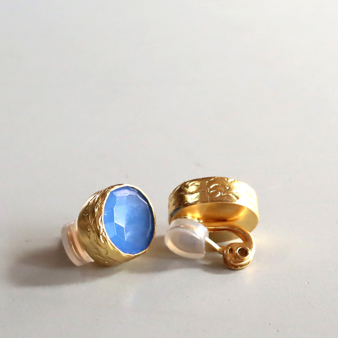 乳白色の淡いやわらかな青みが印象的なブルーカルセドニーオーバルイヤリング。※厚み5ミリ