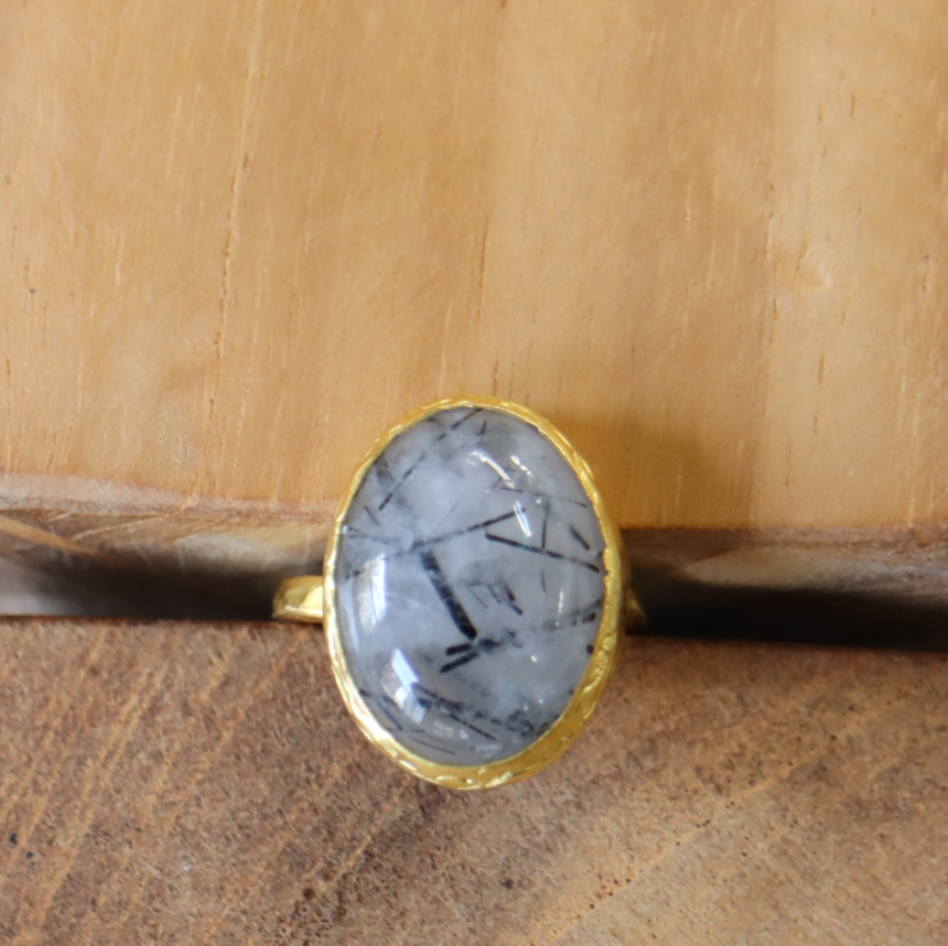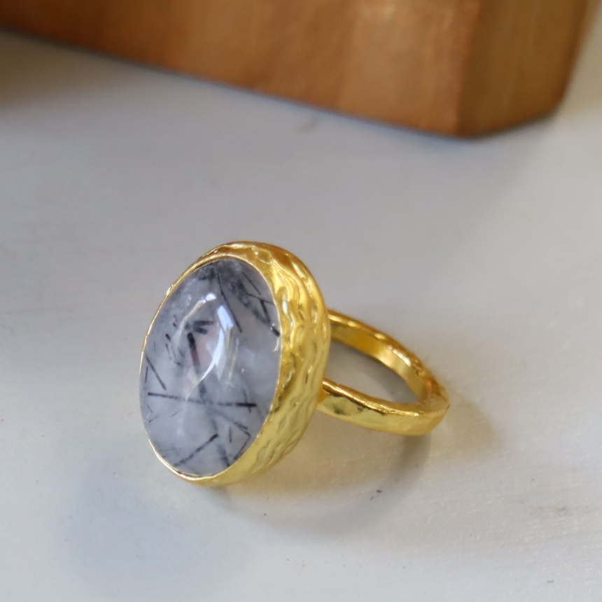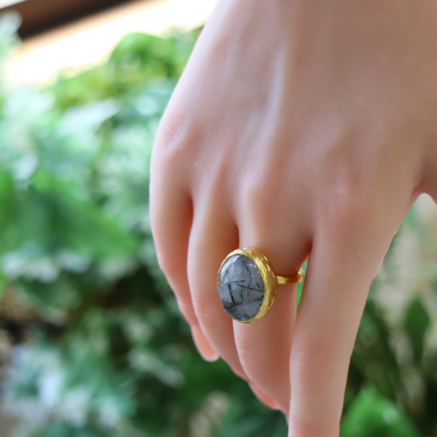 白く濁った水晶の中に薄いブラックの針状結晶(ルチル)が美しく輝く、珍しいブラックルチルクォーツのリング。ぽってりとした石に光がさし込み存在感を放ちます。