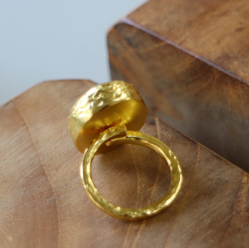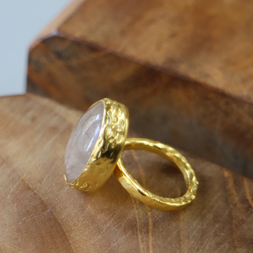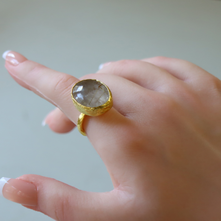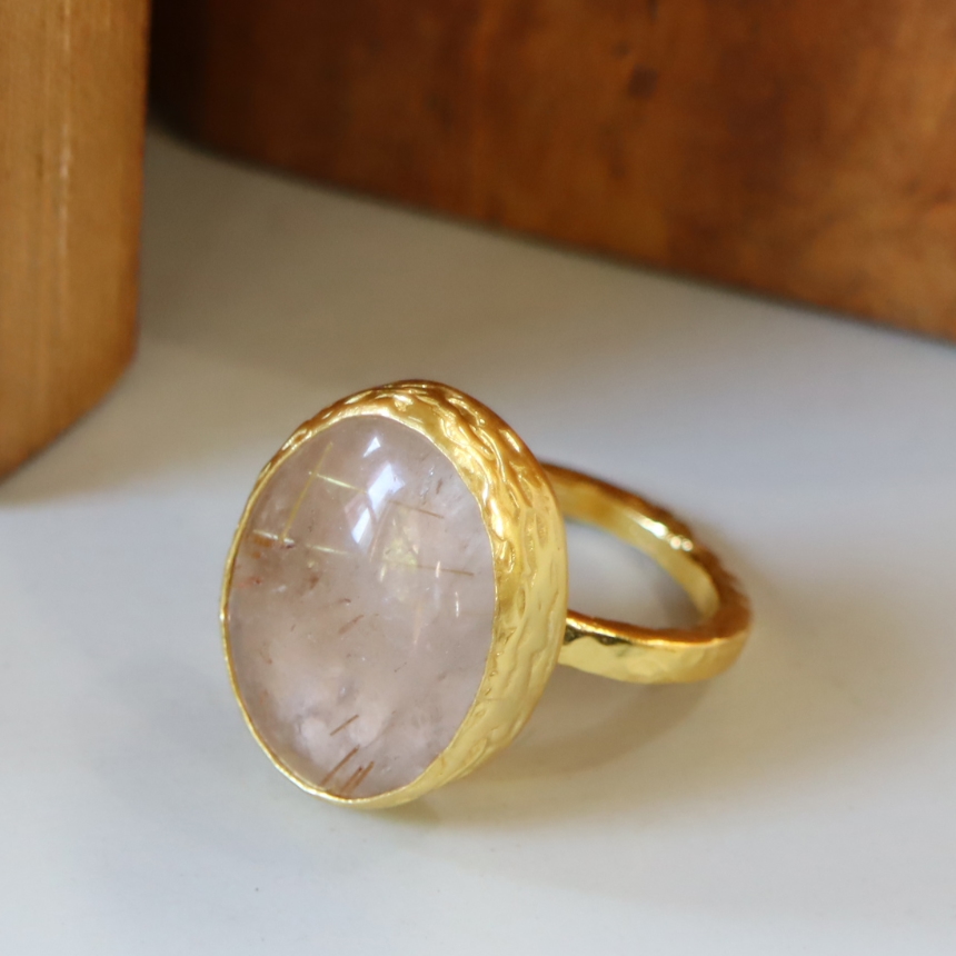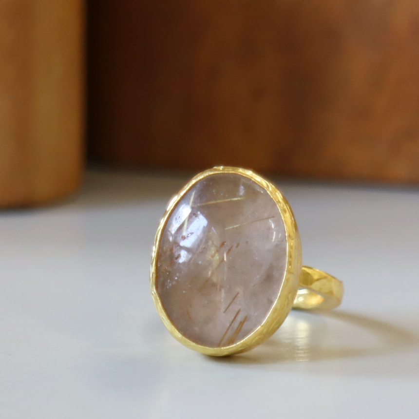水晶の中のゴールドルチル(針状の内包物)が、見る角度によって、表情を変えるルチルクォーツのカボションリングです。肌にしっとりと馴染み、ナチュラルな存在感を放ちます。