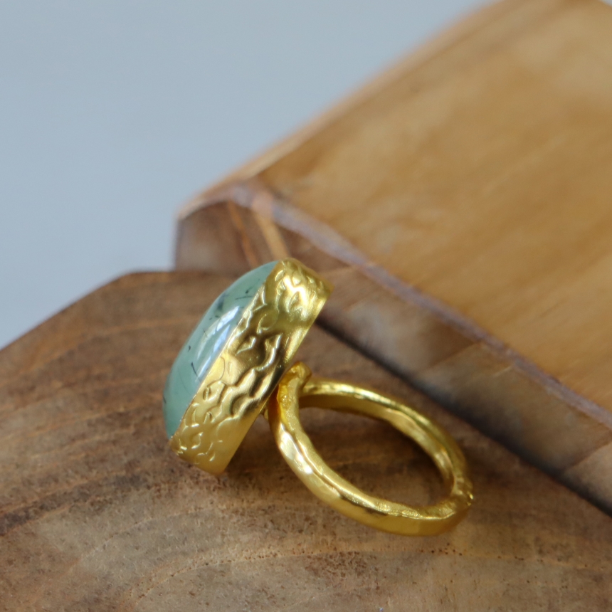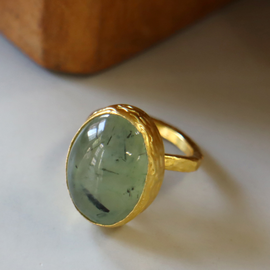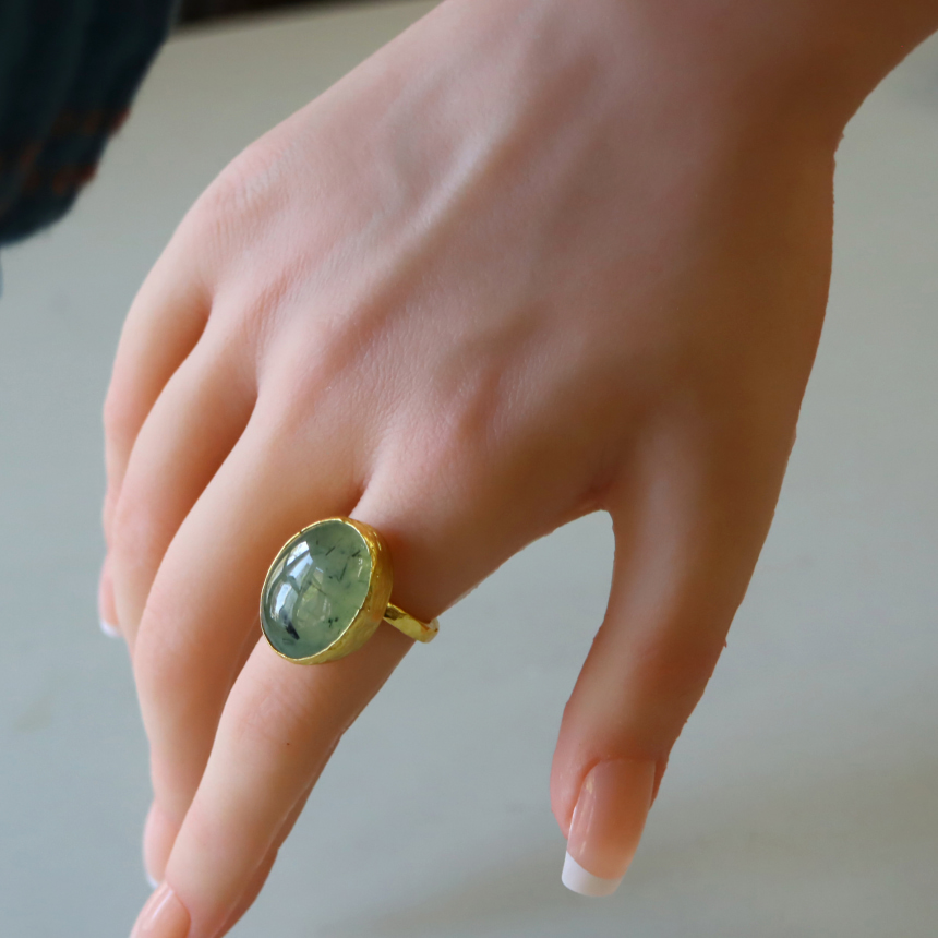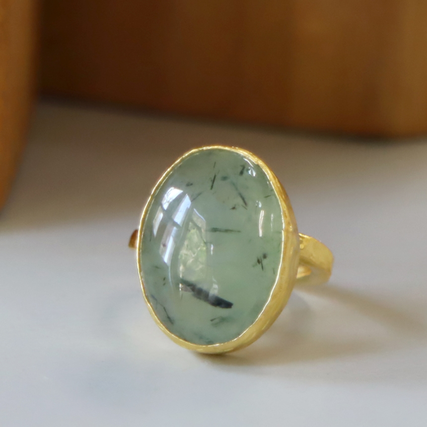 深みあるナチュラルグリーンが特徴のプレナイトのリングです。ふわりと浮かぶような内包物が、奥深い色彩を描き、幻想的で静かな存在感を放ちます。