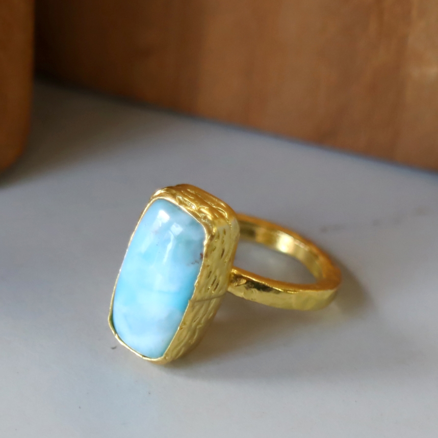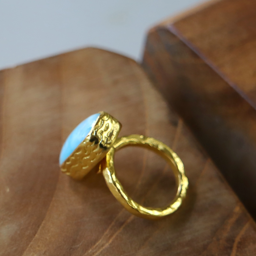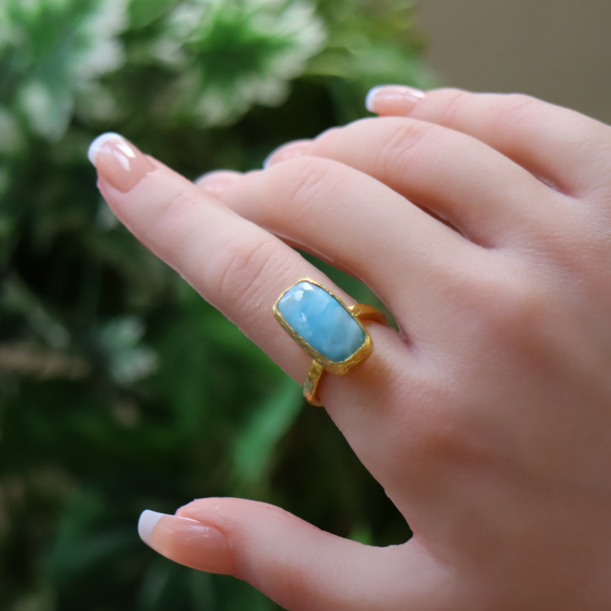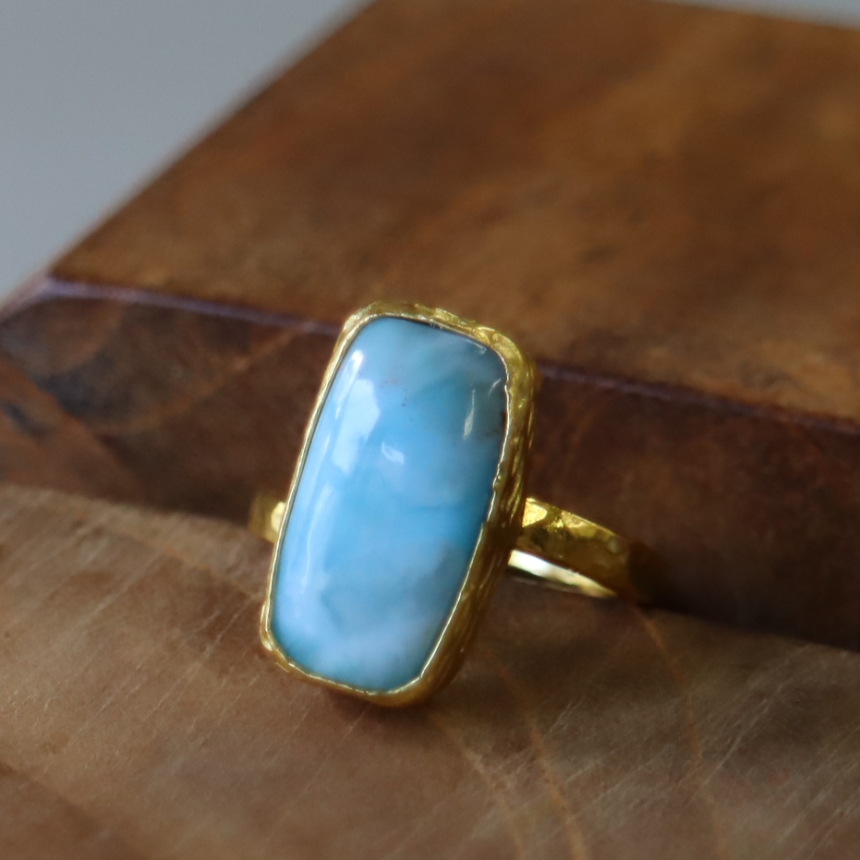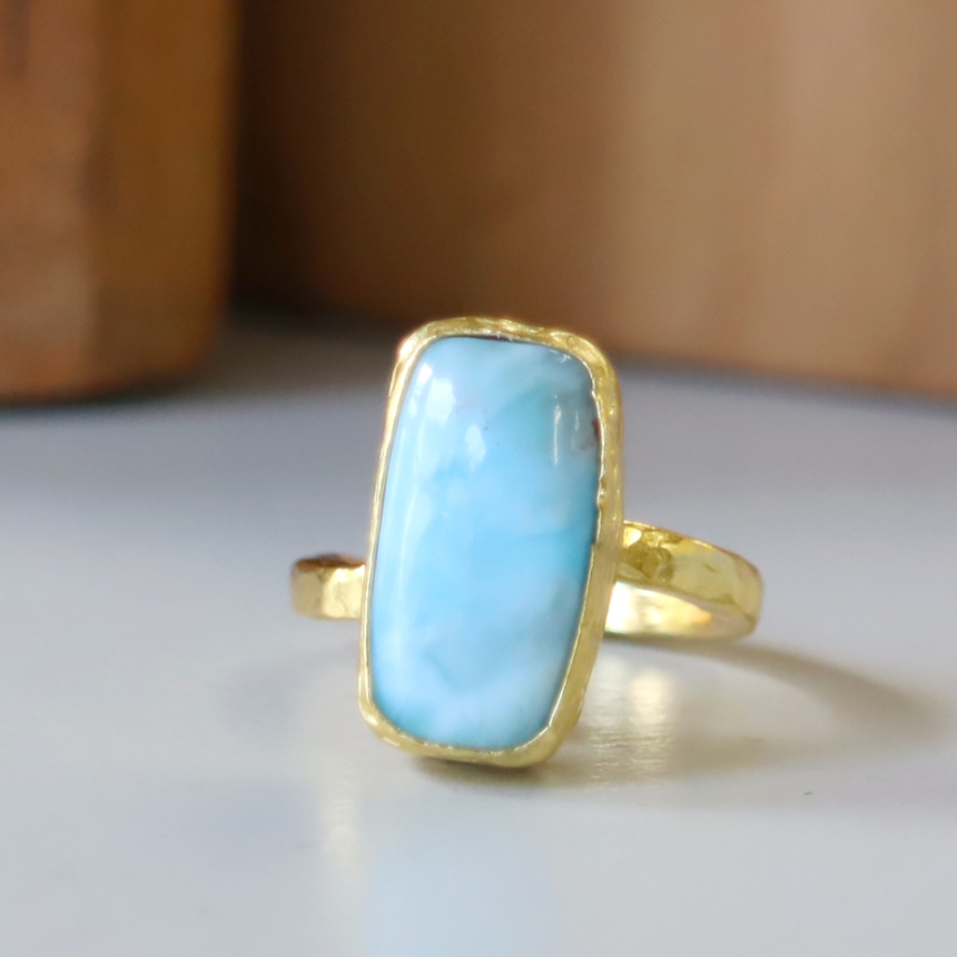 雲が浮かぶ青空のような模様が広がる、清々しいブルーが美しいラリマーのリングです。イエローゴールドとの組み合わせが上品です。シンプルなデザインは石の本来の美しさを引き立てます。