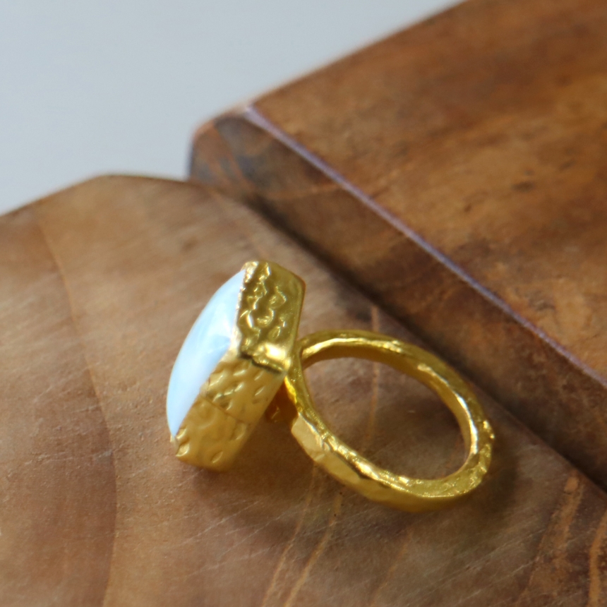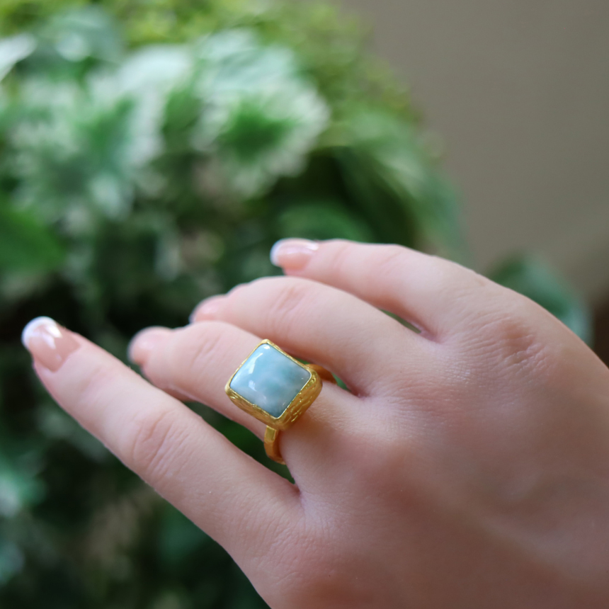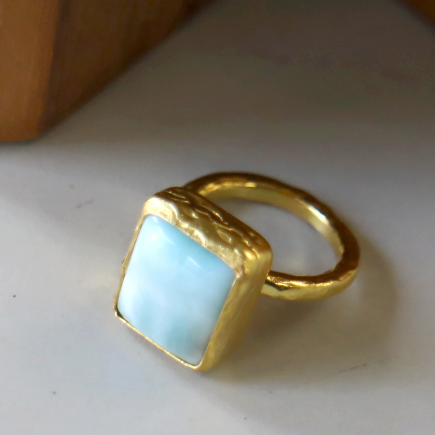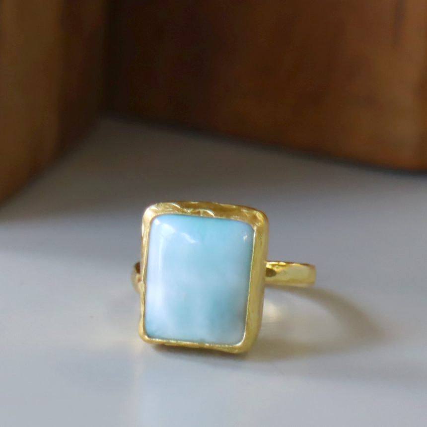 雲が浮かぶ青空のような模様が広がる、清々しいブルーが美しいラリマーのリングです。イエローゴールドとの組み合わせが上品です。シンプルなデザインは石の本来の美しさを引き立てます。