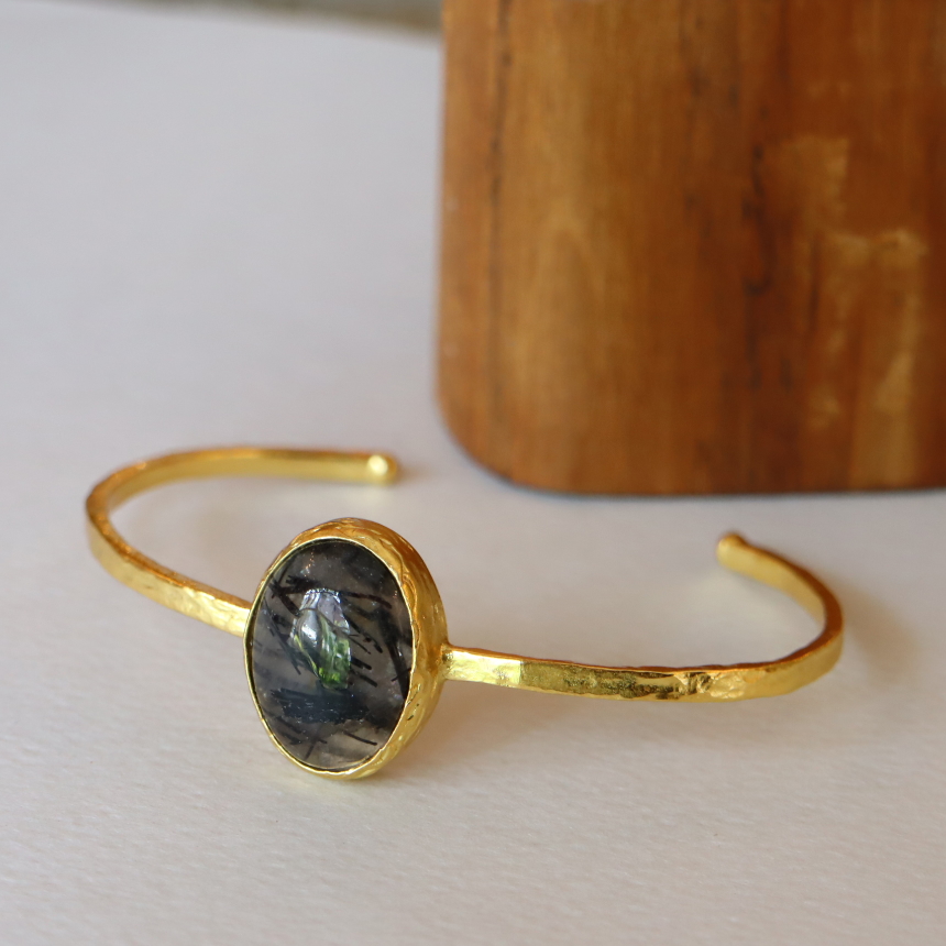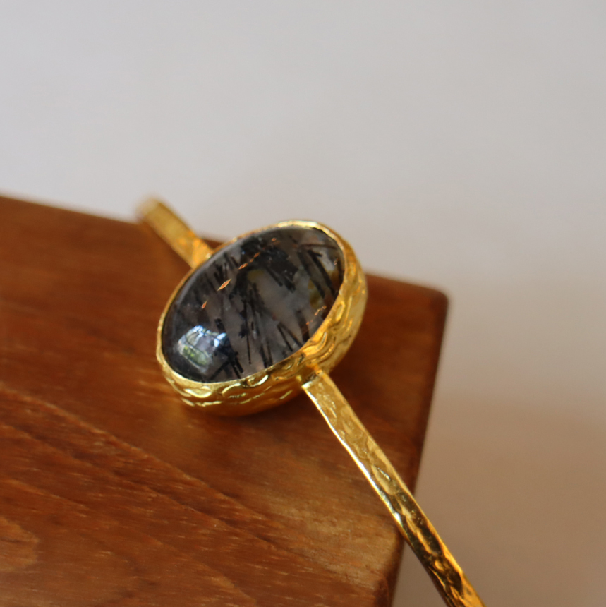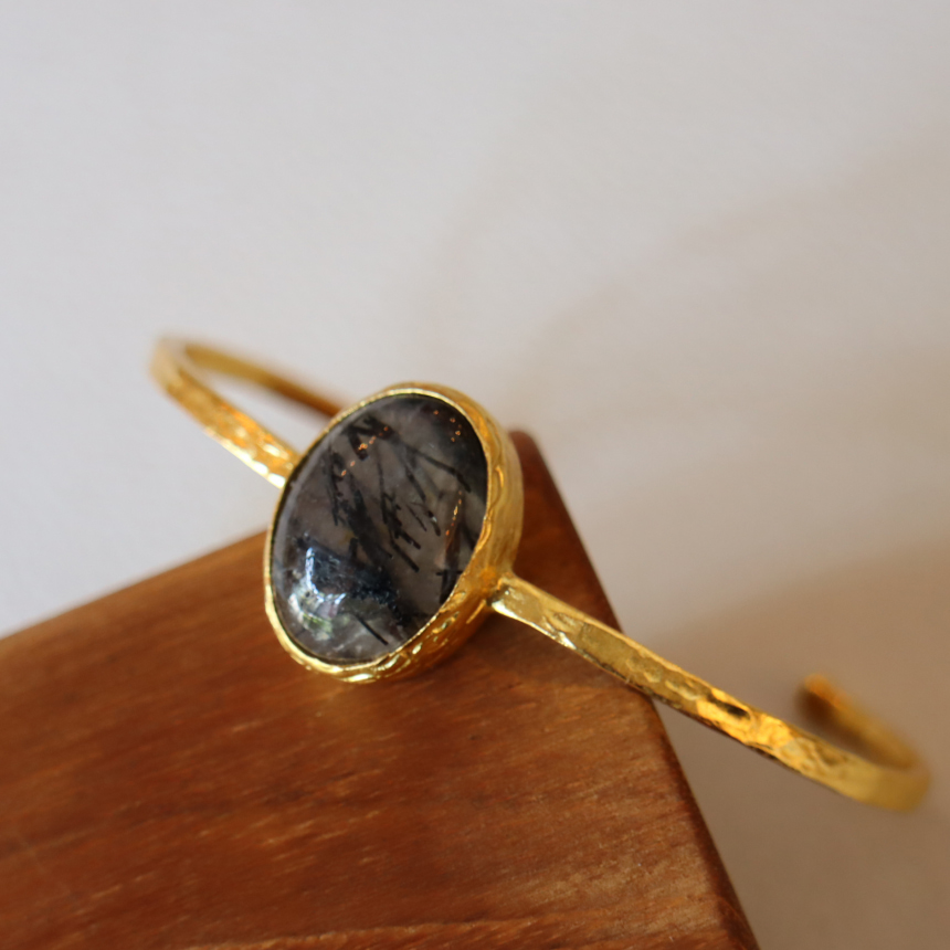 白く濁った水晶の中に薄いブラックの針状結晶(ルチル)が美しく輝く、珍しいブラックルチルクォーツのバングル。コロンとした立体的なカボションカットに光がさし込み存在感を放ちます。
