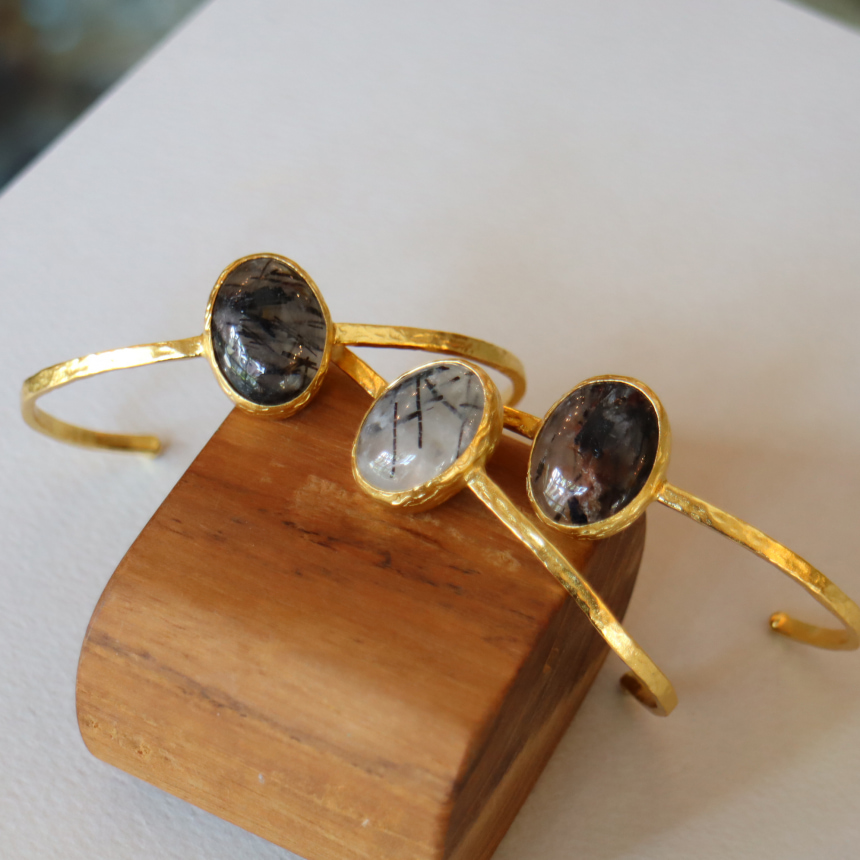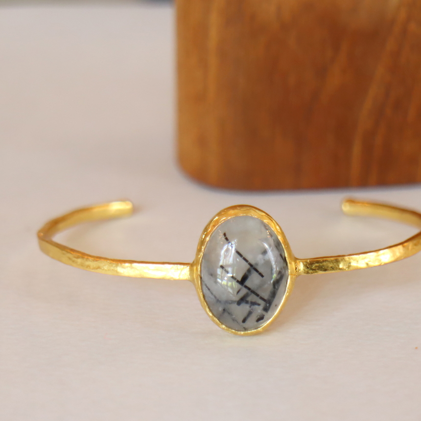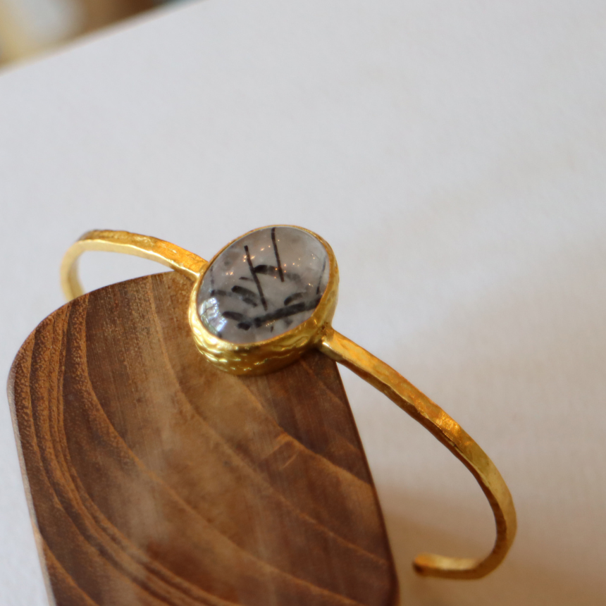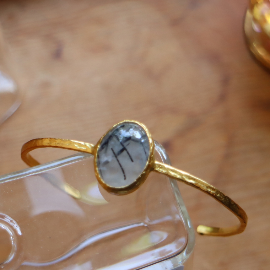 白く濁った水晶の中に薄いブラックの針状結晶(ルチル)が美しく輝く、珍しいブラックルチルクォーツのバングル。コロンとした立体的なカボションカットに光がさし込み存在感を放ちます。