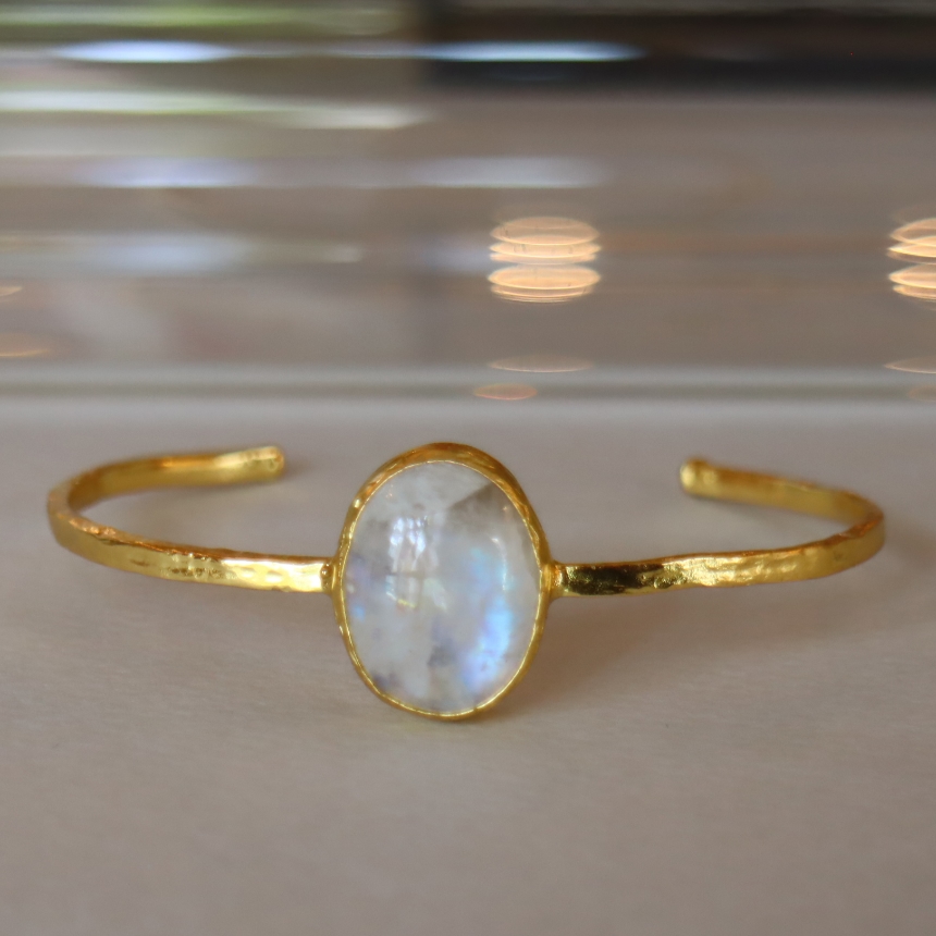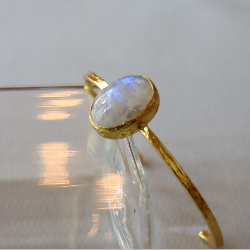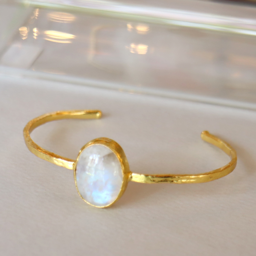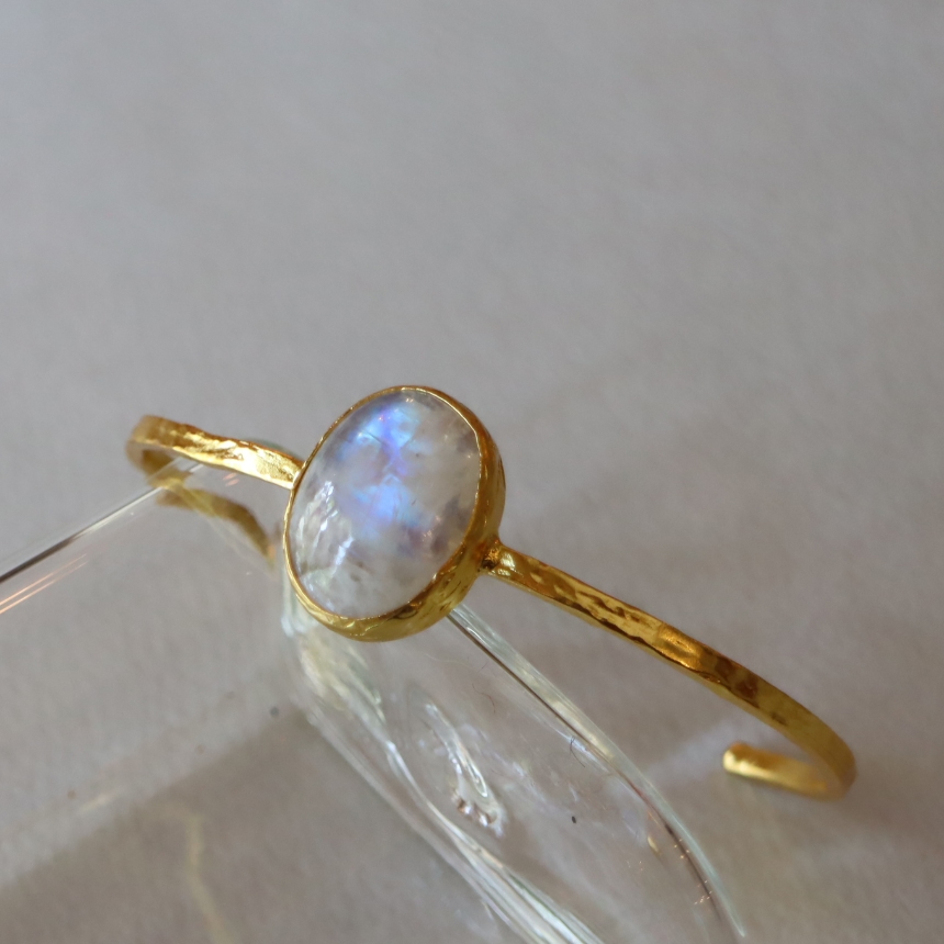 乳白色の大粒の石に幻想的なシラー(虹色の輝き)が美しい存在感のあるバングルです。ぷっくりとしたオーバル型のムーンストーンは、艶やかで上品な印象です。
