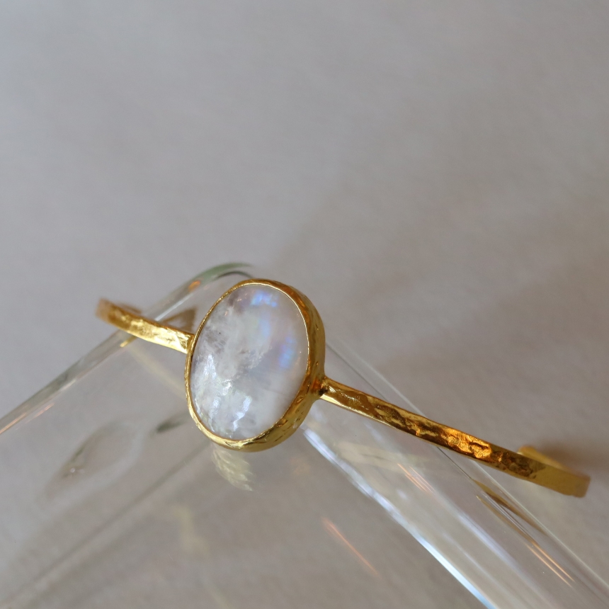 乳白色の大粒の石に幻想的なシラー(虹色の輝き)が美しい存在感のあるバングルです。ぷっくりとしたオーバル型のムーンストーンは、艶やかで上品な印象です。