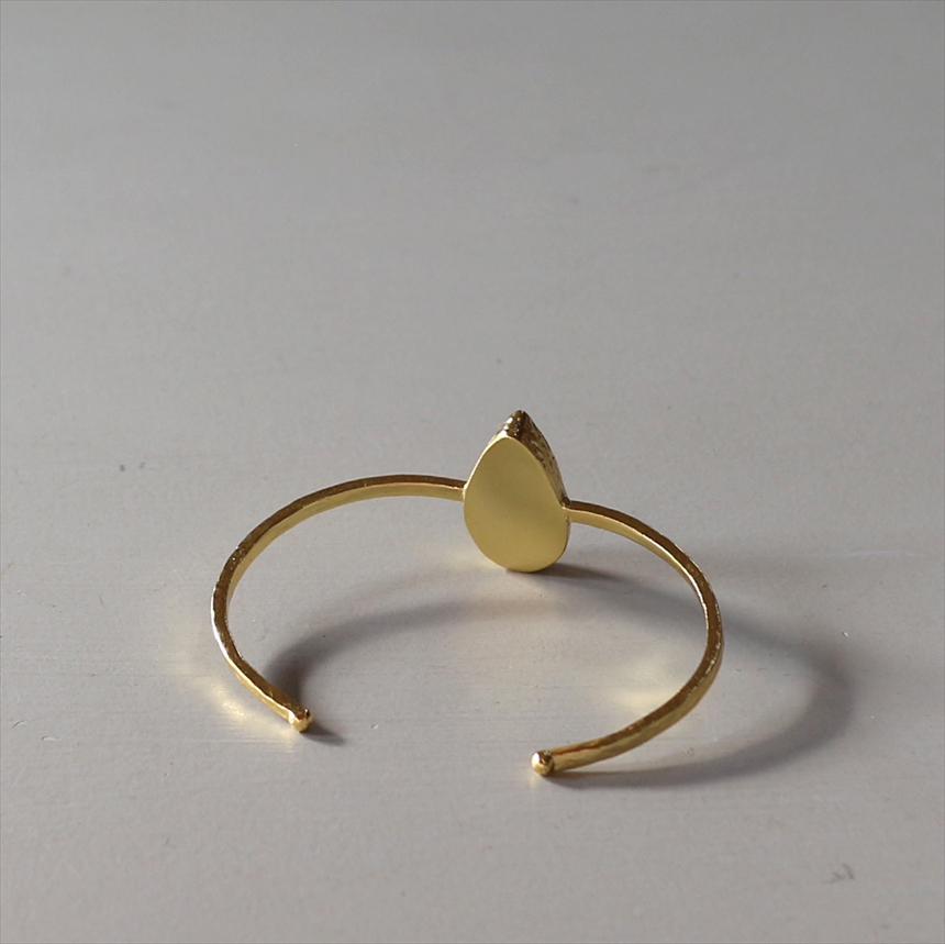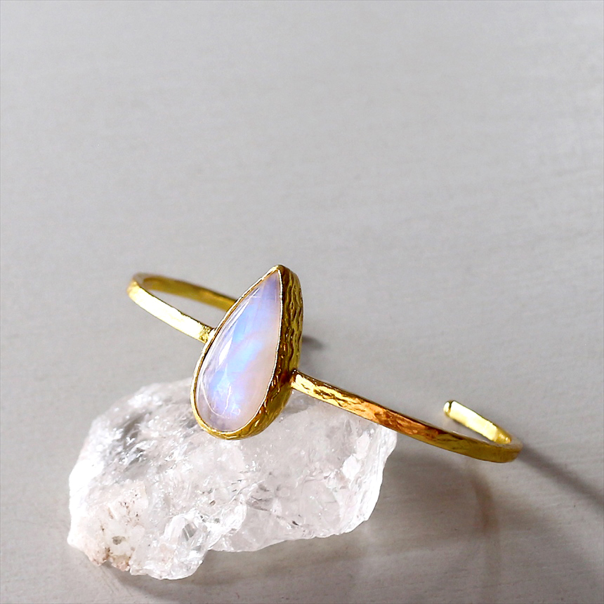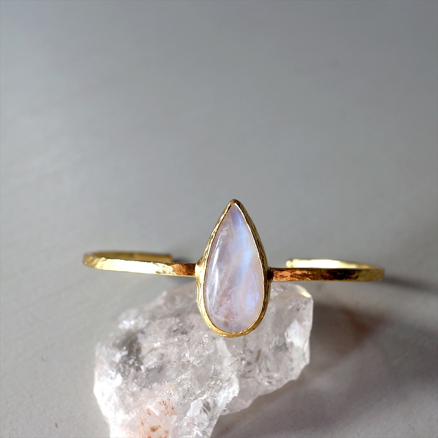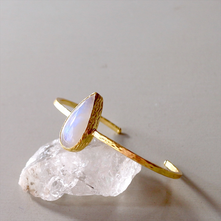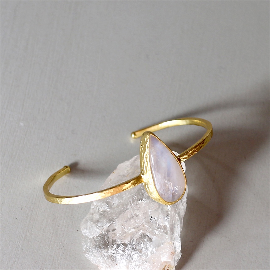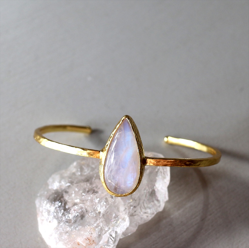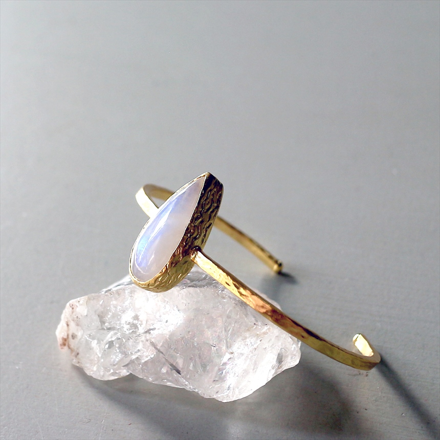 神秘的な月光を閉じ込めたかのような、美しいムーンストーンのバングルです。ぷっくりとした厚みのあるカボションカットが施されているため、光を内側からとらえ、虹色のシラーがより立体的に、そしてダイナミックに現れます。華奢なゴールドアームとのバランスが洗練された雰囲気を演出します。
