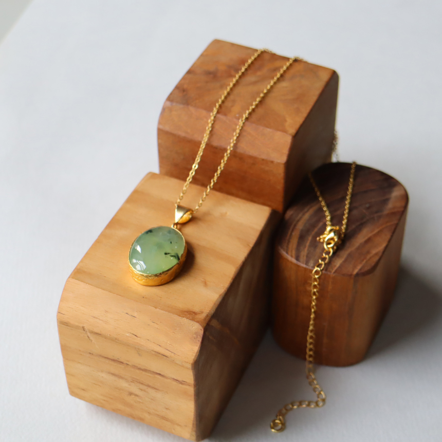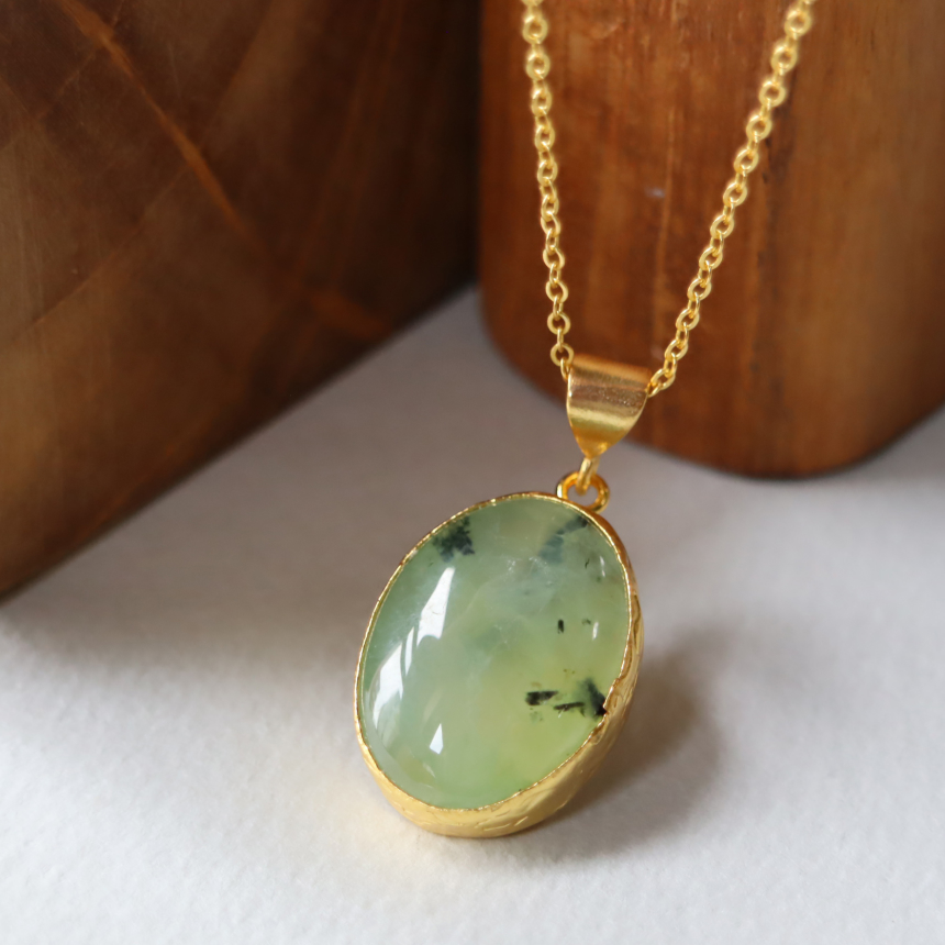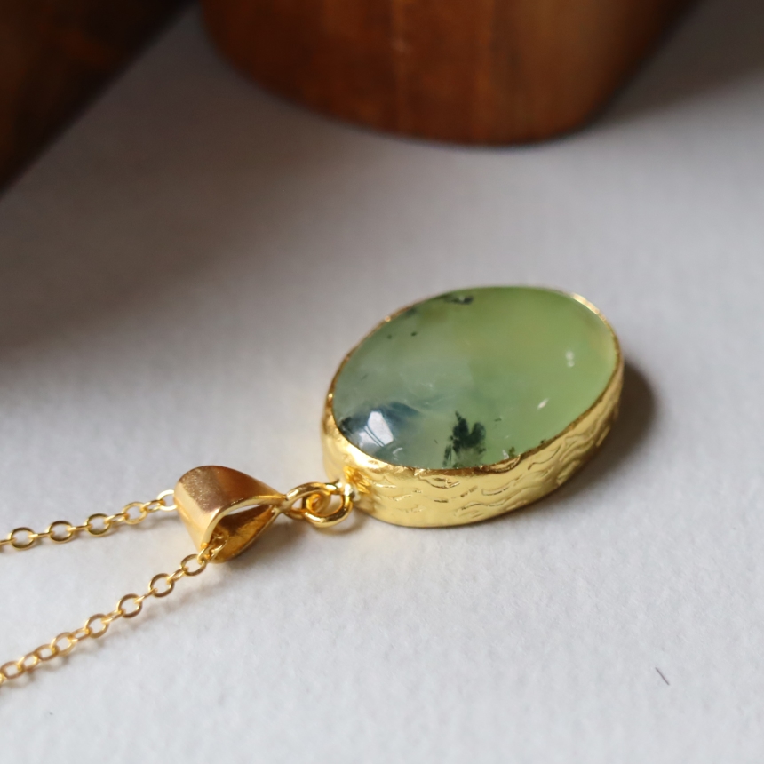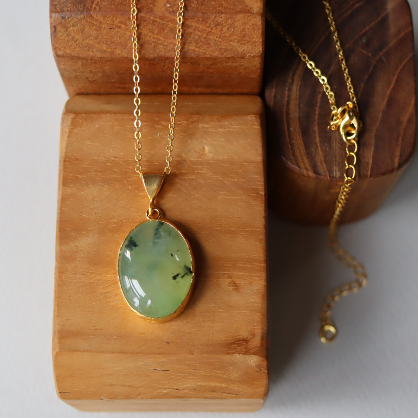 深みあるナチュラルグリーンが特徴のプレナイトのペンダントです。奥深い色彩が幻想的で静かな存在感を放ちます。1mmの細身のチェーンは、45cmから55cmまで長さが調節できて、その日の装いに合わせてお楽しみいただけます。