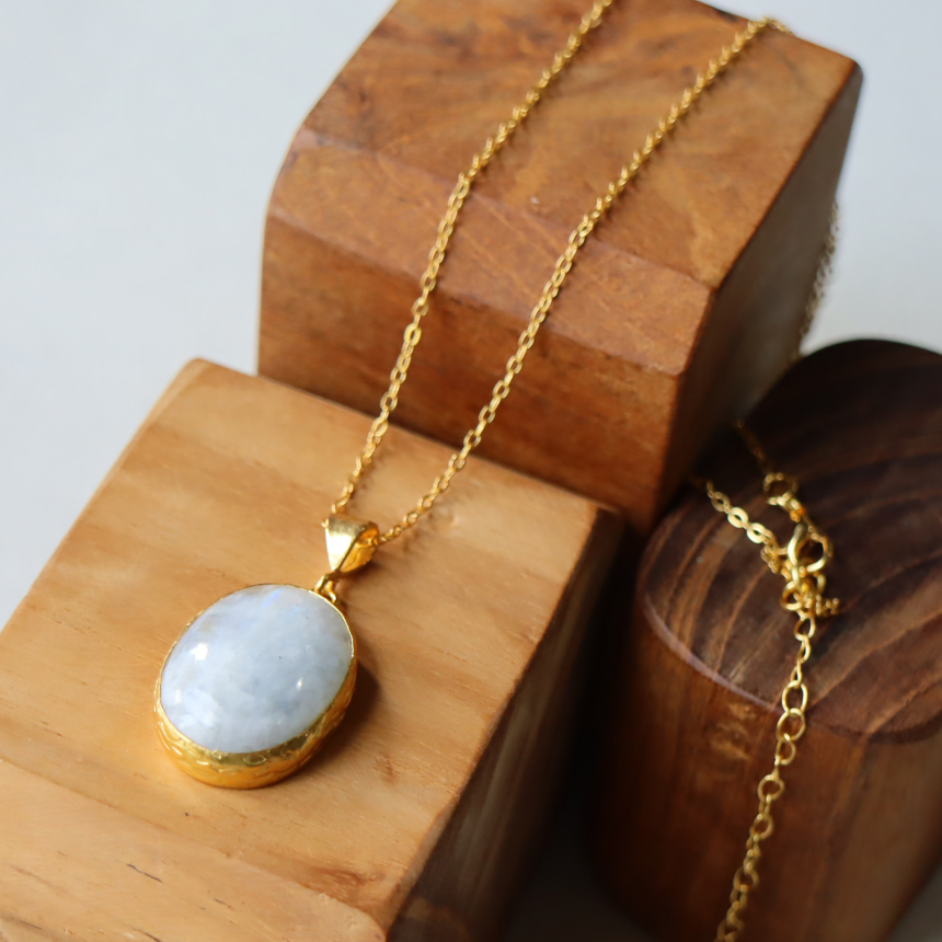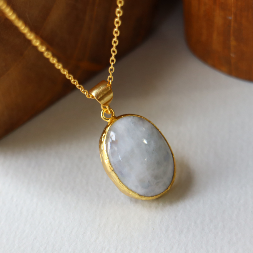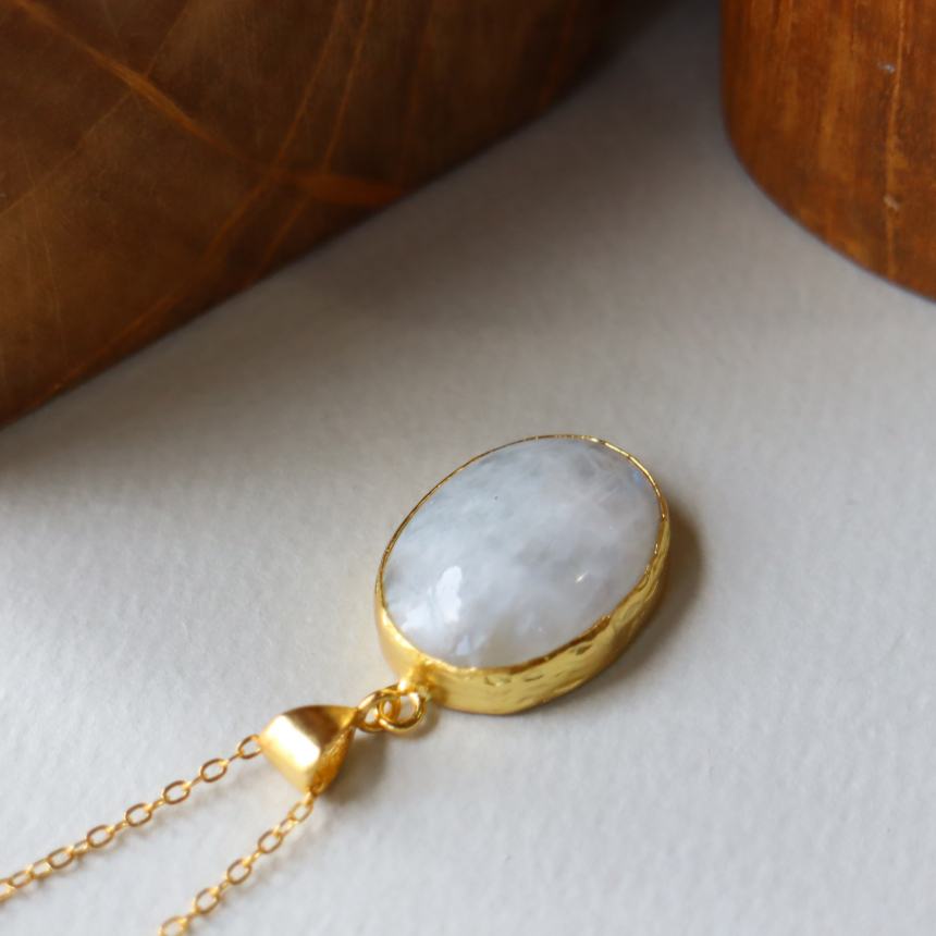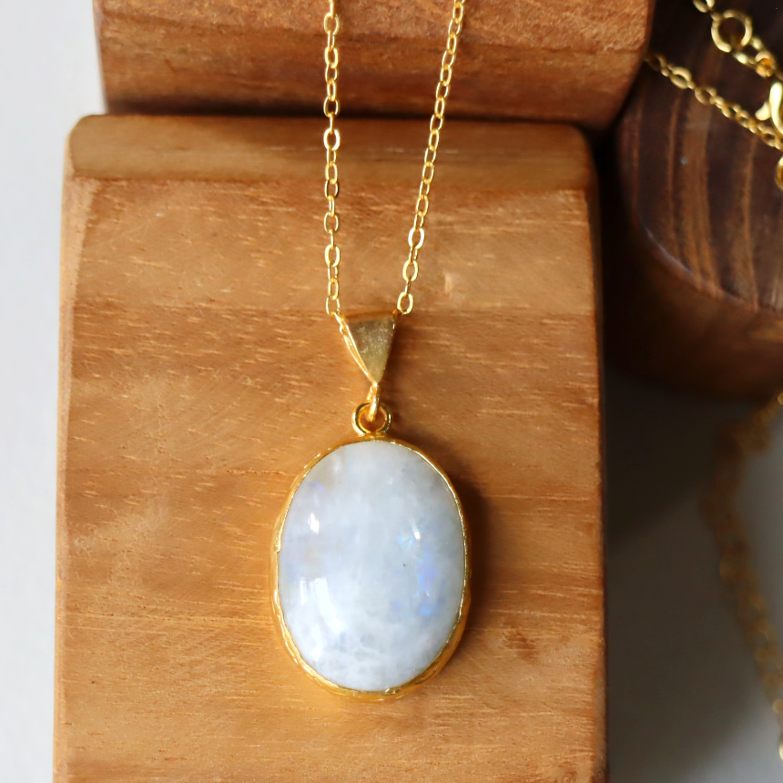 乳白色の大粒の石に幻想的なシラー(虹色の輝き)が美しい存在感のあるレインボームーンストーンのペンダントです。マットなゴールド色の台座は石の形にぴったり合わせて手作りされています。1mmの細身のチェーンは、45cmから55cmまで長さが調節できて、その日の装いに合わせてお楽しみいただけます。