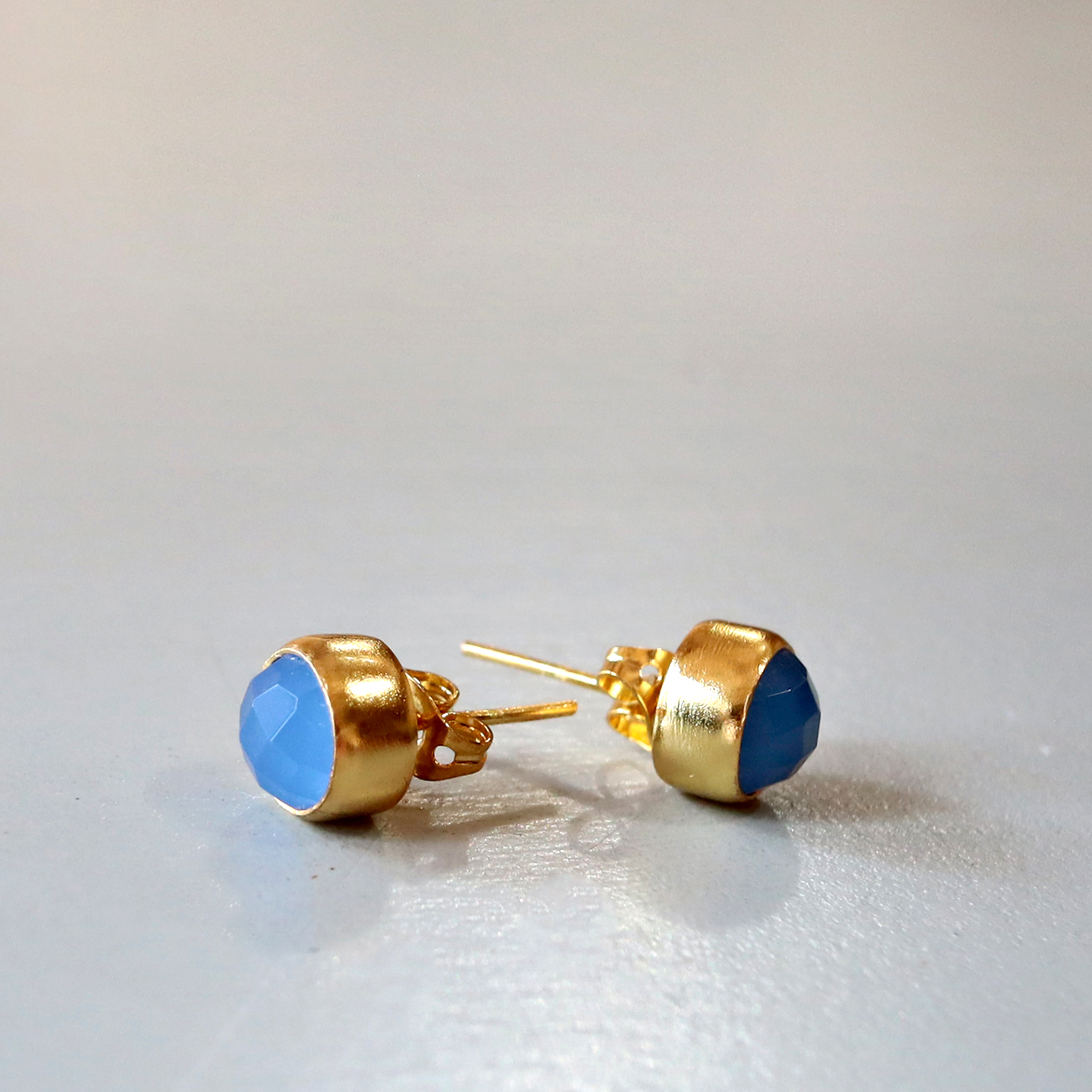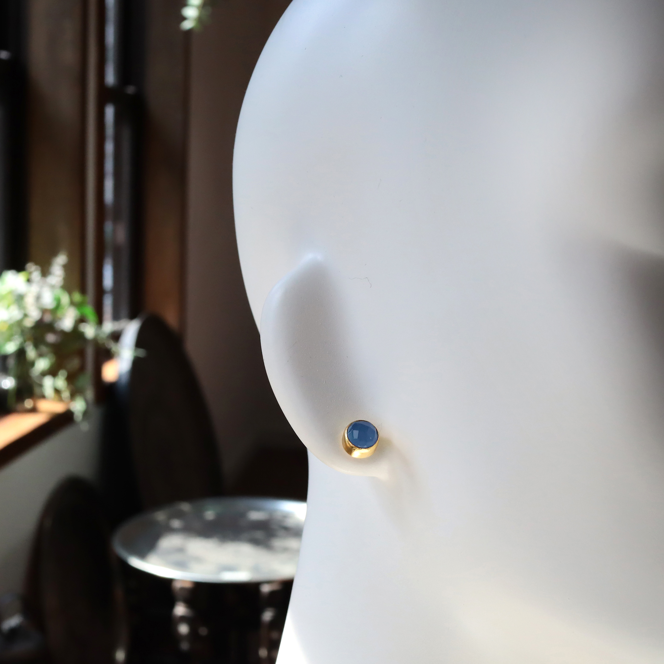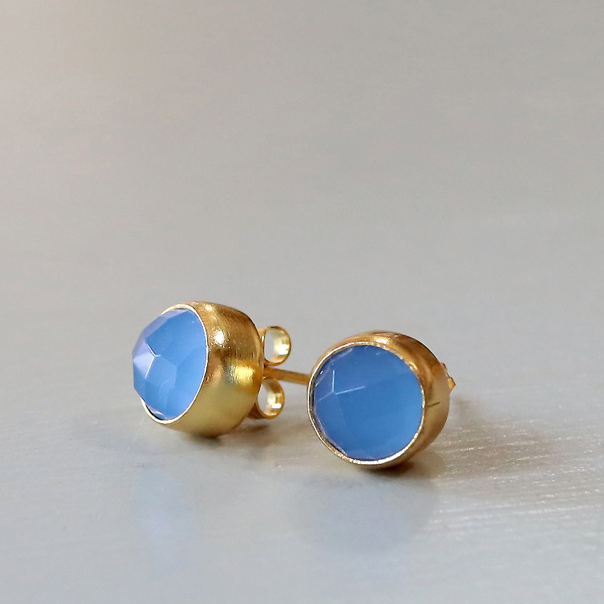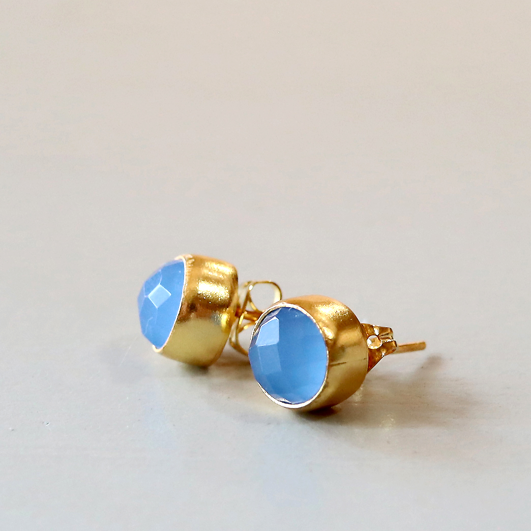 乳白色の淡いやわらかな青みが印象的なブルーカルセドニー。コロンとしたまるでつぼみのようなかわいらしいピアスです。小ぶりながらも厚みがあり、ローズカットが施されているので存在感を放ちます。