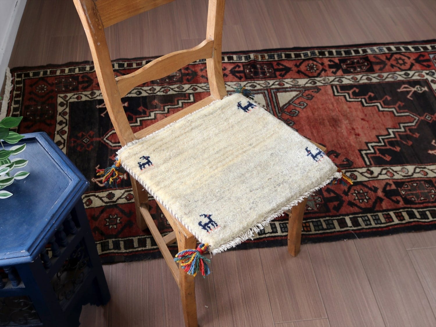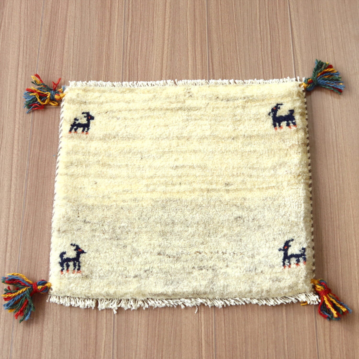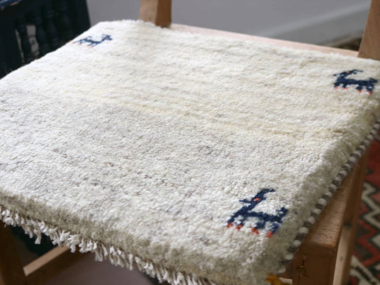 動物のモチーフがワンポイント織り込まれたシンプルなギャッベ。ベースのアイボリー色は、染めていない羊毛の色がそのまま使われています。
