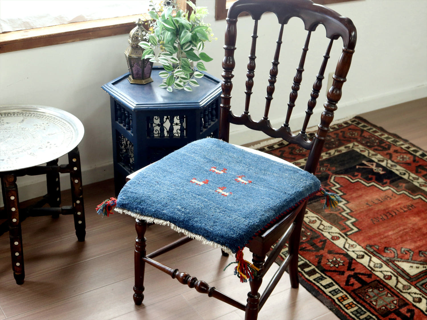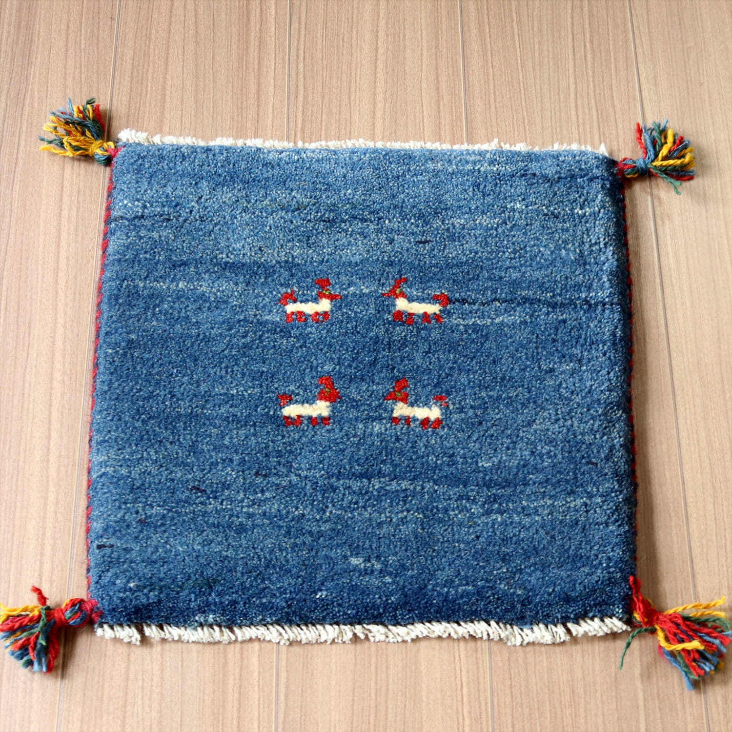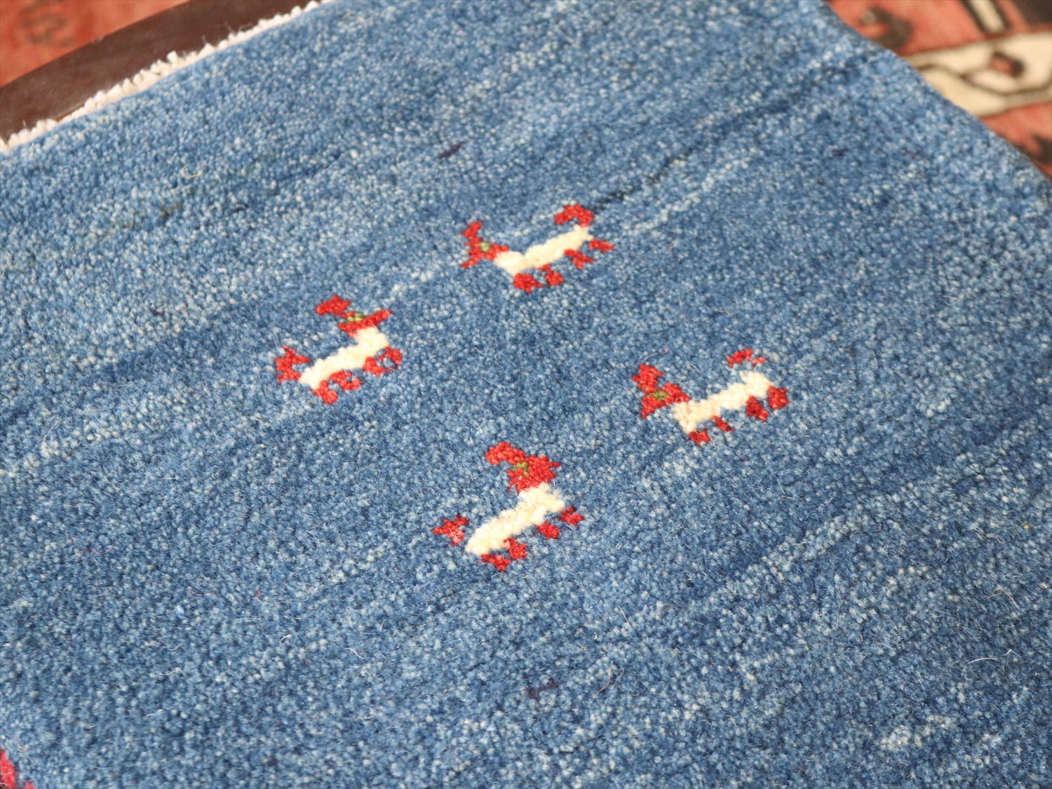 インディゴ藍で染めたブルーをベースに、動物モチーフがワンポイント織り込まれているシンプルなデザインのギャッベ。