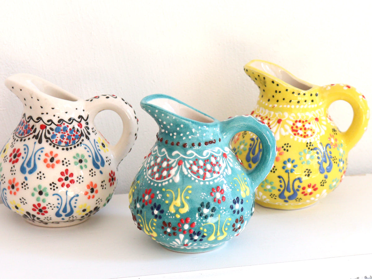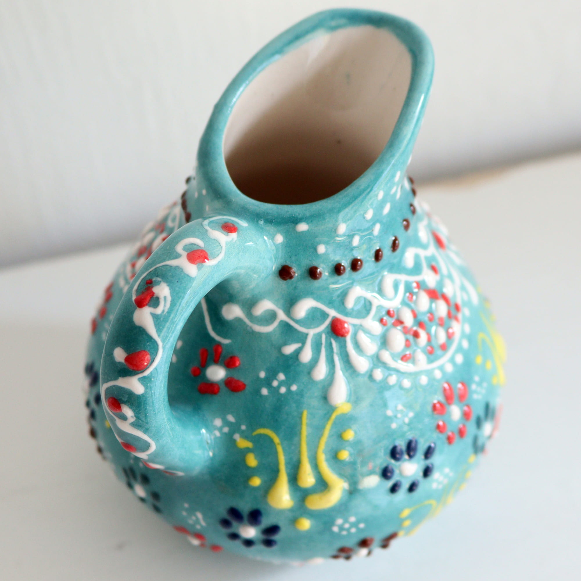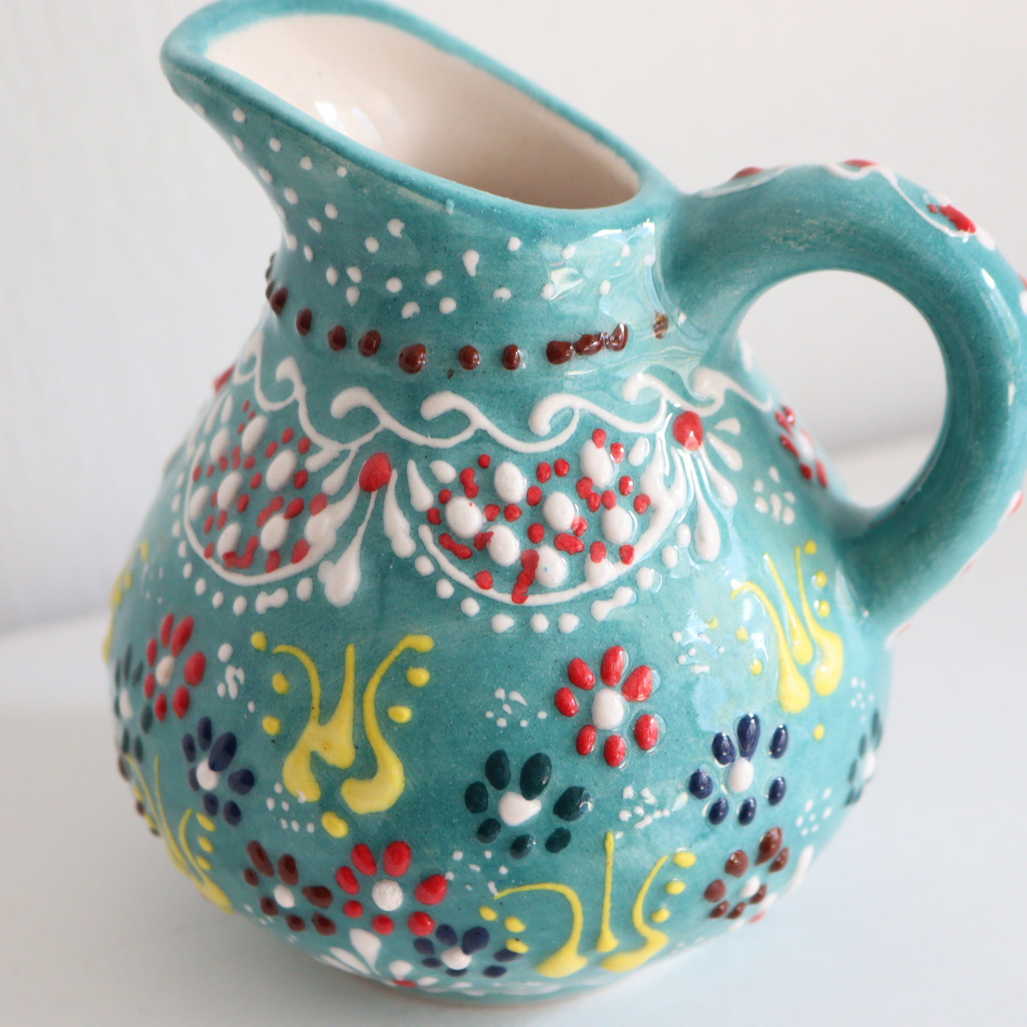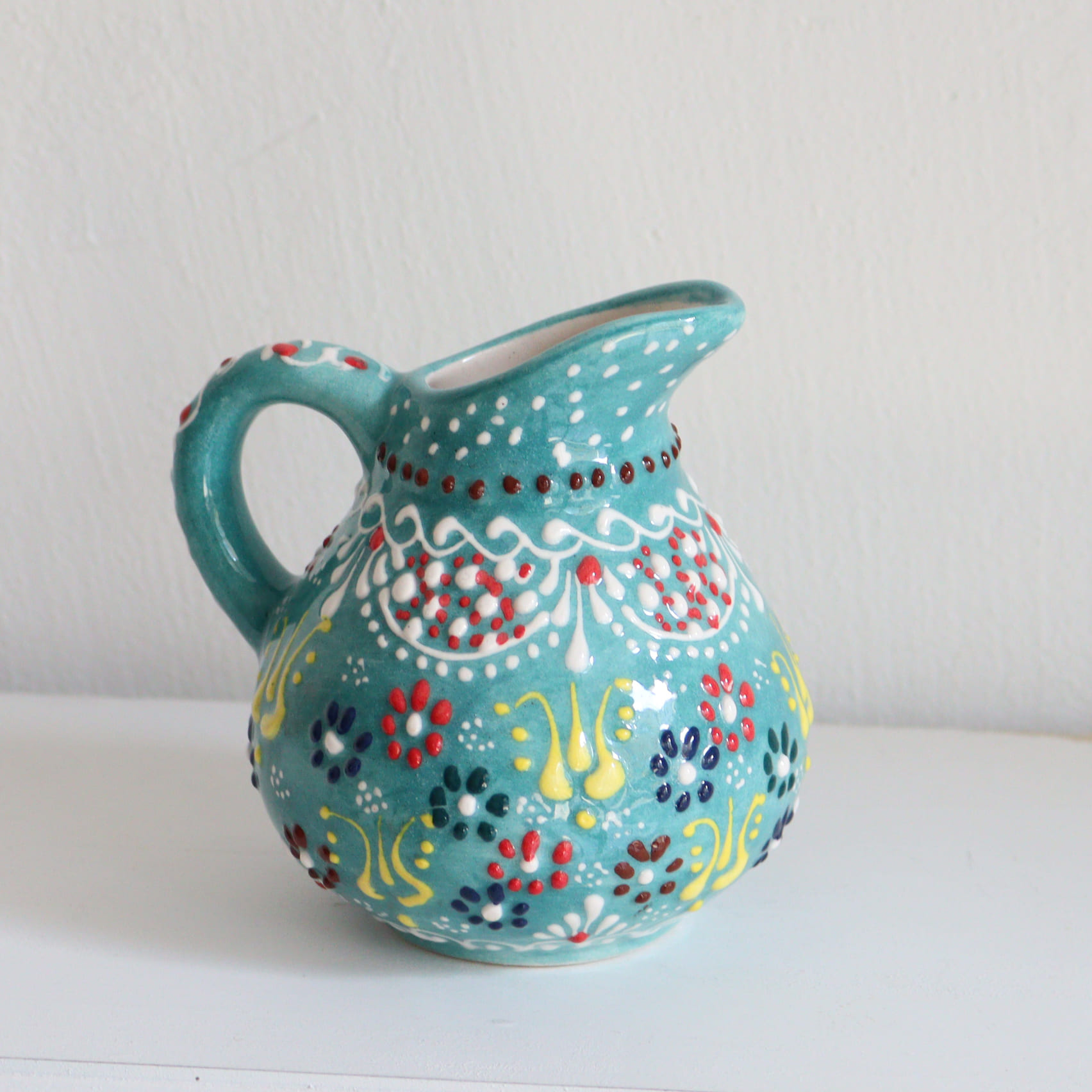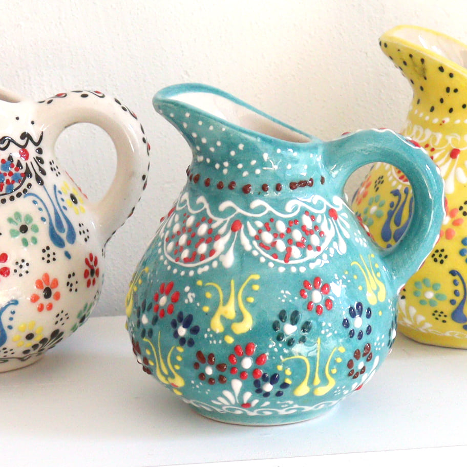 トルコの陶器産業の中心地・キュタフヤで作られています。ミルクピッチャーの形をした凹凸あるテクスチャでカラフルなフラワーデザインが手書きで描かれています。お部屋のインテリアやショップのディスプレイとしても使える陶器です。