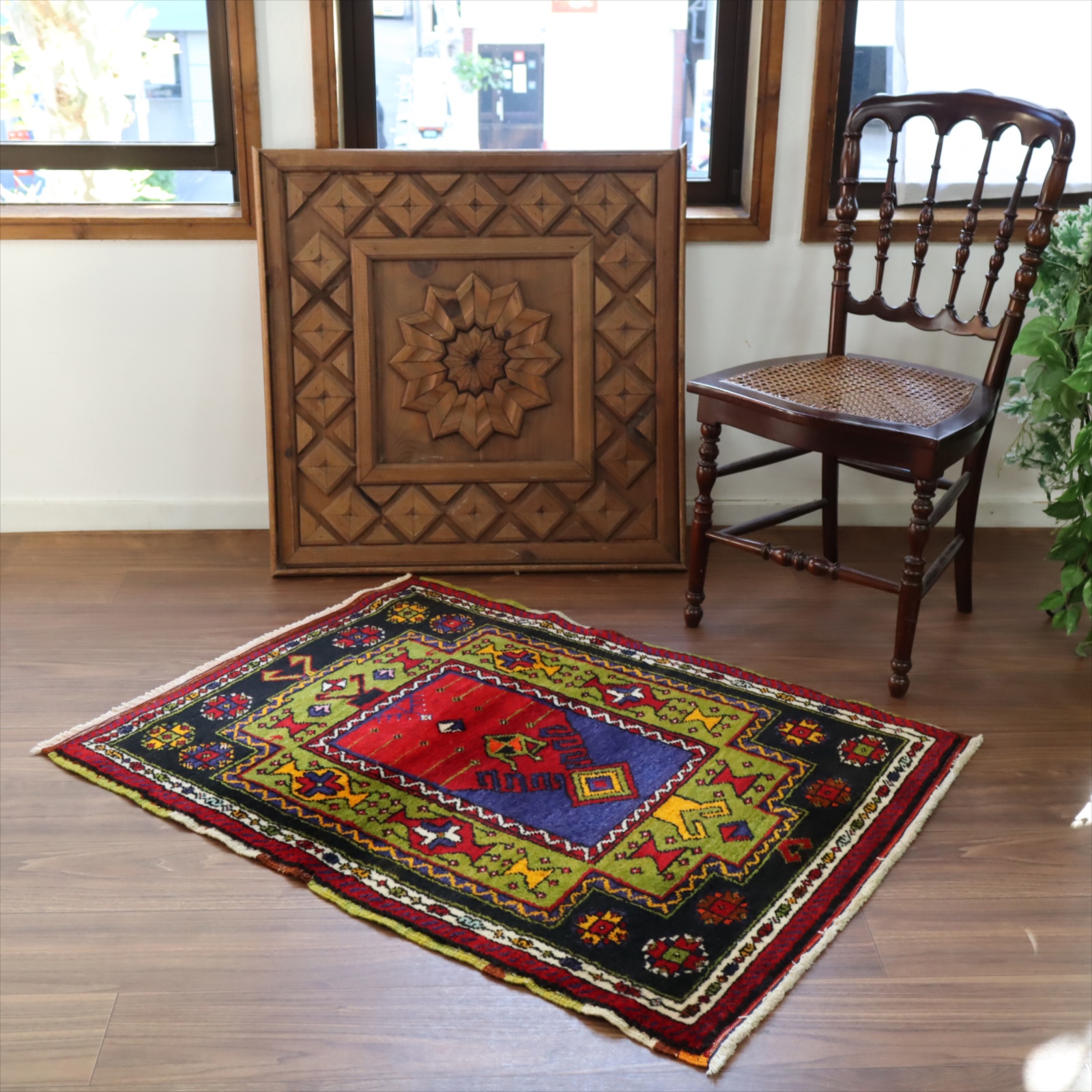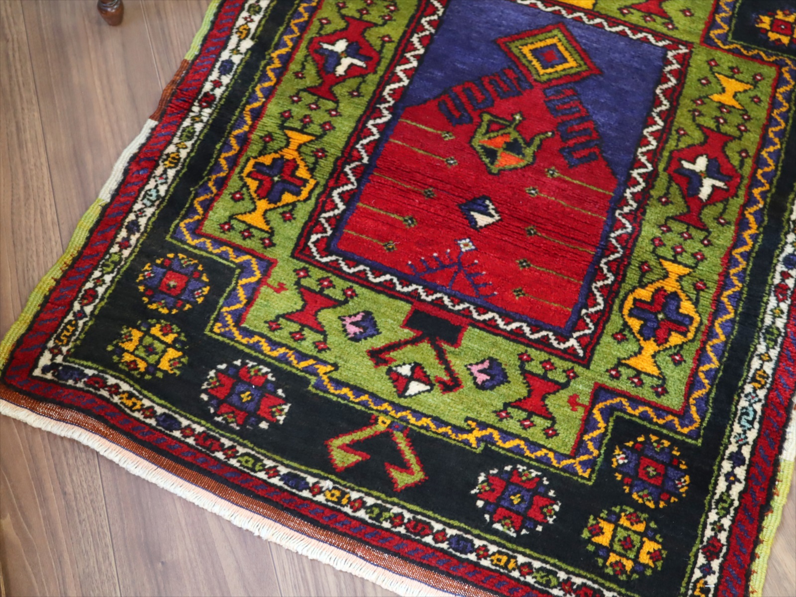 グリーン系の色糸を使った明るい雰囲気の絨毯です。お祈りの方向を示すミフラープ(三角の屋根のようなデザイン)が中央に織り込まれた、トルコ絨毯ならではの上下非対称のデザイン。ミフラープの中には、水差しのようなオイルランプと、その下には白黒を組み合わせた陰陽のモチーフが織り込まれています。グリーンの変形ボーダーには、髪飾りのモチーフ、その外側にはソロモンの星が織り込まれ、ユニークな一枚に仕上がっています。