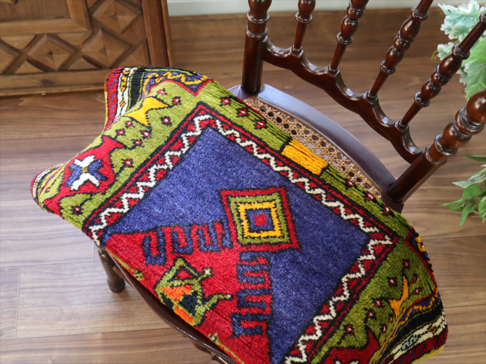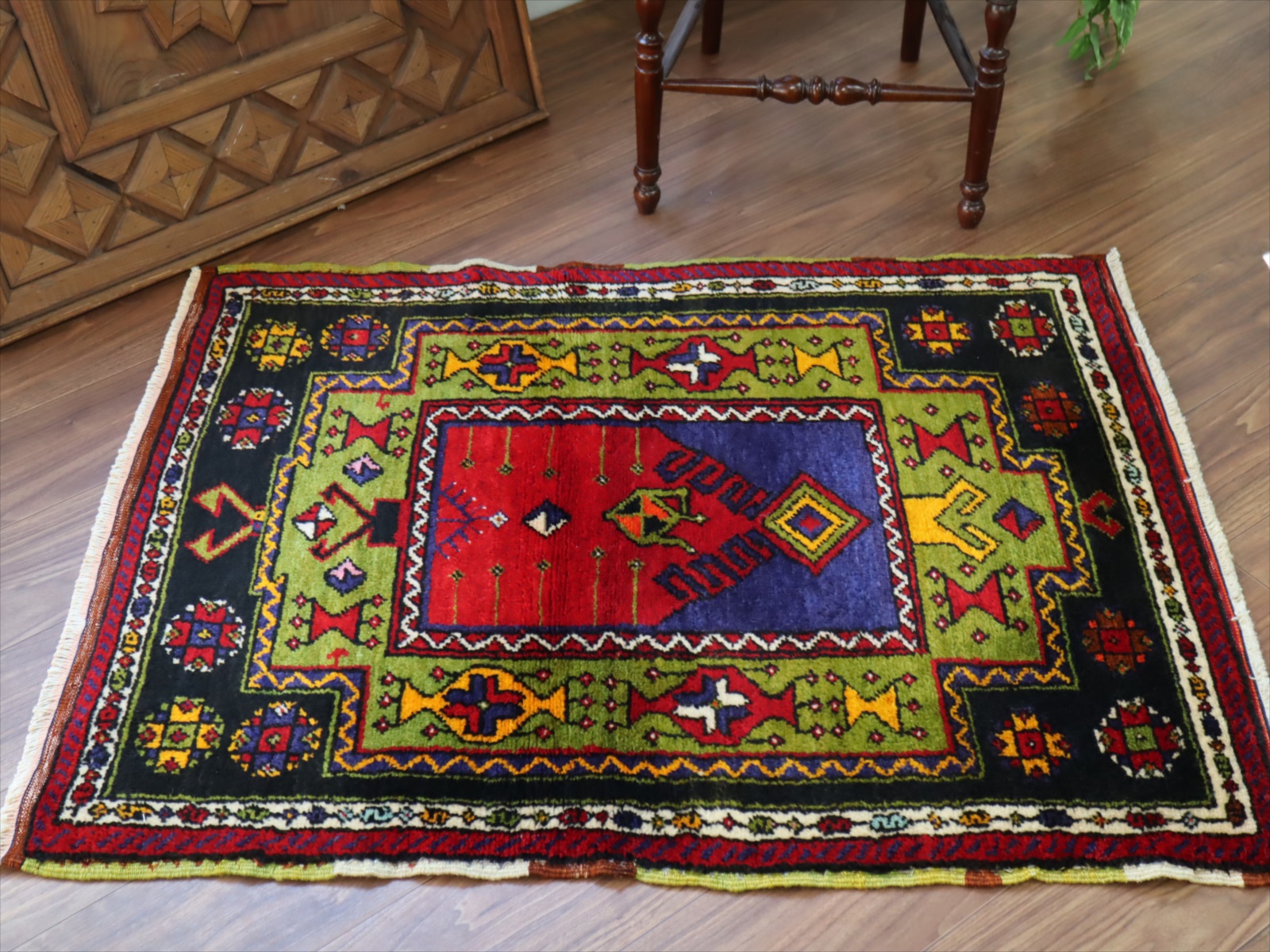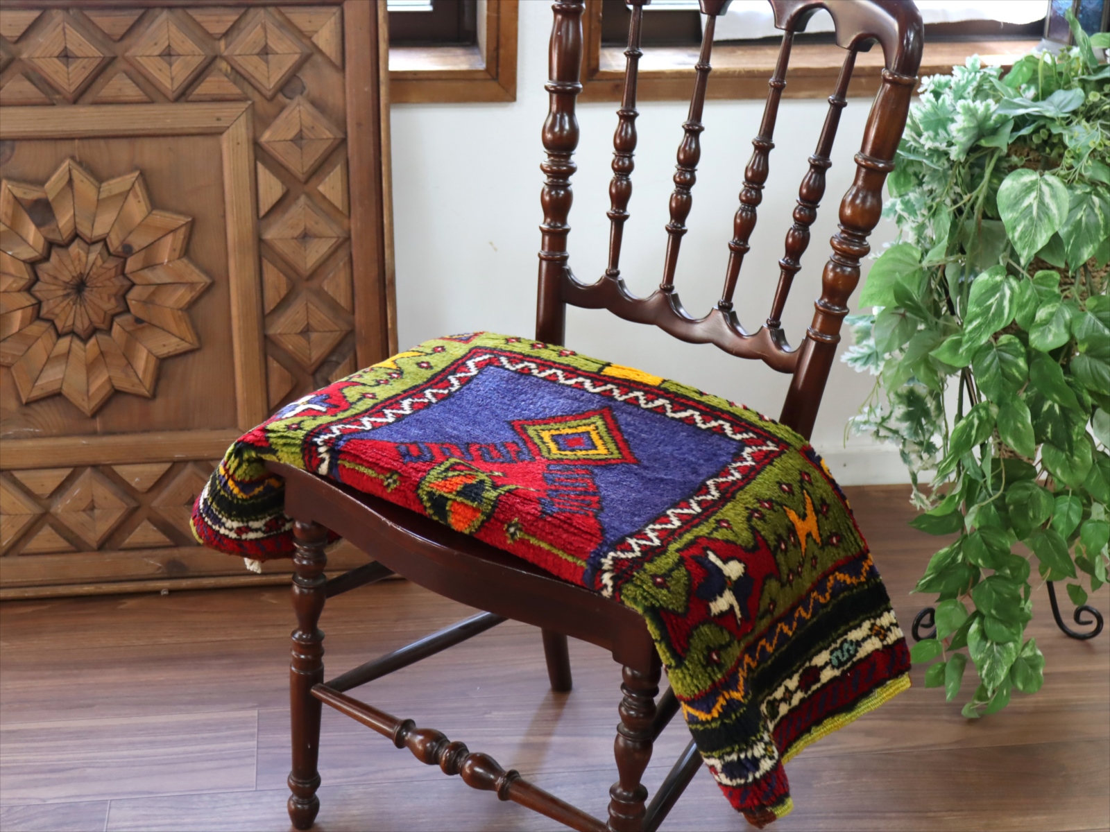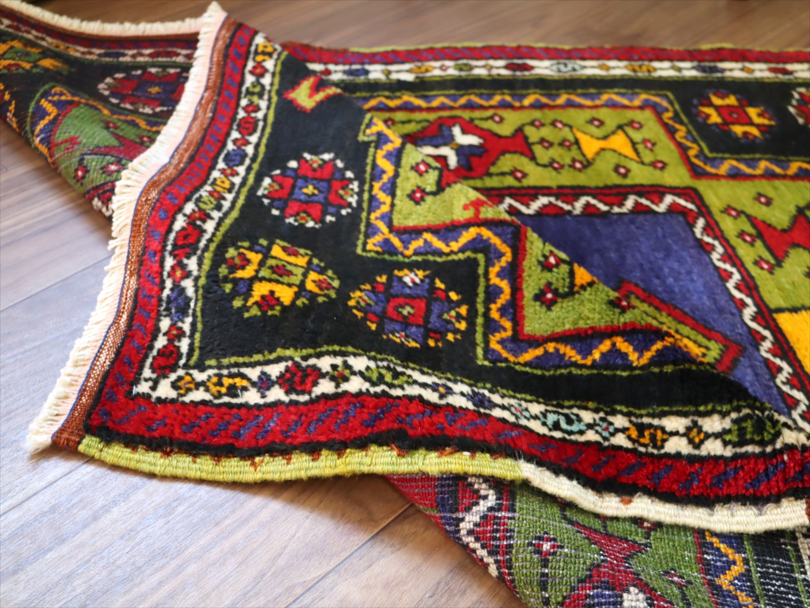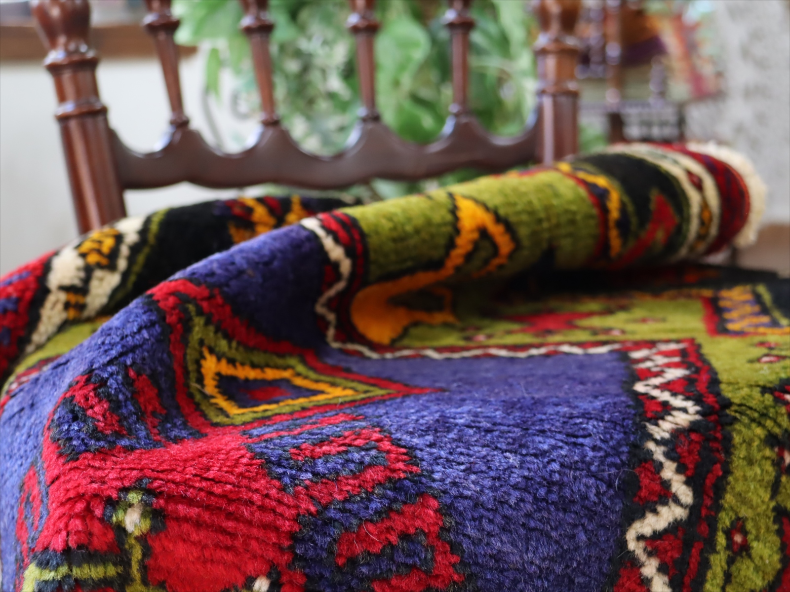色の変化と日焼けについて-----撮影したときの絨毯の状態は、色鮮やかで織りたてのようですが、お部屋に敷いて長く使っていく間に、少しずつ色褪せてやわらかな色に褪色することが予想されます。特に、紫っぽいブルー、黄緑は色褪せしやすい色です。経年変化を楽しみながら、自分でヴィンテージラグを育てていく感じでお使いください。