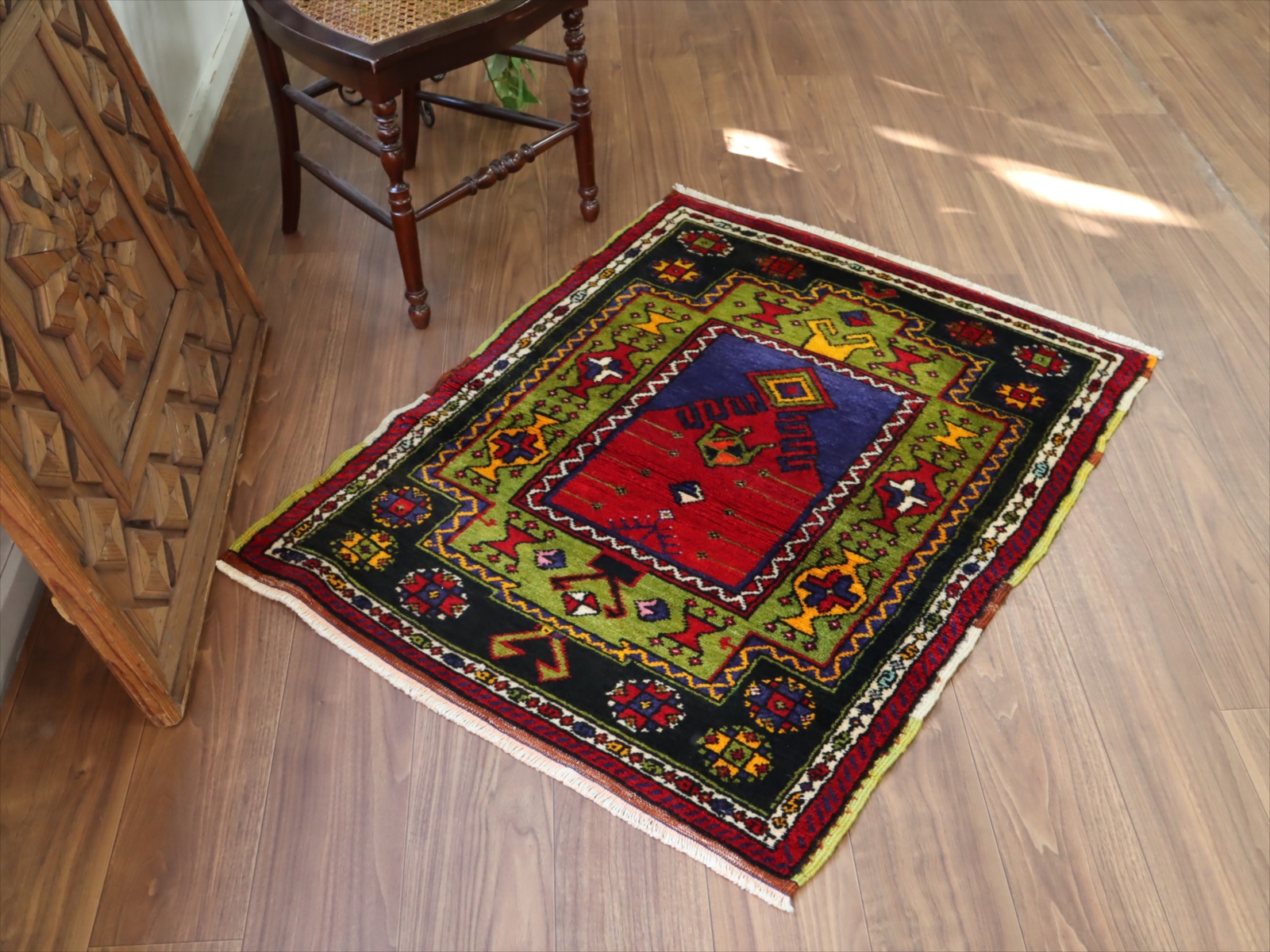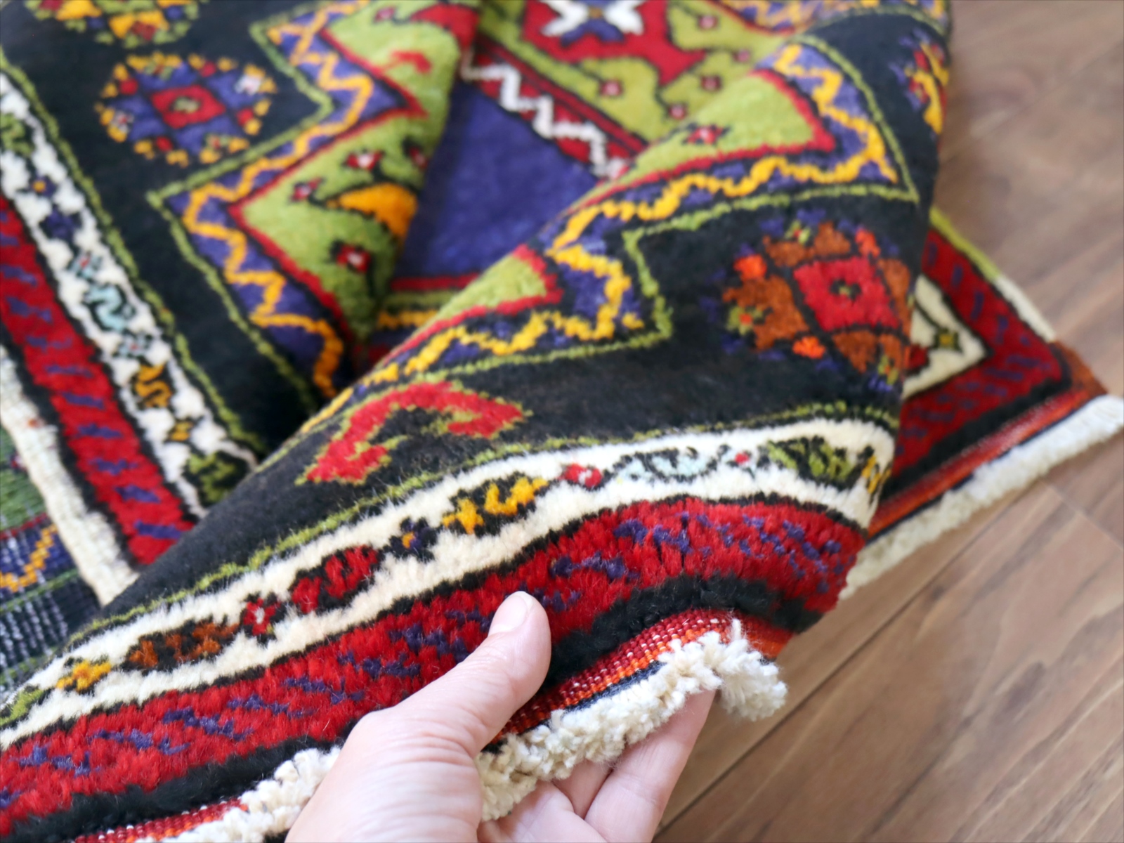 織られた当時の鮮やかな色がそのまま残っていて、年代の古さを感じさせないコンディションです。おそらく長い間サンドゥック(箪笥)に保管してあった絨毯が最近になってマーケットに出てきたものです。パイルもすり減りなどなく、きれいに残っています。やわらかくしなやかな織り地。