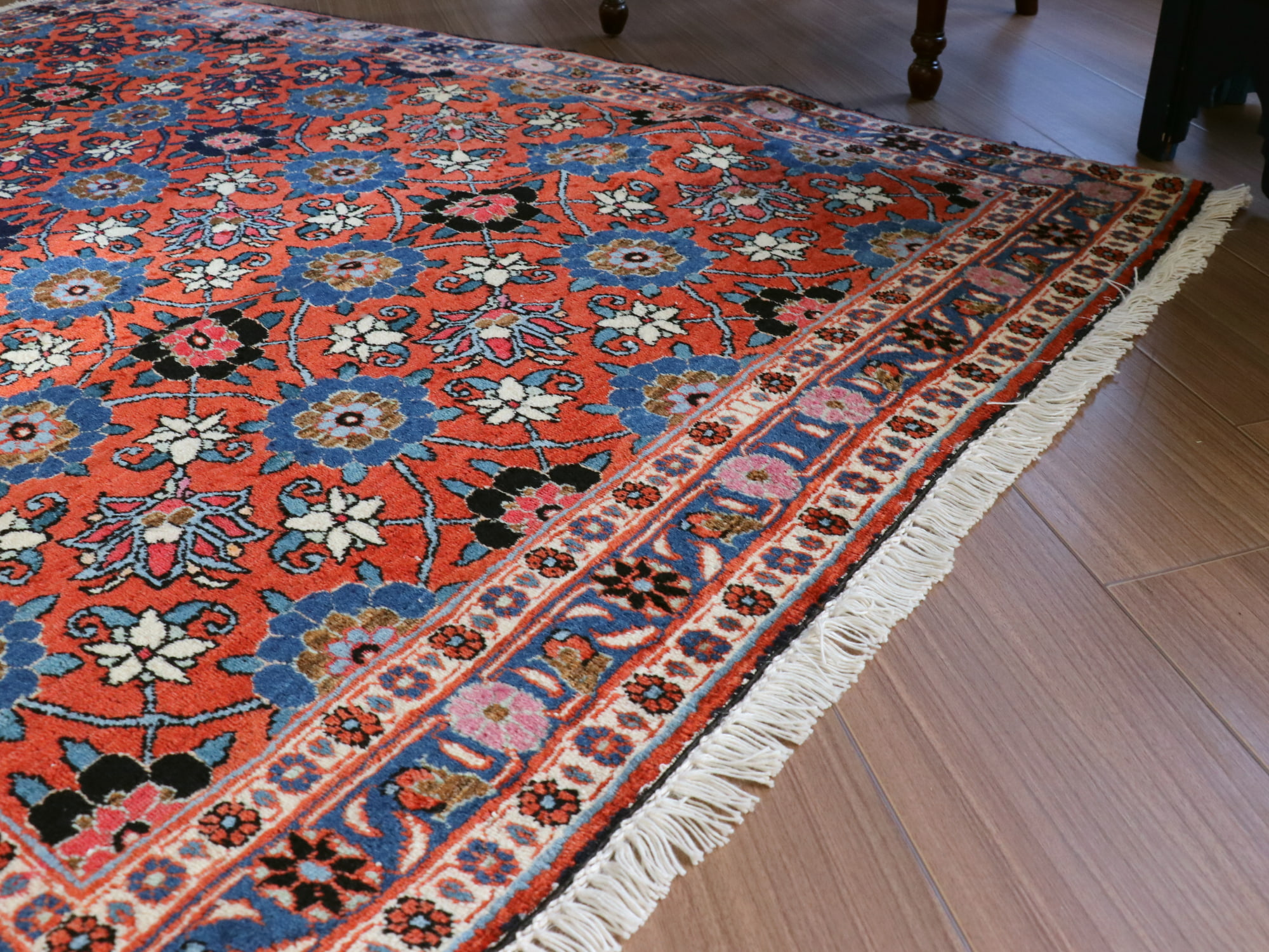 テヘランから南に50km程離れた町ヴェラミンで織られたじゅうたんです。全面総柄のデザインで、中央部分はミナカニ(Mina Khani)と呼ばれるヴェラミン地方の伝統柄の円形ラティスが連なります。花束には鳥や蝶も描かれています。中央のメダリオンがない連続模様なので、フロアに敷くとレトロなタイルのようにも見えます。アンティーク家具などと合わせた、ヨーロピアンクラシックなコーディネートに欠かせない上品な一枚。
