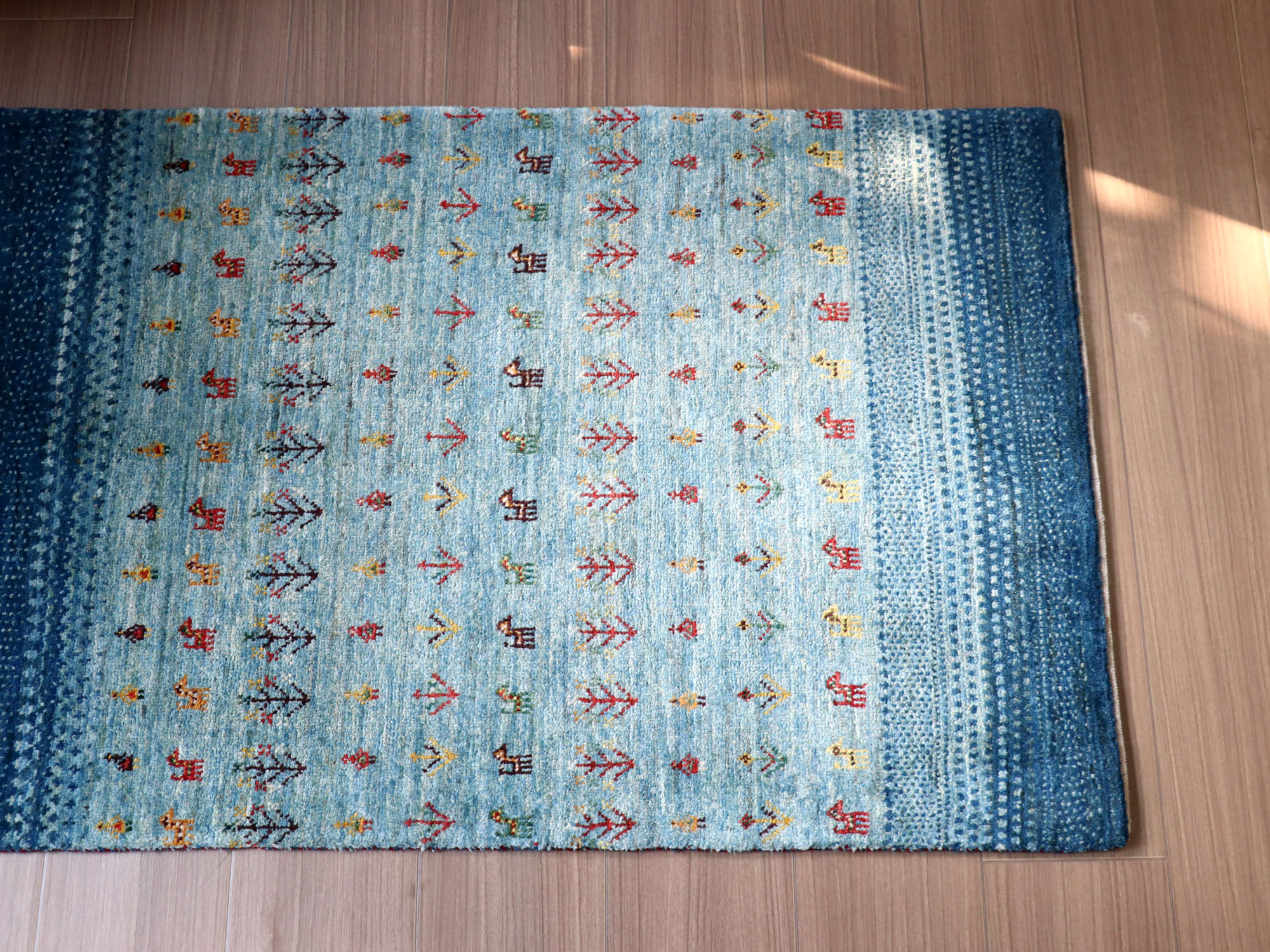 明るい水色からブルーへのグラデーション。たくさんの動物モチーフが織り込まれた、ギャッベらしいデザインです。