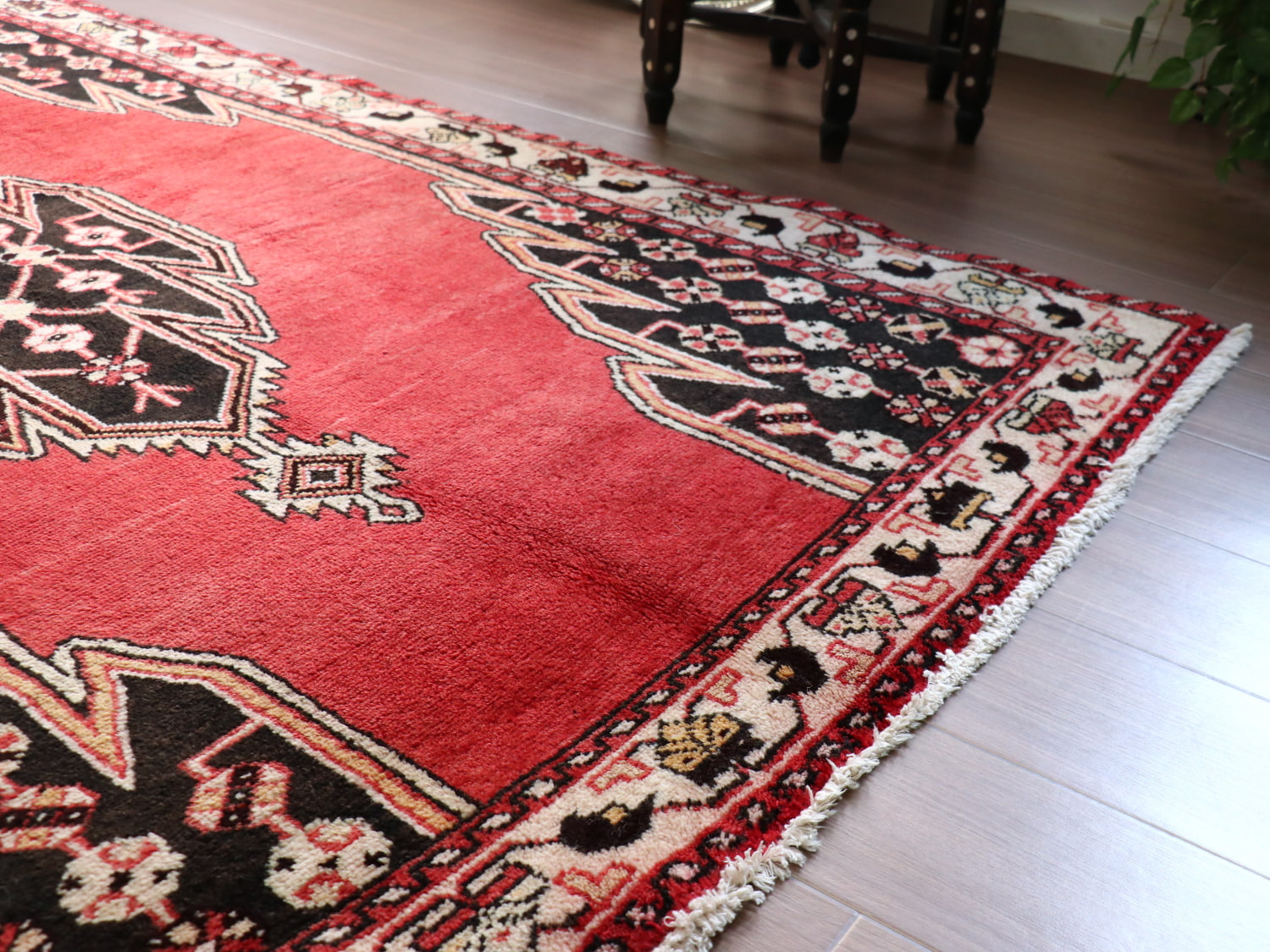 イランの首都テヘランから西へ300kmほど離れ、トルコとの国境に近いケルマンシャー、またはハマダンエリアで織られた部族絨毯です。クルド民族が多くを占めるこのエリアでは、幾何学モチーフをメインにしたトルコじゅうたんに近いデザインが多く織られています。