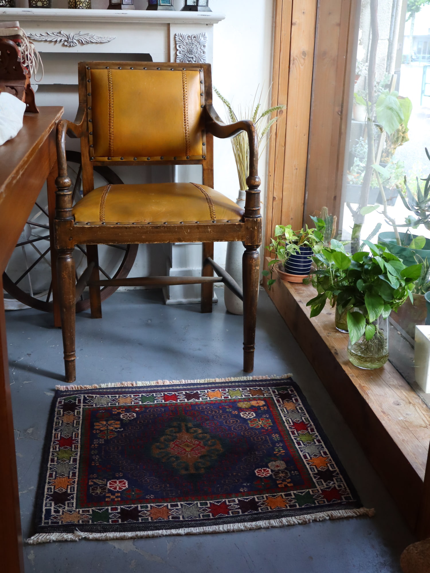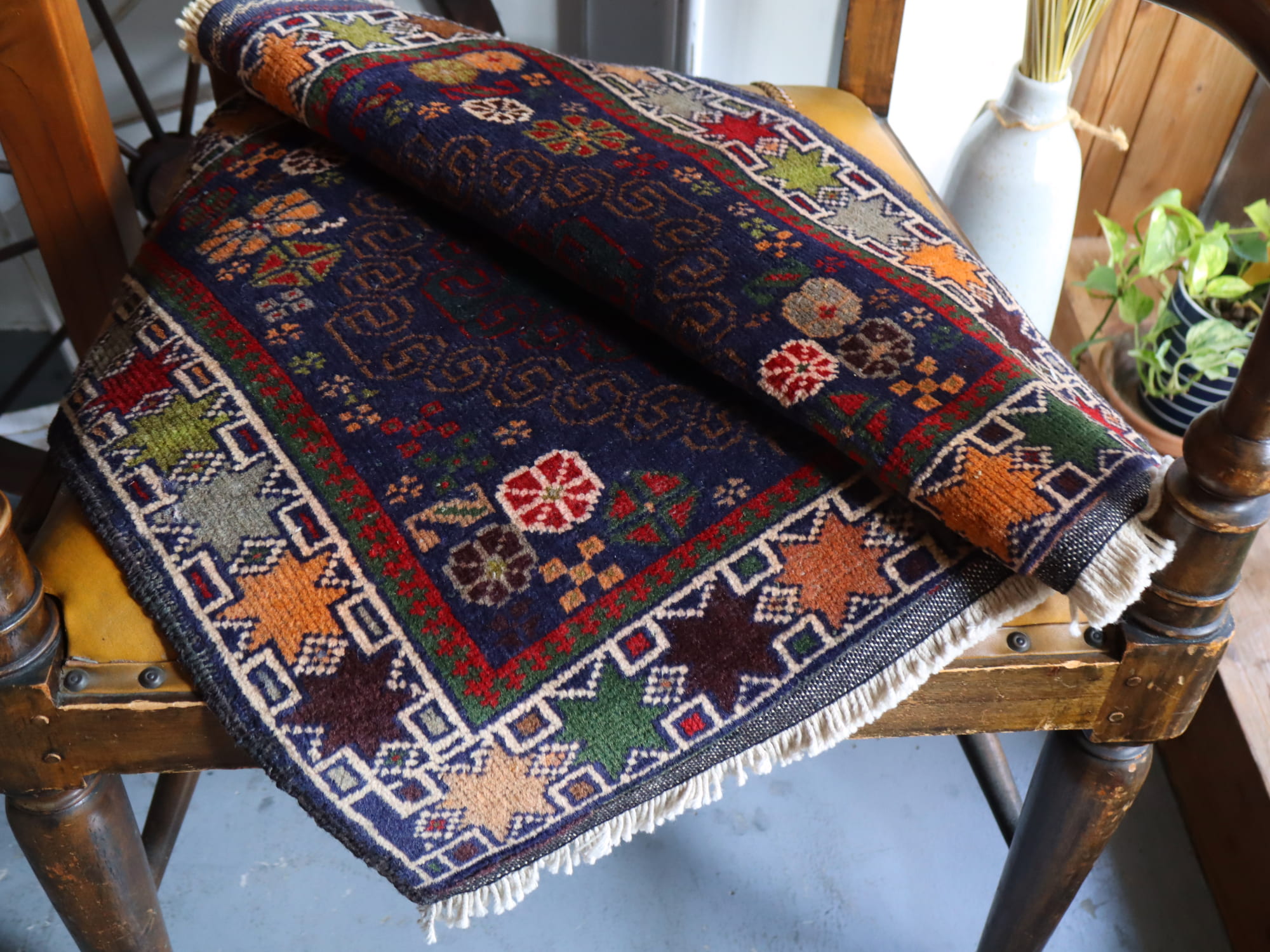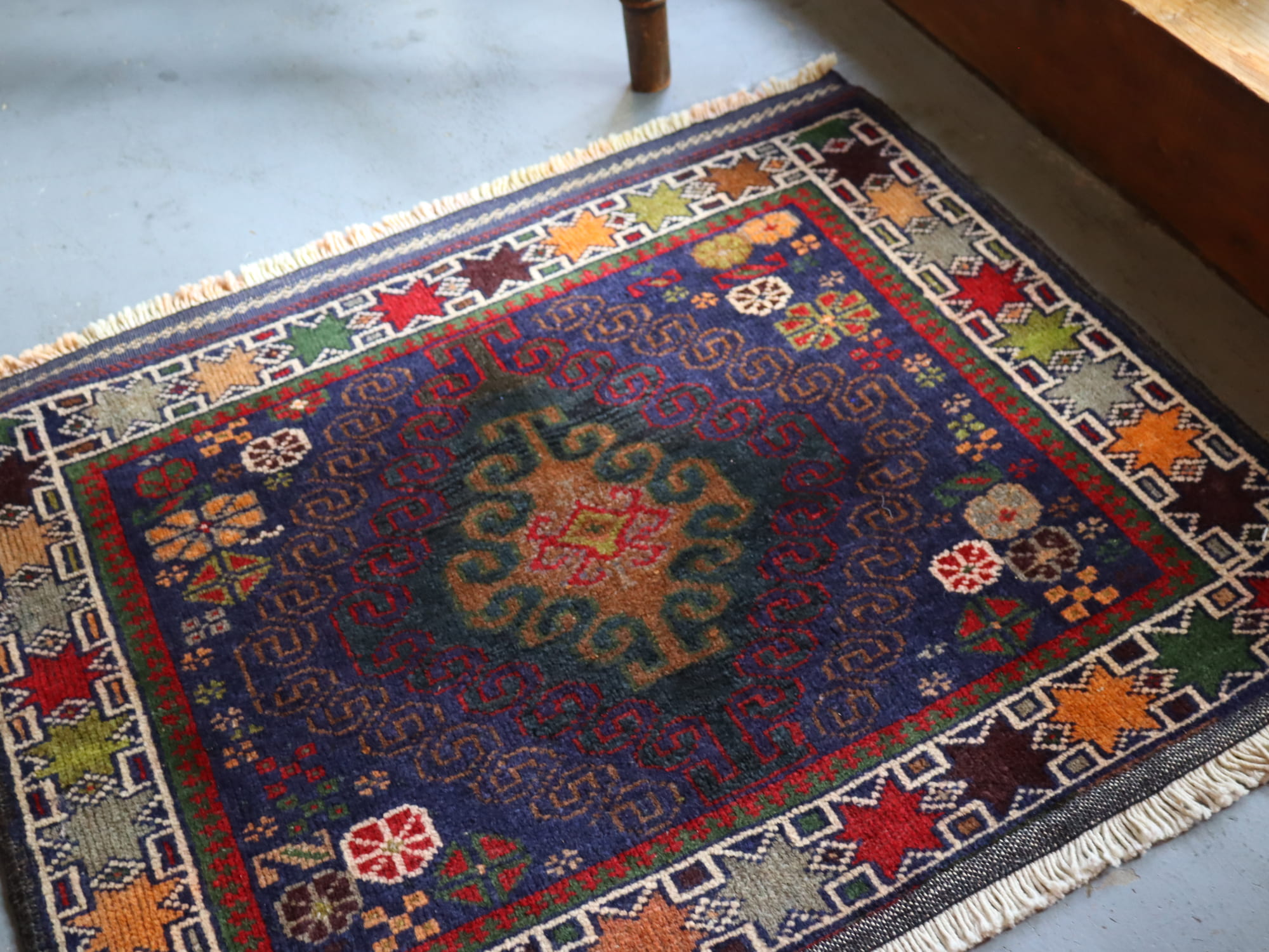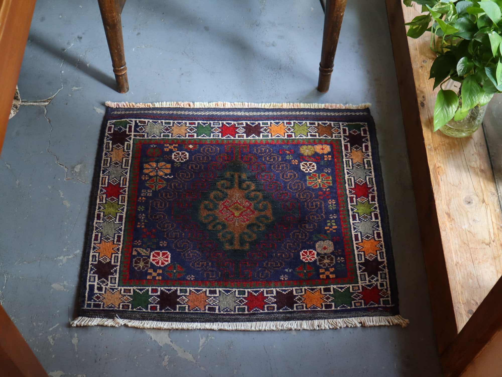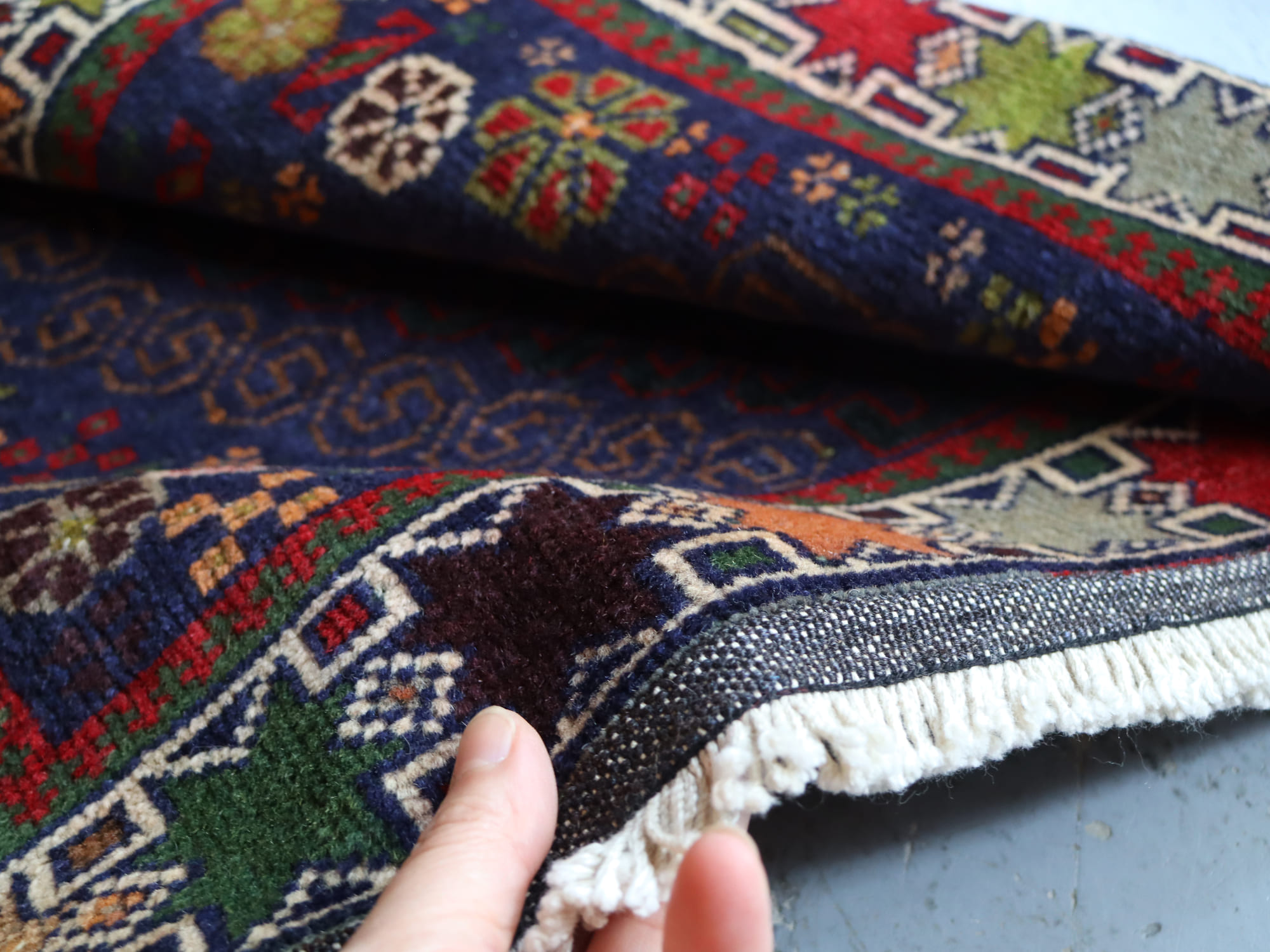 ロバの背に掛けて荷物を運ぶための袋として織られたじゅうたんで、表面のパイル織り部分だけがカットされた小さなピース。