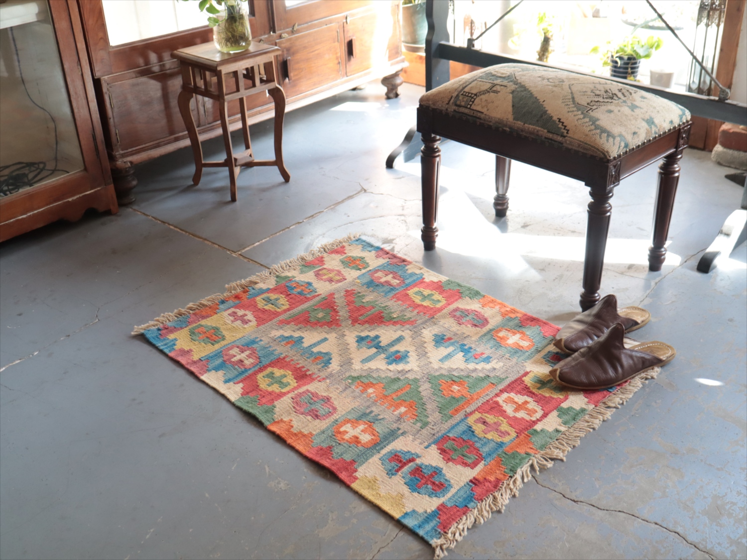 6-7mm程度の厚みがあり、パイル(毛足)がない平織りの敷物で表面は少しザラっとした肌ざわりです。織り手の自由なアイデアでデザインされていますので、左右対象でなかったり、モチーフが少しずれていたりということもありますが、世界で一枚だけの作品ですからその点はご了承ください。