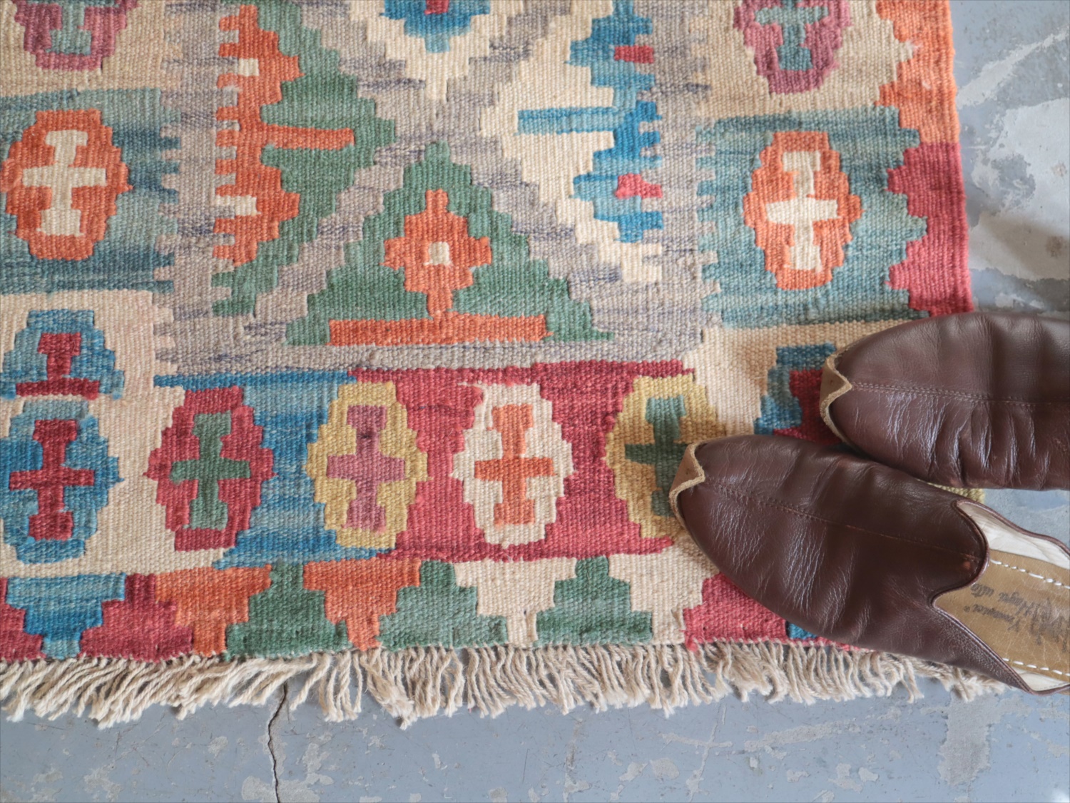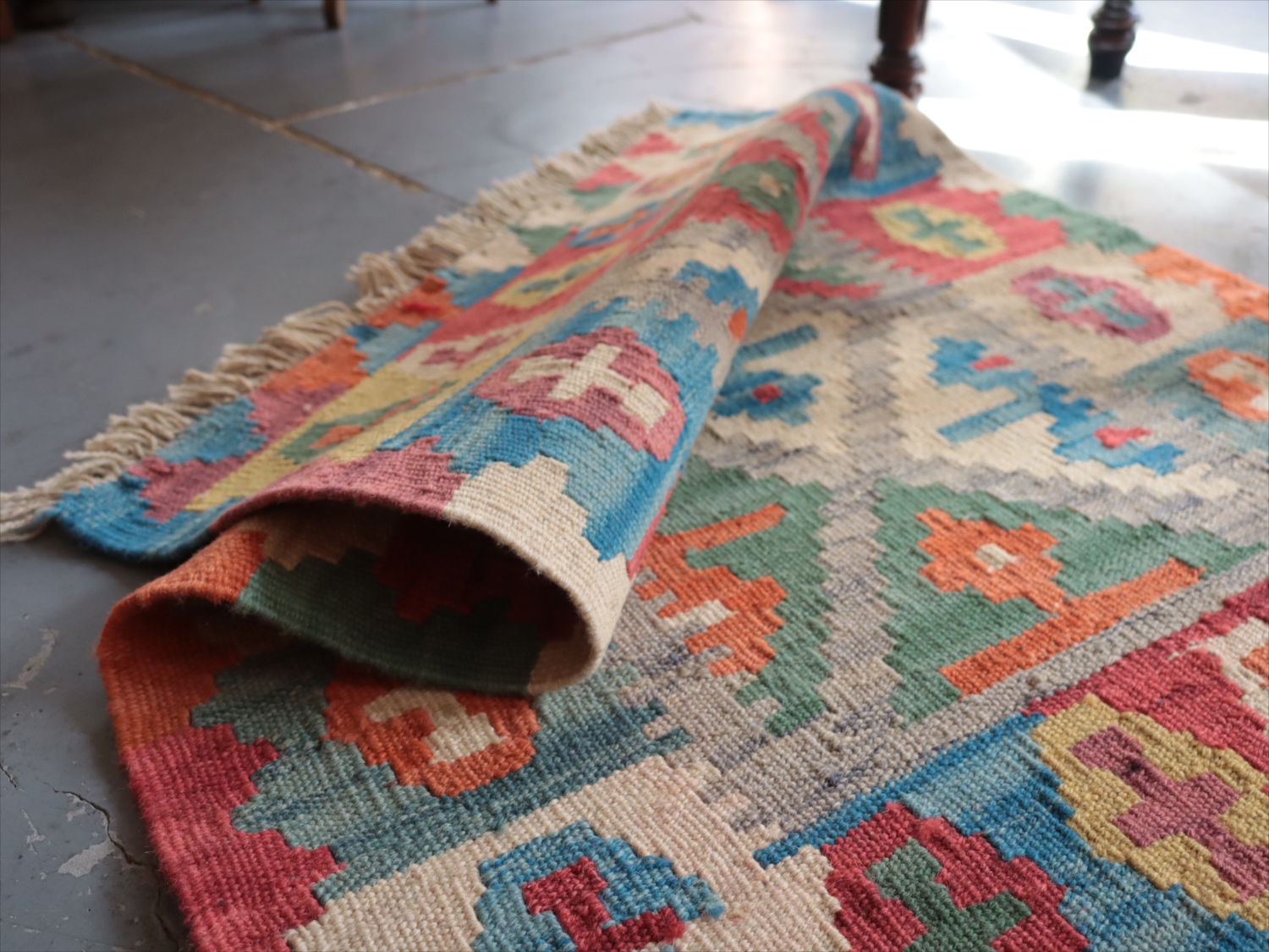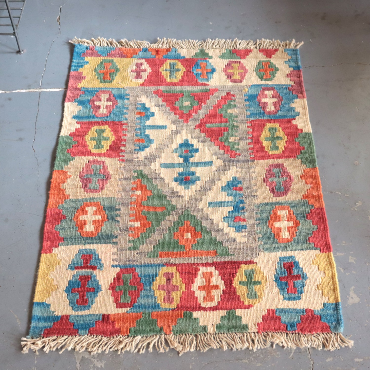 イラン南西部、ザクロス山脈の麓で、現在も遊牧生活を続けるカシュカイ族によって織られたキリム。 明るい色使いとユニークな幾何学模様の組み合が特徴です。