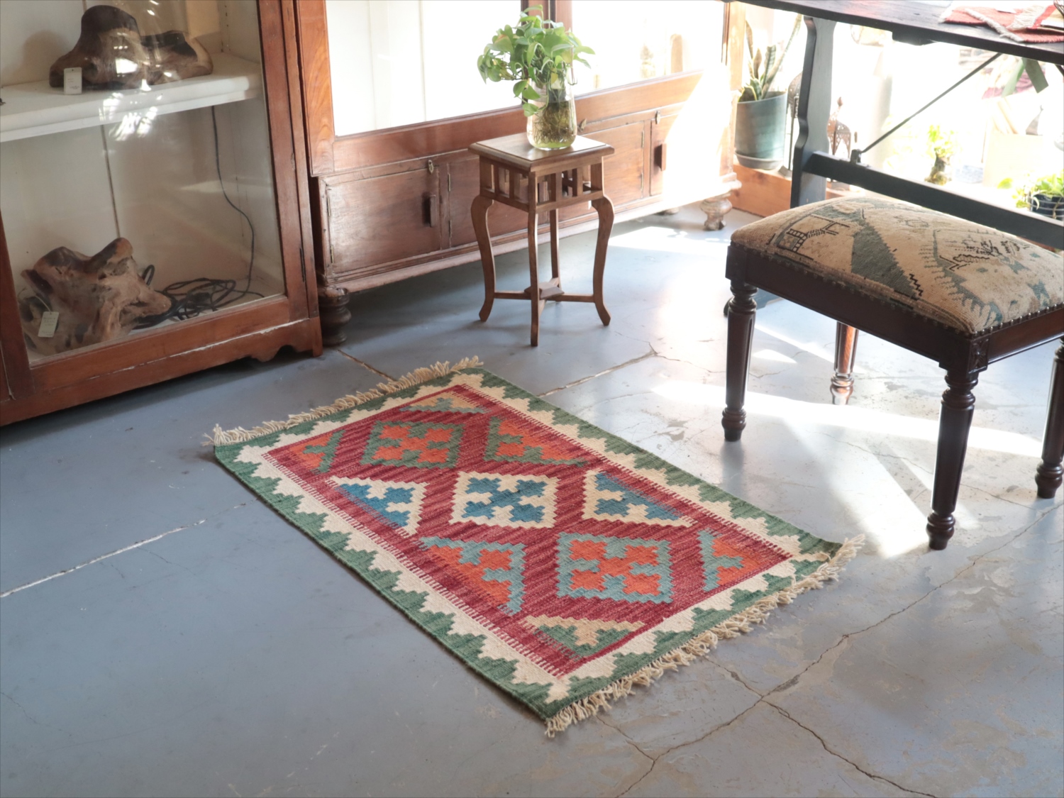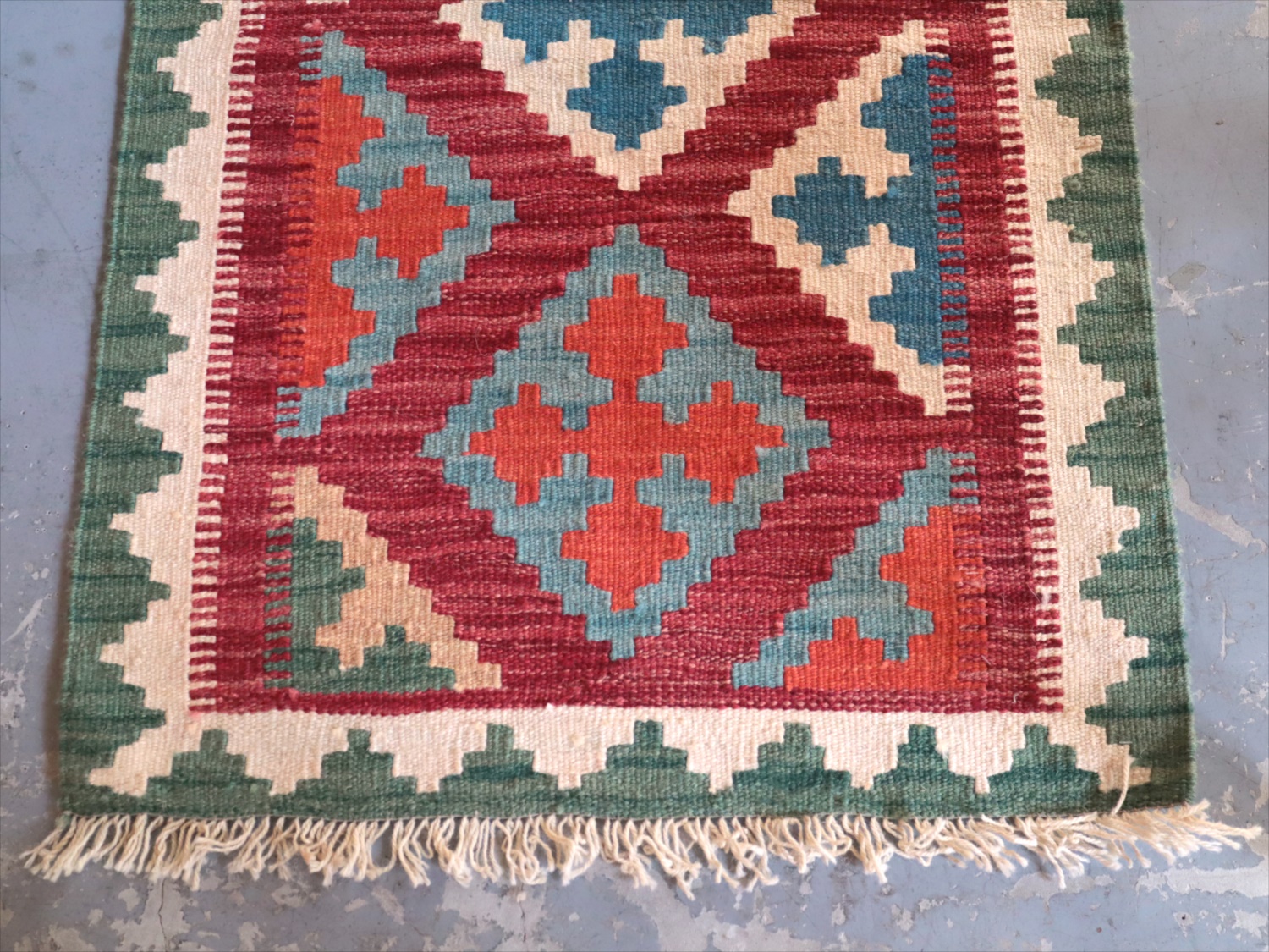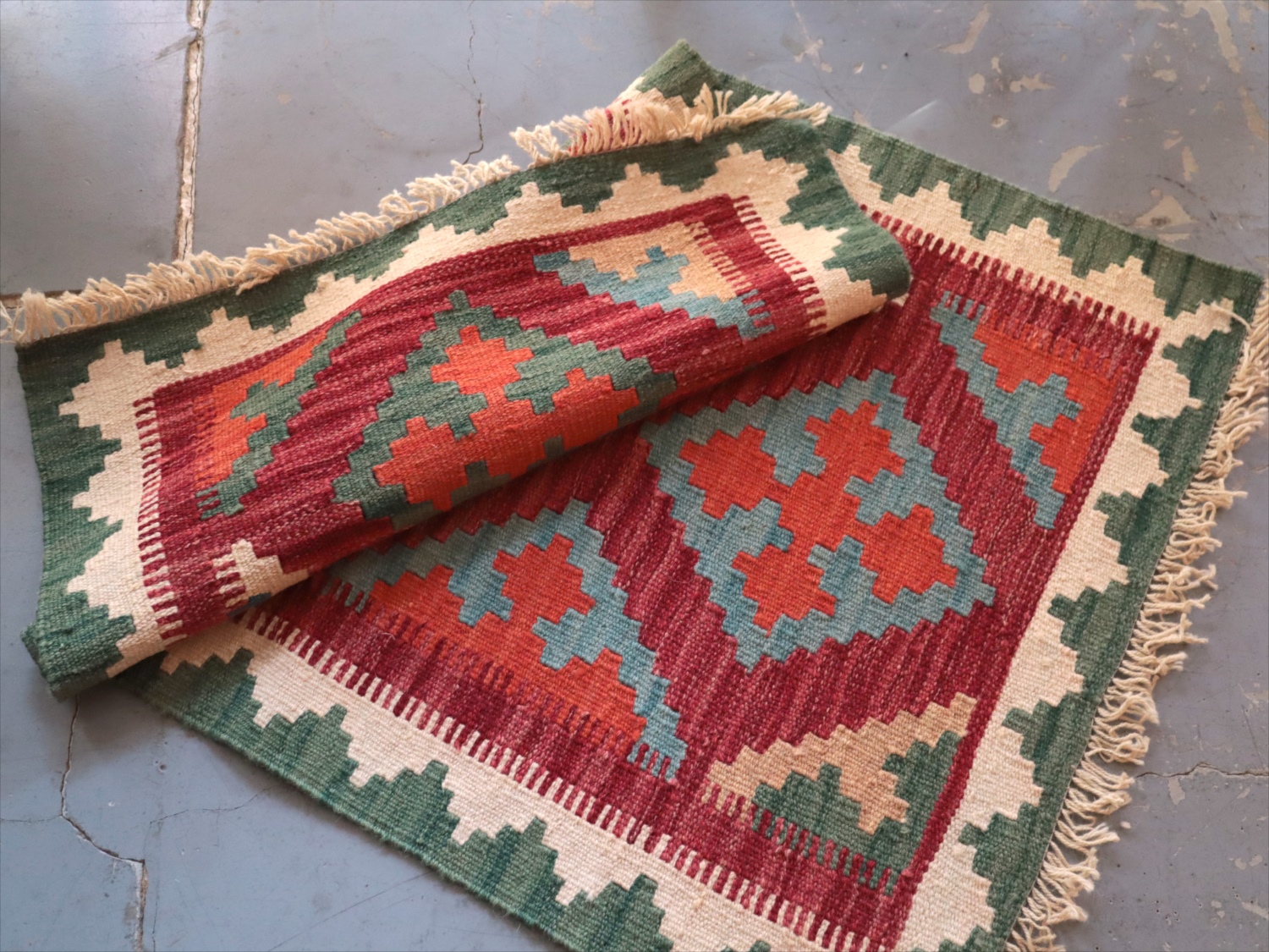 6-7mm程度の厚みがあり、パイル(毛足)がない平織りの敷物で表面は少しザラっとした肌ざわりです。織り手の自由なアイデアでデザインされていますので、左右対象でなかったり、モチーフが少しずれていたりということもありますが、世界で一枚だけの作品ですからその点はご了承ください。