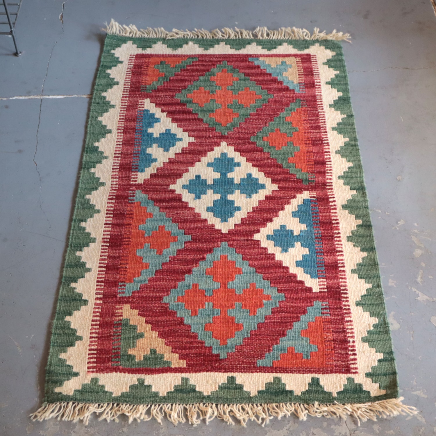 イラン南西部、ザクロス山脈の麓で、現在も遊牧生活を続けるカシュカイ族によって織られたキリム。 明るい色使いとユニークな幾何学模様の組み合が特徴です。