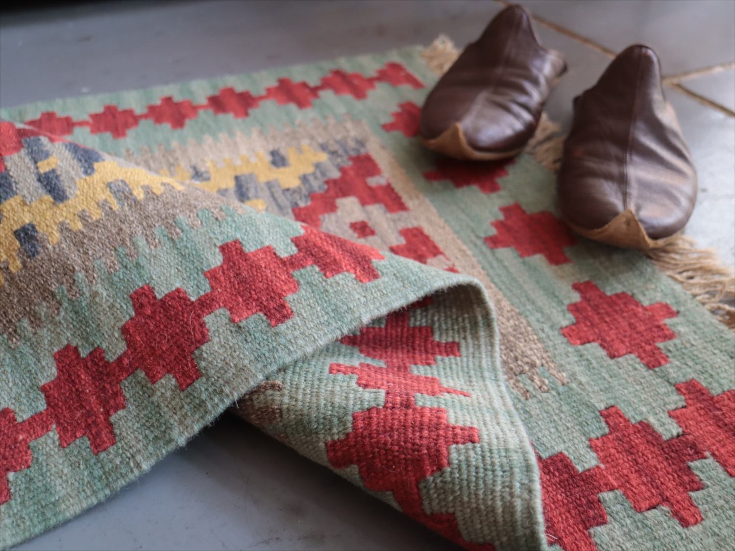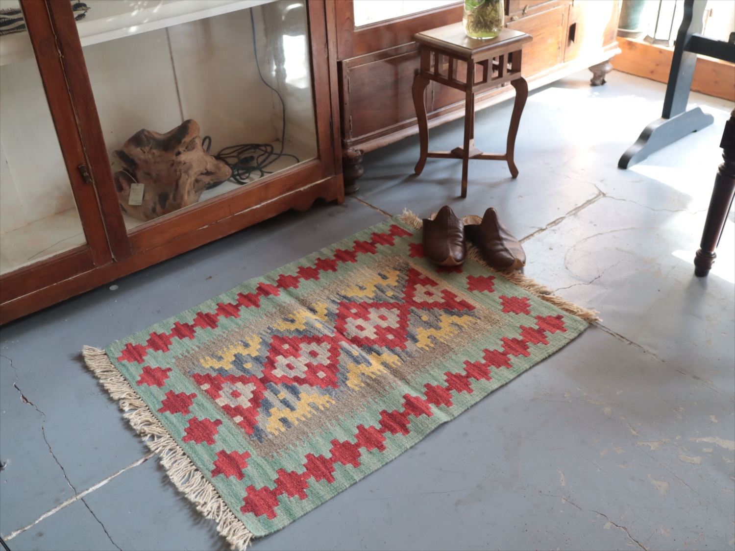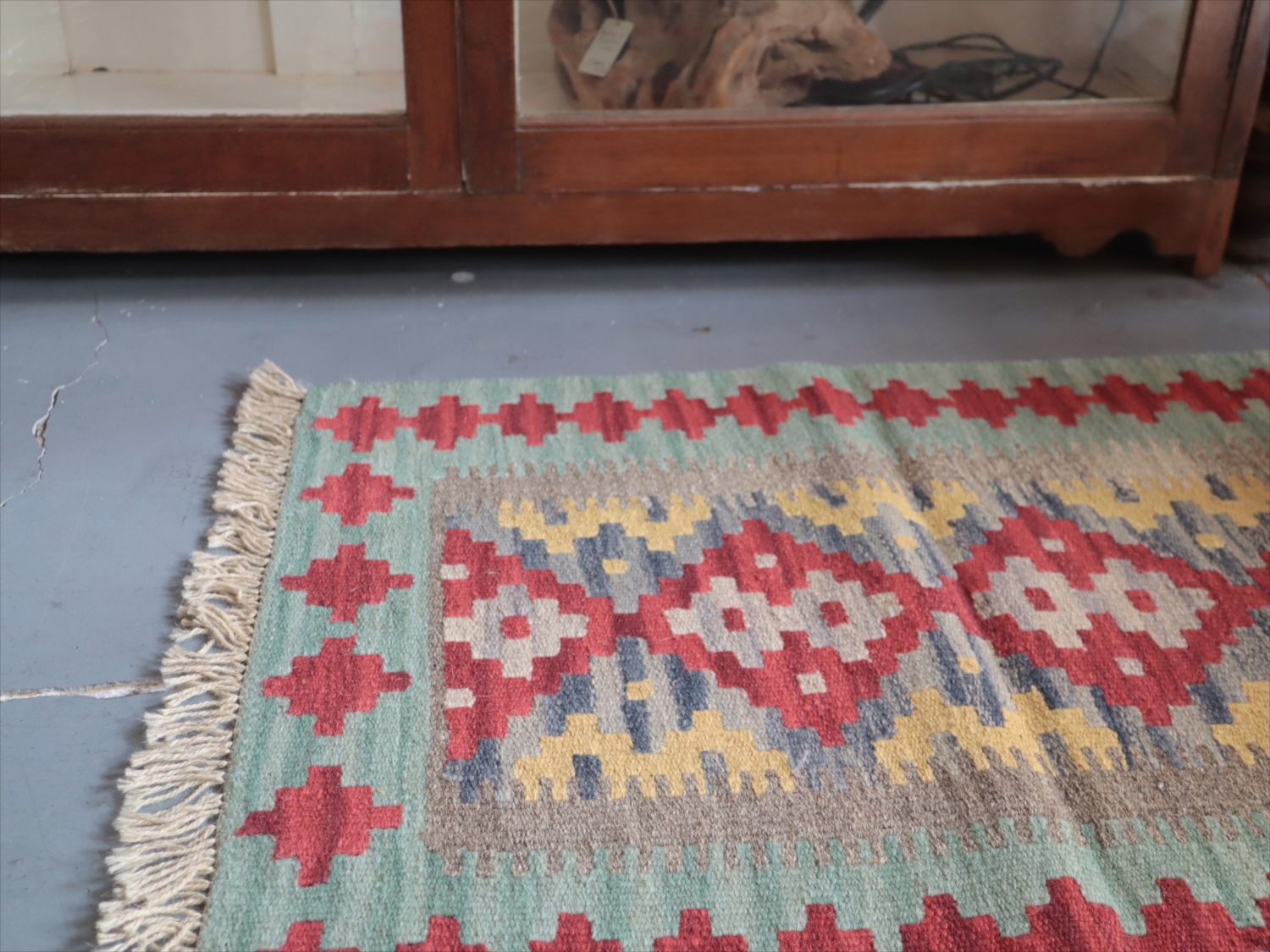 6-7mm程度の厚みがあり、パイル(毛足)がない平織りの敷物で表面は少しザラっとした肌ざわりです。織り手の自由なアイデアでデザインされていますので、左右対象でなかったり、モチーフが少しずれていたりということもありますが、世界で一枚だけの作品ですからその点はご了承ください。