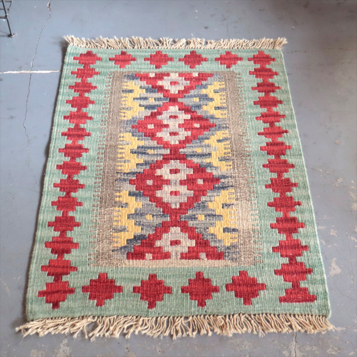 イラン南西部、ザクロス山脈の麓で、現在も遊牧生活を続けるカシュカイ族によって織られたキリム。 明るい色使いとユニークな幾何学模様の組み合が特徴です。